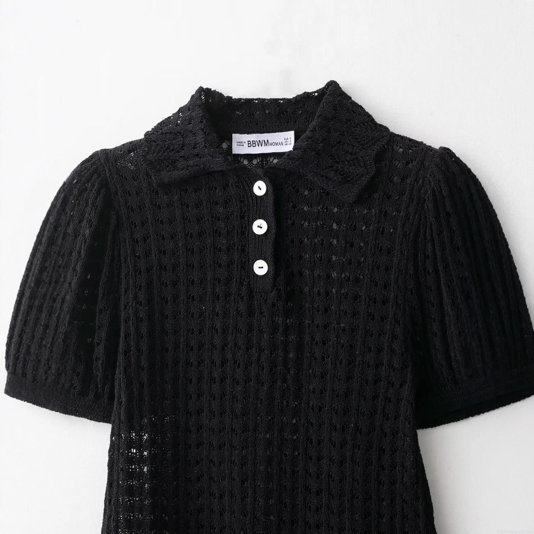 Solid Color, Puff Sleeves, Polo Collar, Hollow Design, Openwork Crochet Texture, White Pearl Buttons