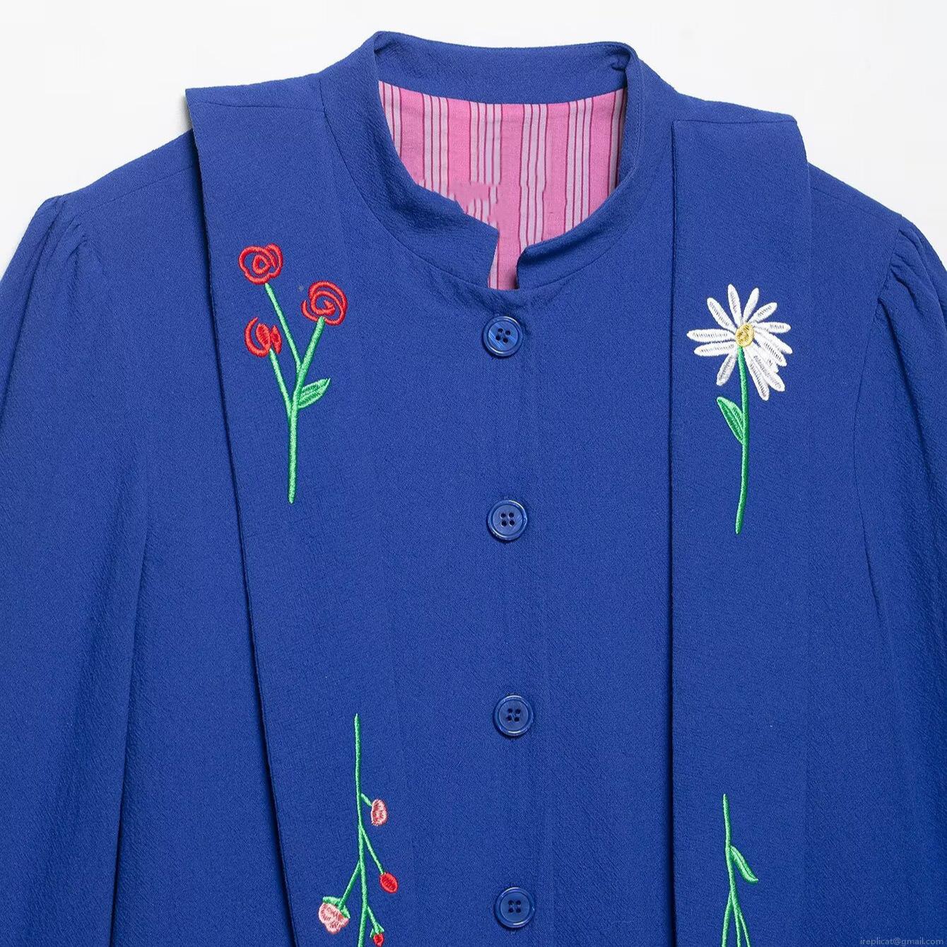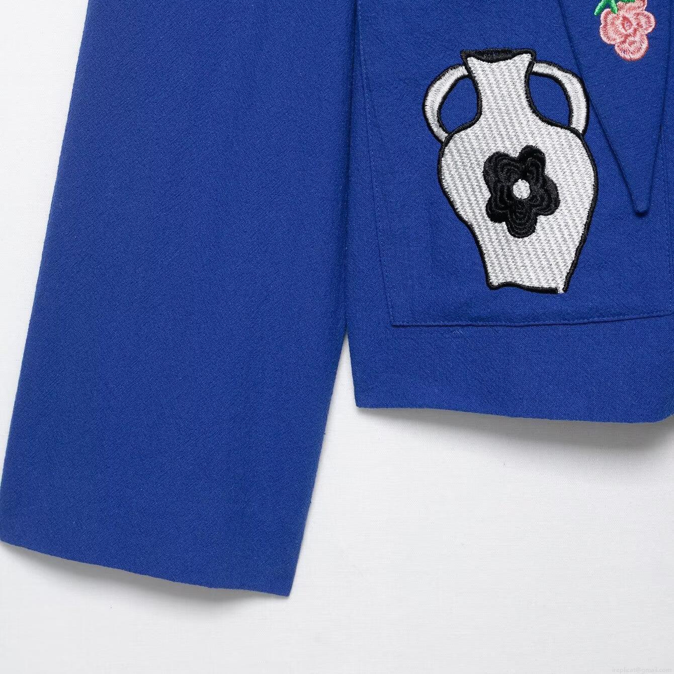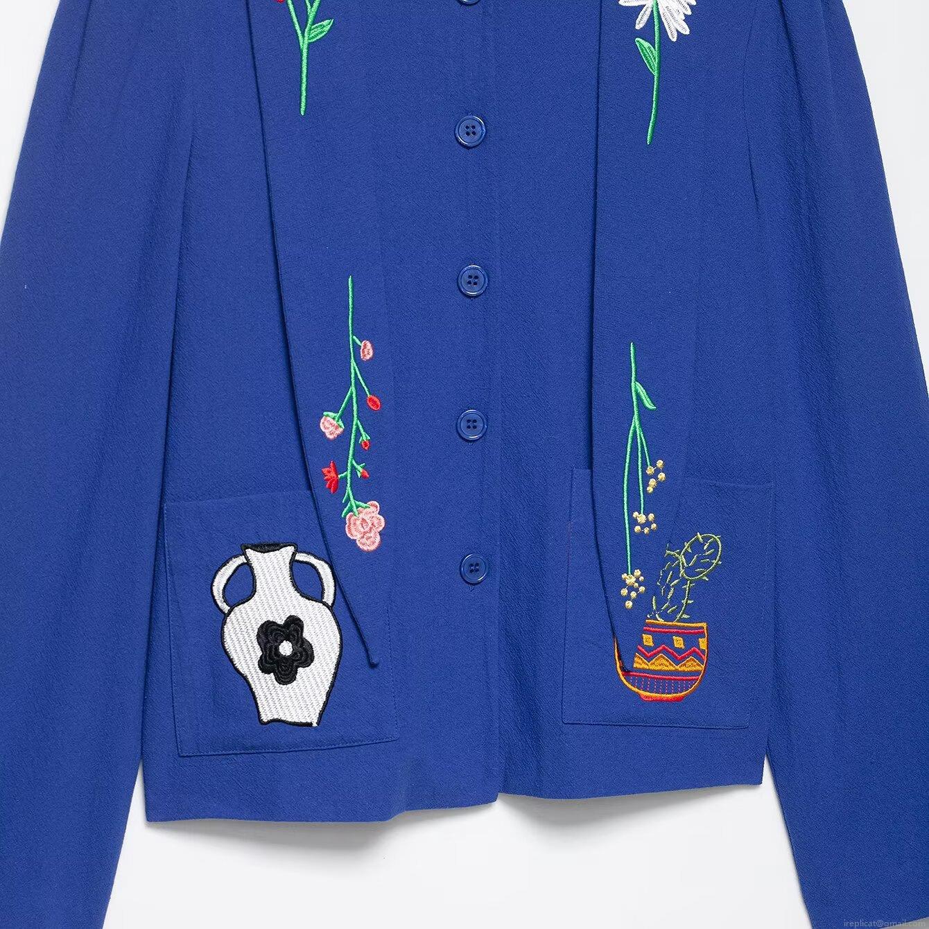Women's Klein Blue Embroidered Jacket 100% Polyester Casual Long Sleeve Button Down Coat Floral Cactus Embroidery Elegant Outerwear For Women