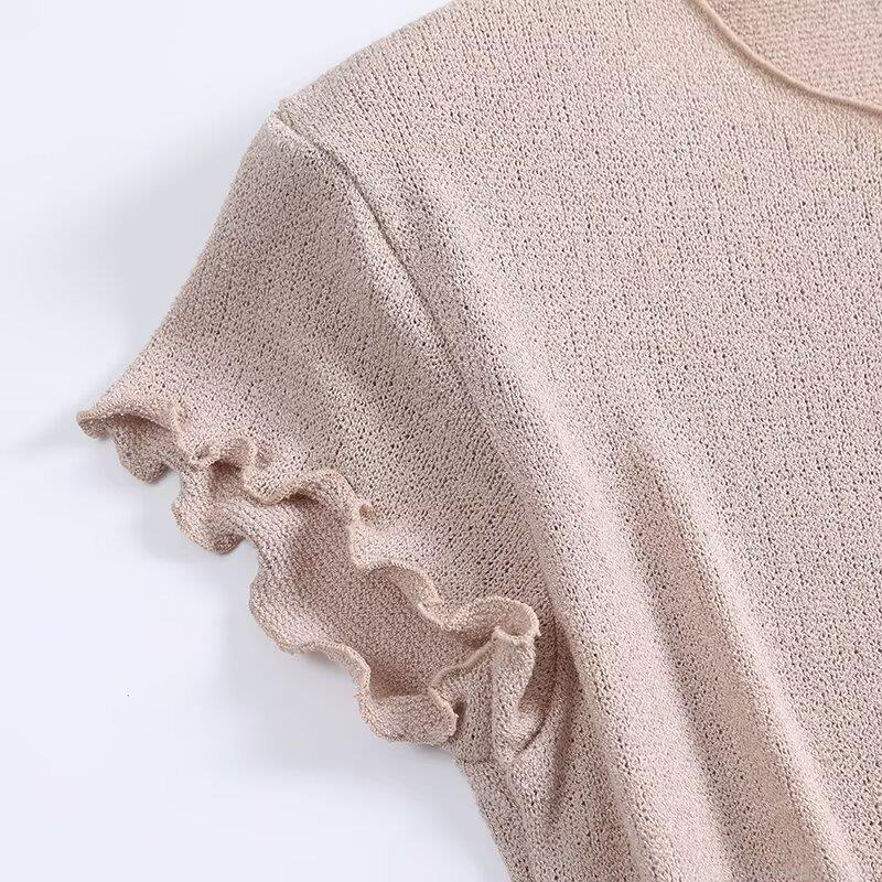 Women's Knit Short Sleeve T-Shirt Rayon Polyester Lettuce Trim Ruffle Cuff Round Neck Slim Ribbed Top Minimalist Casual Summer Blouse For Daily Office Wear