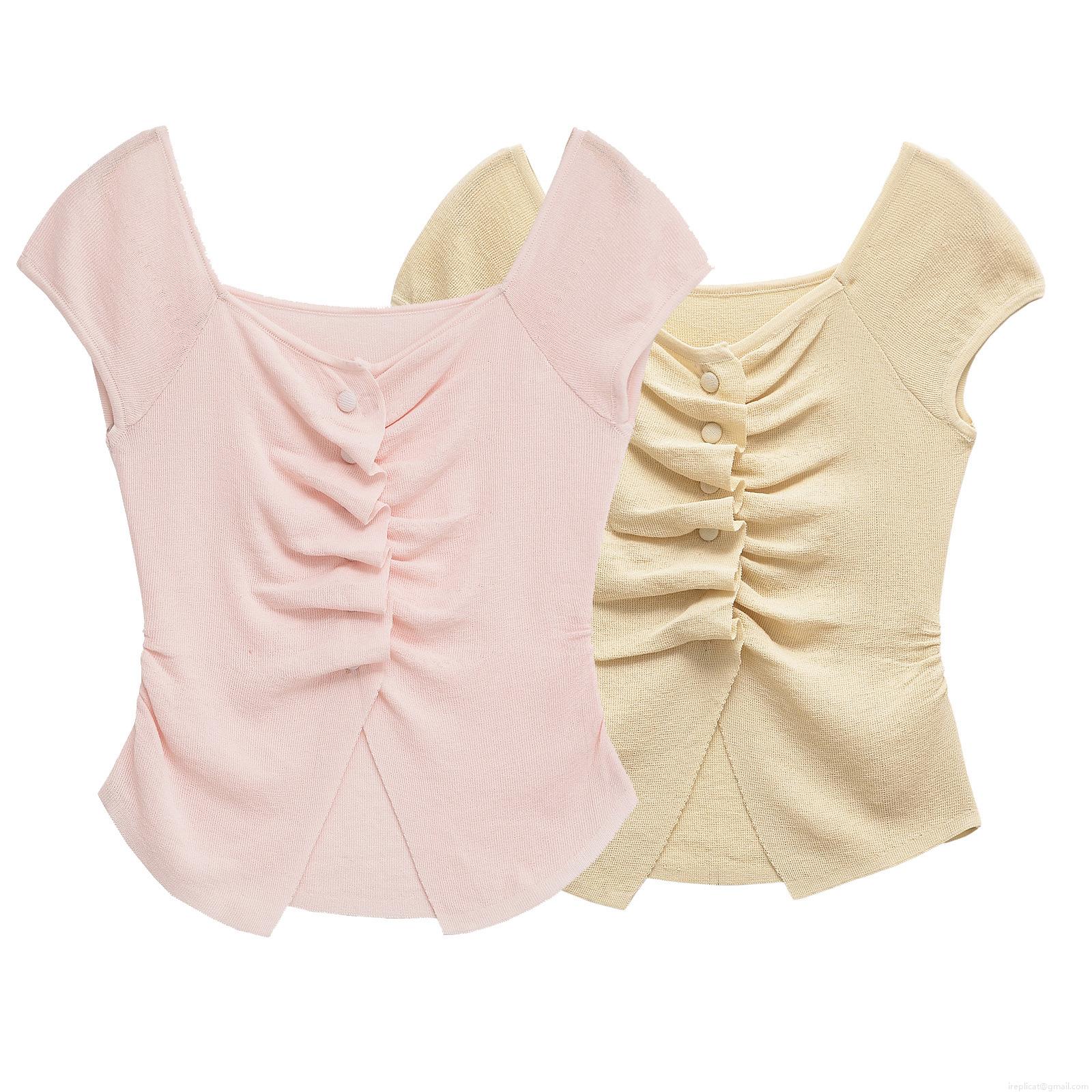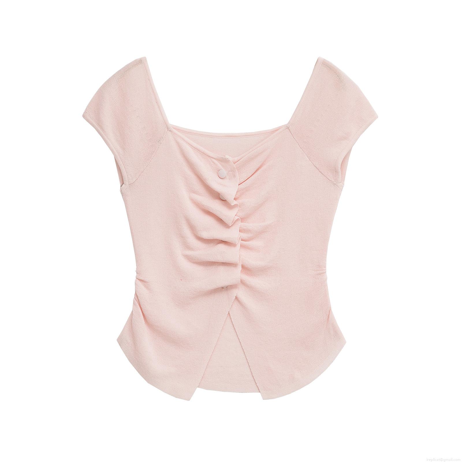 Women's Knit T-Shirt Slim Fit Short Sleeve V-Neck Pleated Button Decor Polyester Knitted Top Chic Streetwear Casual Summer Blouse For Women