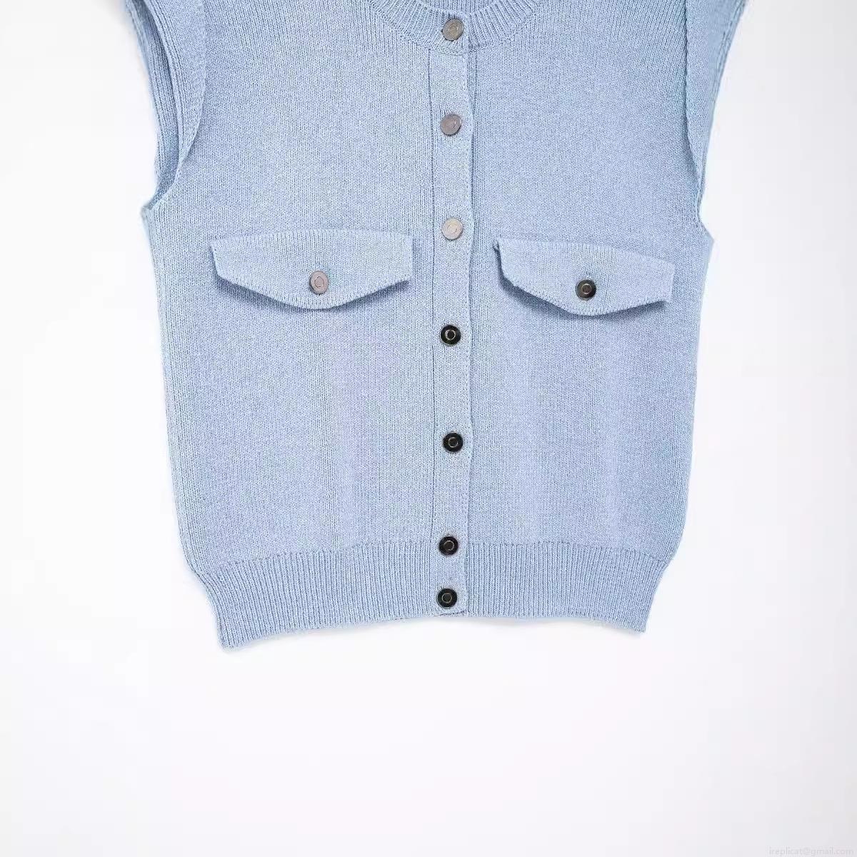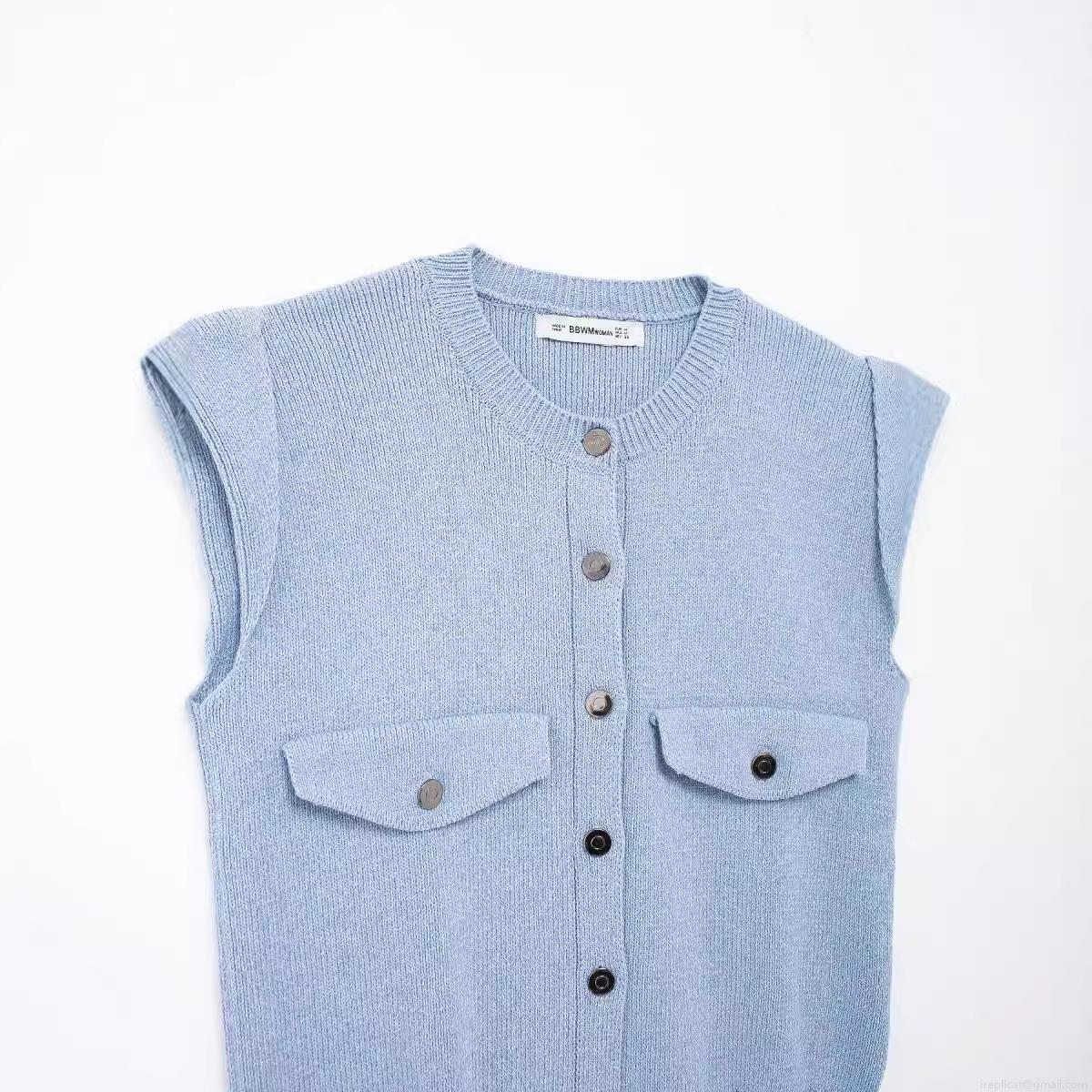 Women's Knit Vest Sky Blue Single Breasted Sleeveless Sweater Top With Pockets Vintage Round Neck Casual Loose Knitwear For Lady