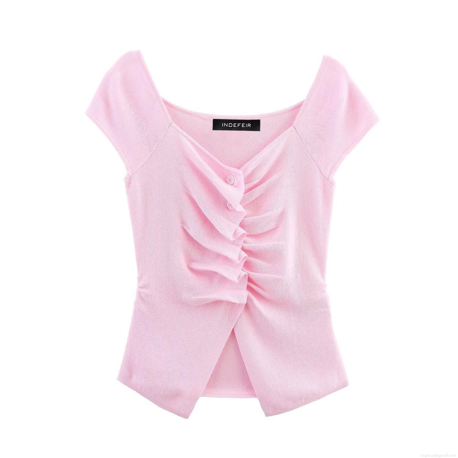 Women's Knitted Polyester Short Sleeve Top Slim Fit V-Neck Ruched Detail Ruffle Solid Color Sweet Style Shirt For Daily Dating