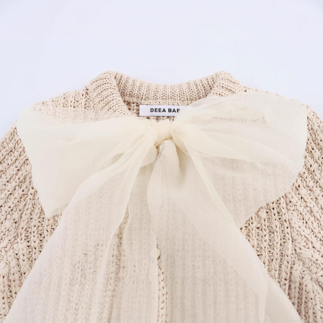 Women's Knitted Polyester Short Sleeve T-Shirt With Large White Organza Bow Decoration Round Neck Off-White Elegant Pullover Top For Summer Party Streetwear