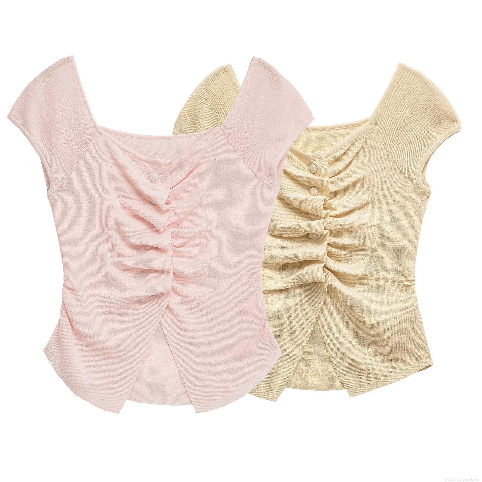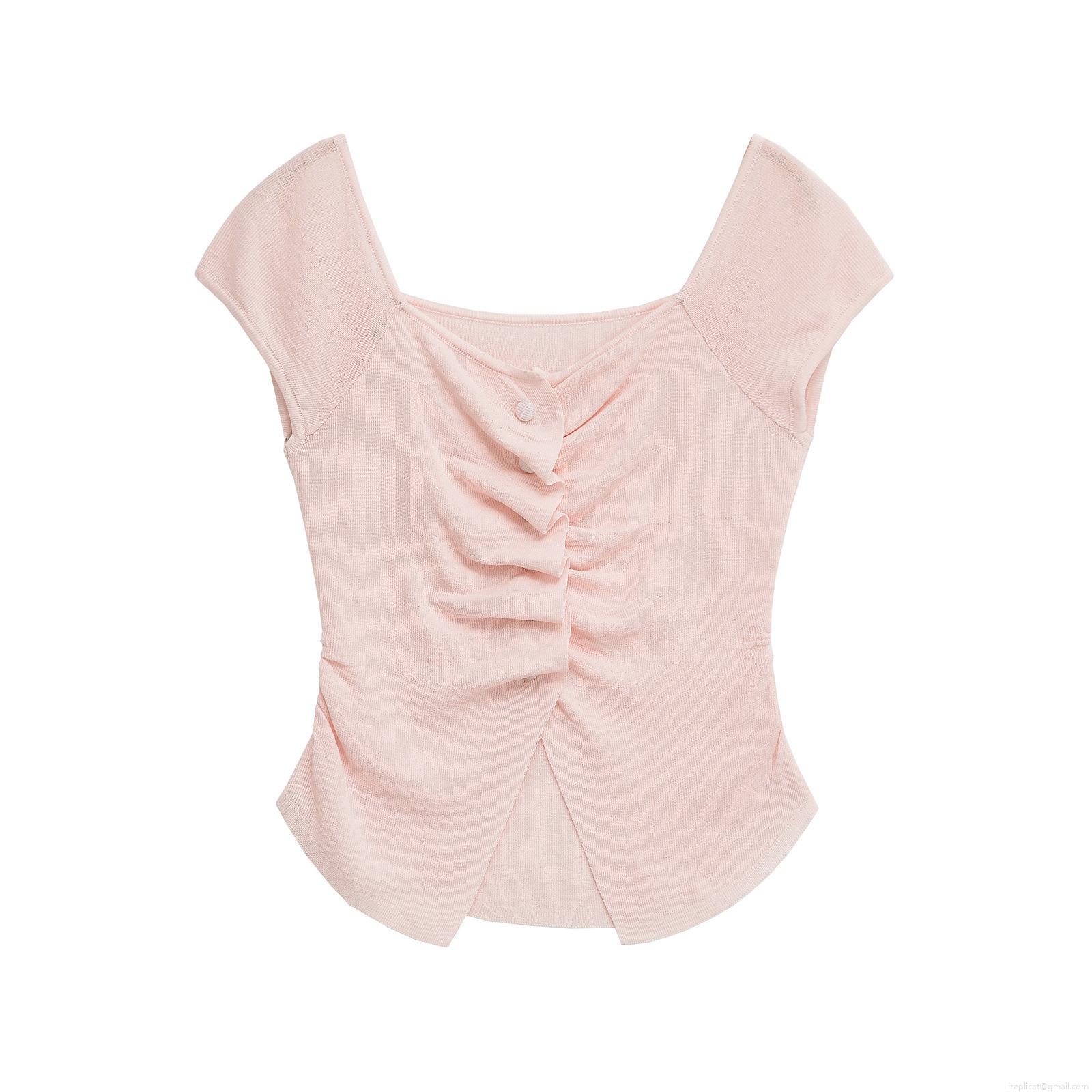 Women's Knitted Ruched T-Shirt Short Sleeve Square Neck Top Decorative Buttons Slim Fit Casual Streetwear Blouse For Women