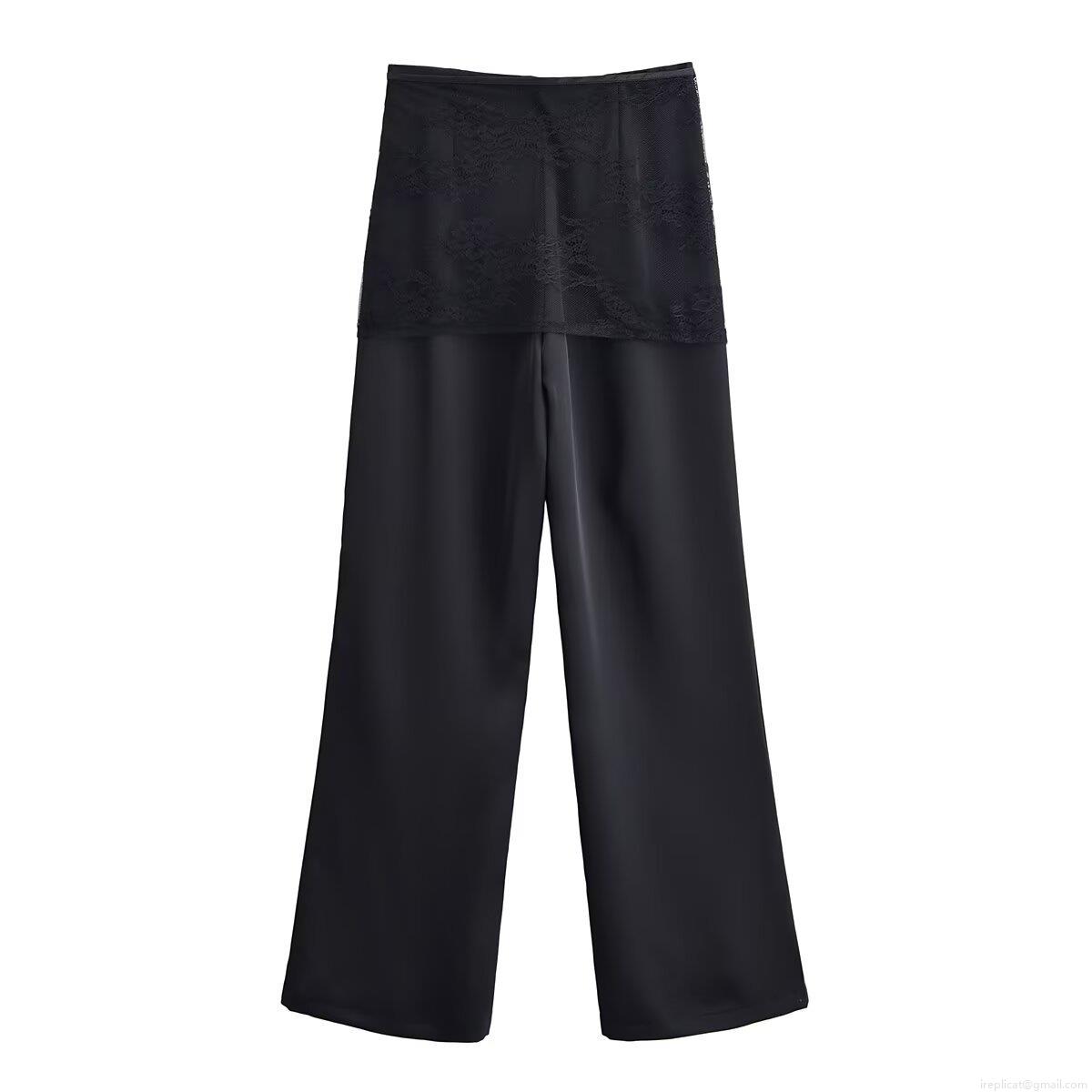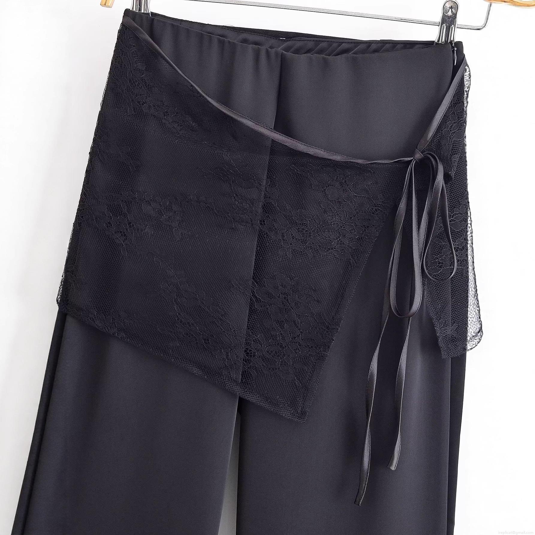 Women's Lace Splicing Wide Leg Pants Casual High Waist Drawstring Trousers Street Style Flowy Black Pants With Satin Ribbon Decoration