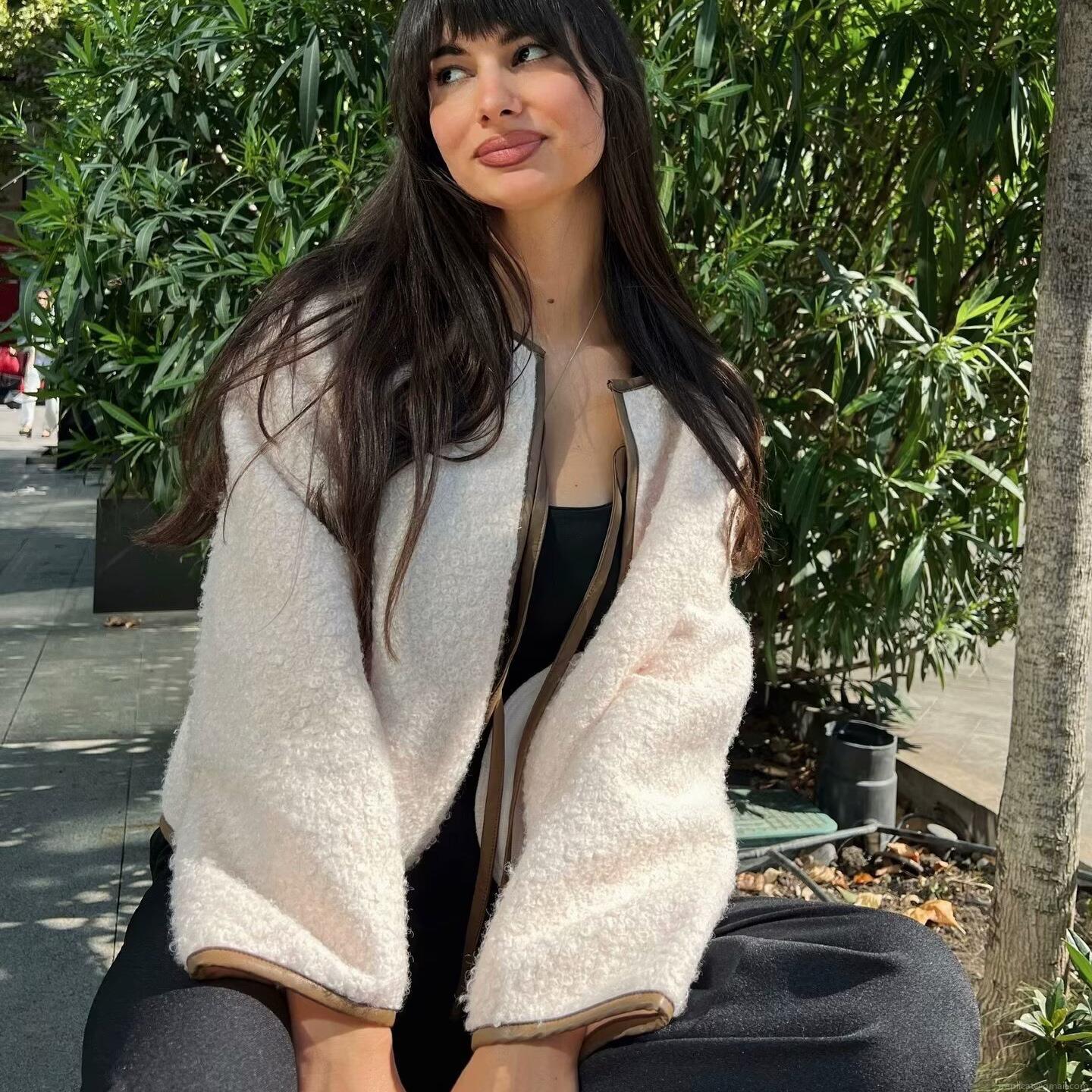 Women French Vintage Boucle Sherpa Jacket Solid Color Stand Collar...