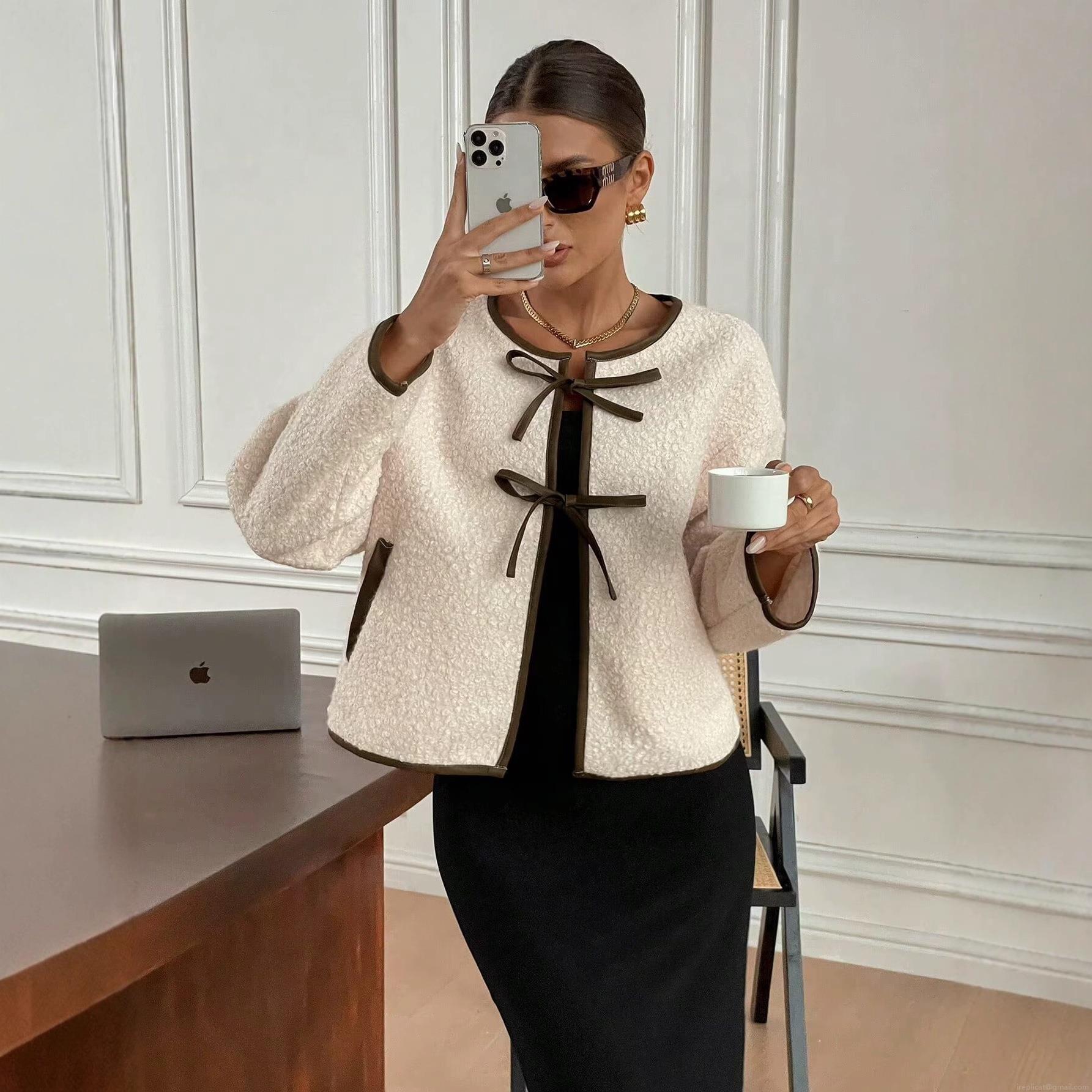 Women's Lamb Wool Coat Contrast Leather Piping Bow Tie Round Neck Loose Short Jacket For Winter Autumn Elegant Commute Sweet Lady Outerwear
