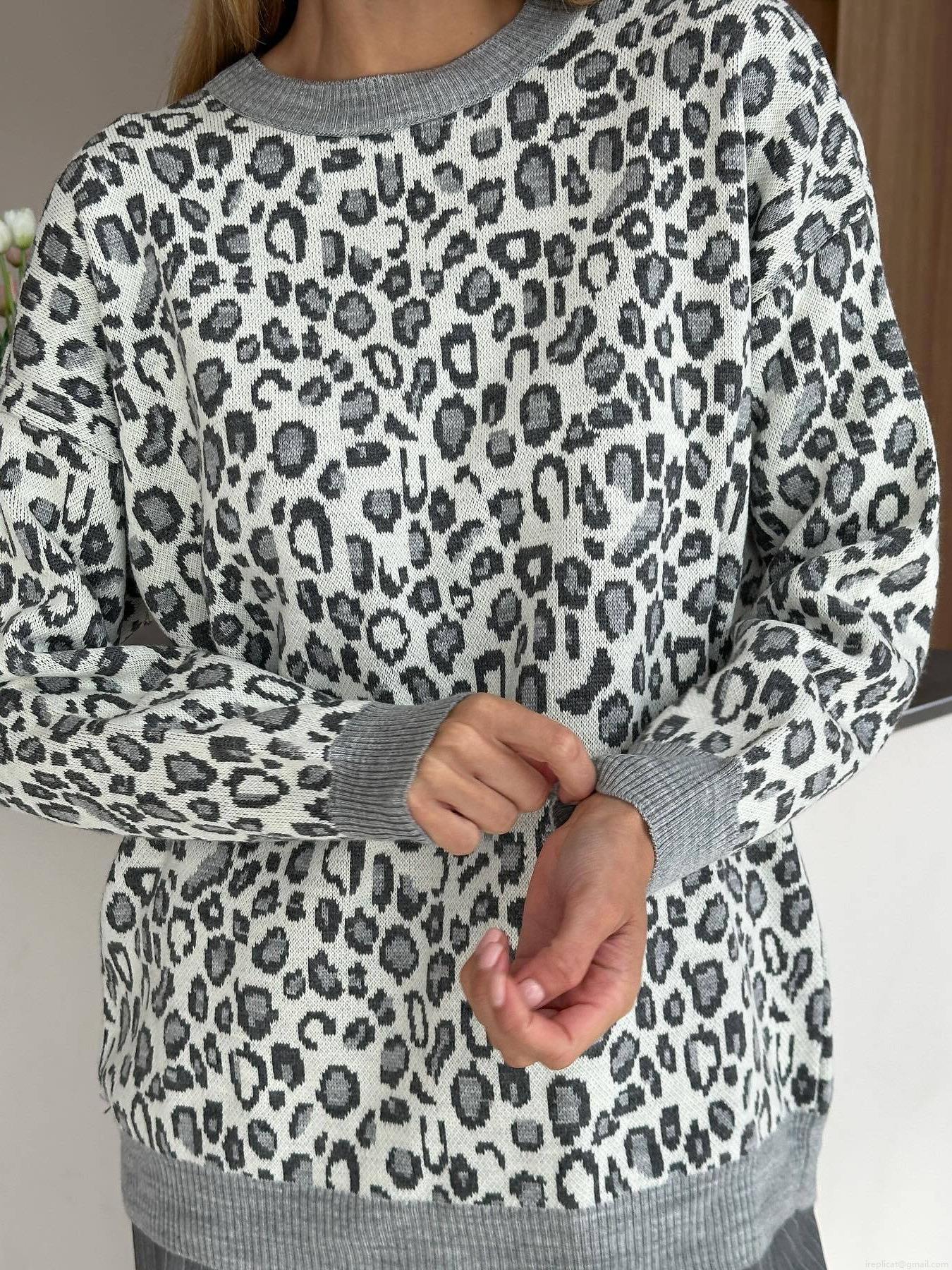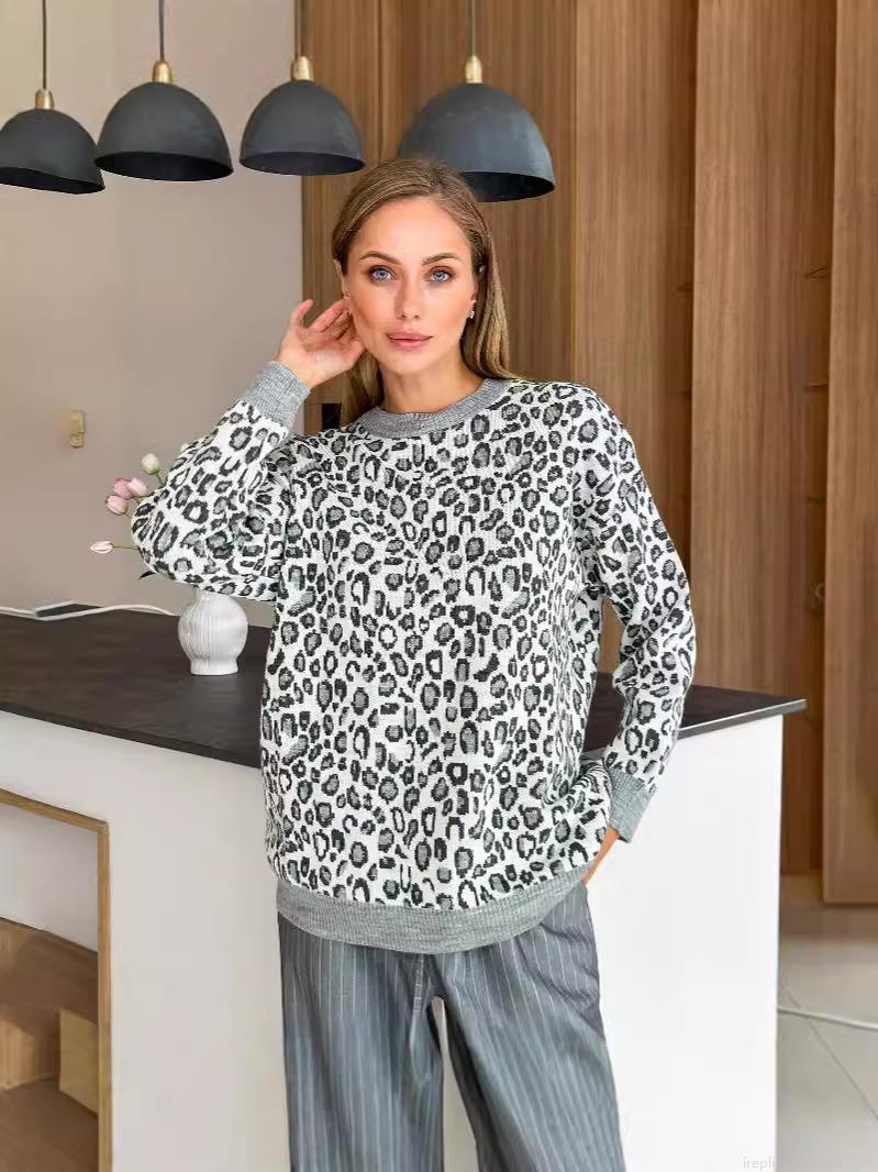 Women's Leopard Print Crewneck Knit Sweater Loose Long Sleeve Cotton Blend Pullover Casual Streetwear Jumper Tops