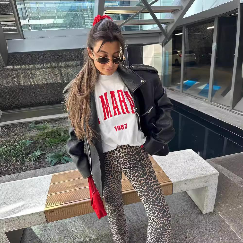 Women's Leopard Print Straight Leg Pants High Waist Polyester Streetwear Casual Long Trousers for Summer Spring Fashion Female Bottoms