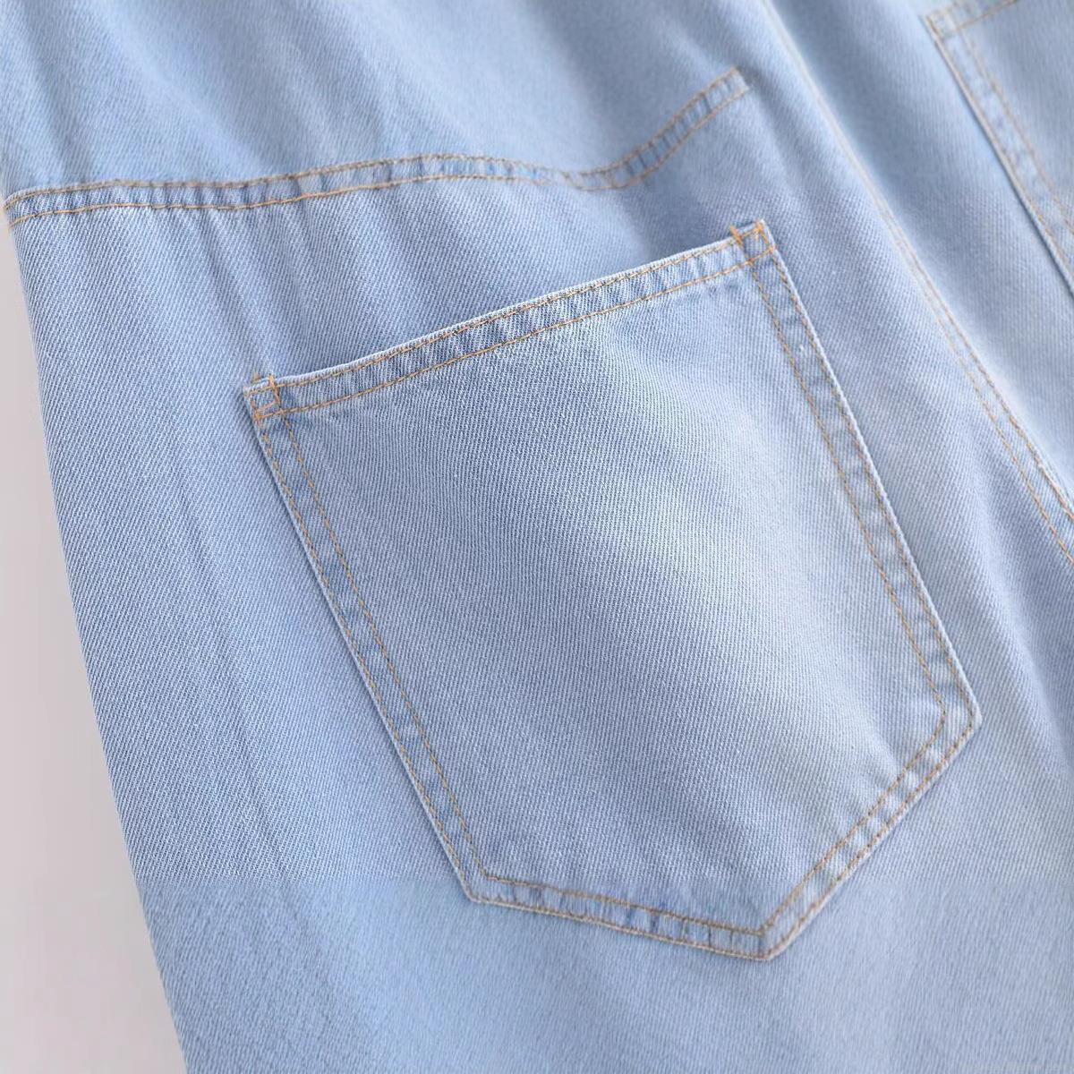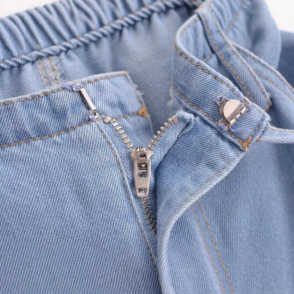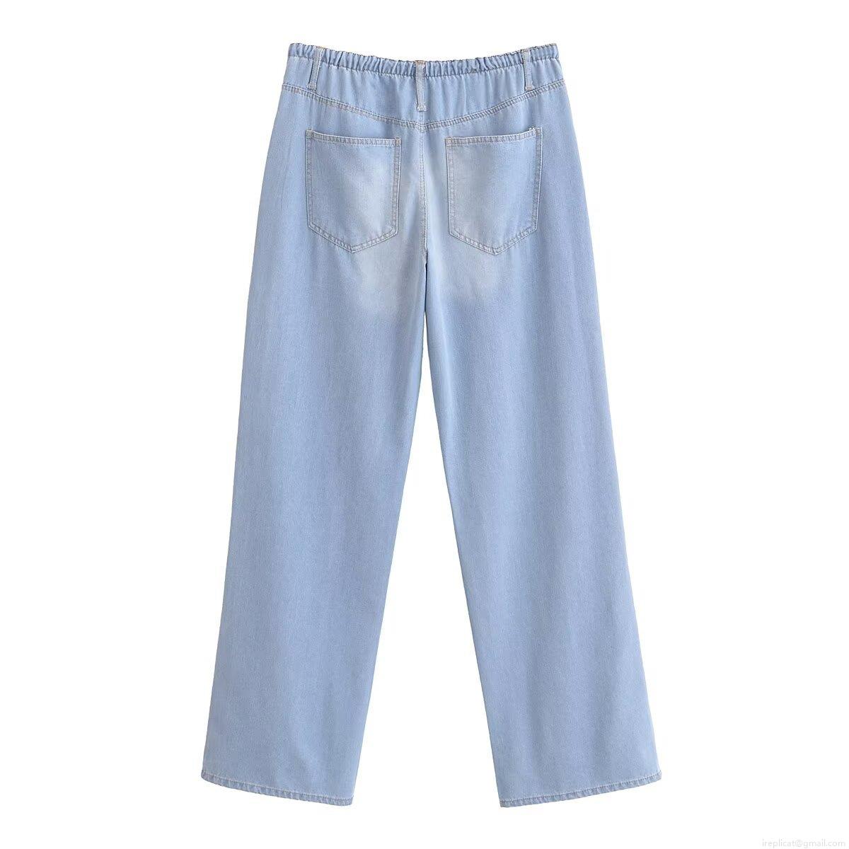 Women's Light Blue Straight Leg Jeans Casual Drawstring Elastic Waist Polyester Denim Patchwork Loose Fit Trousers For Streetwear Summer