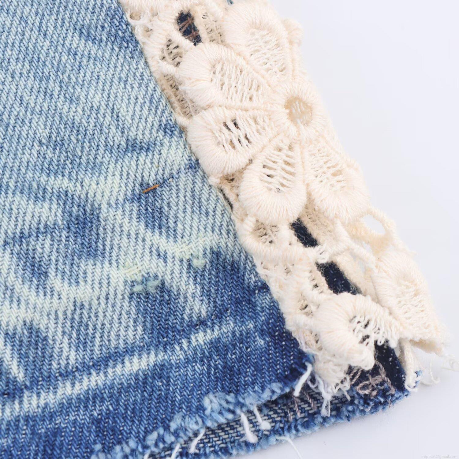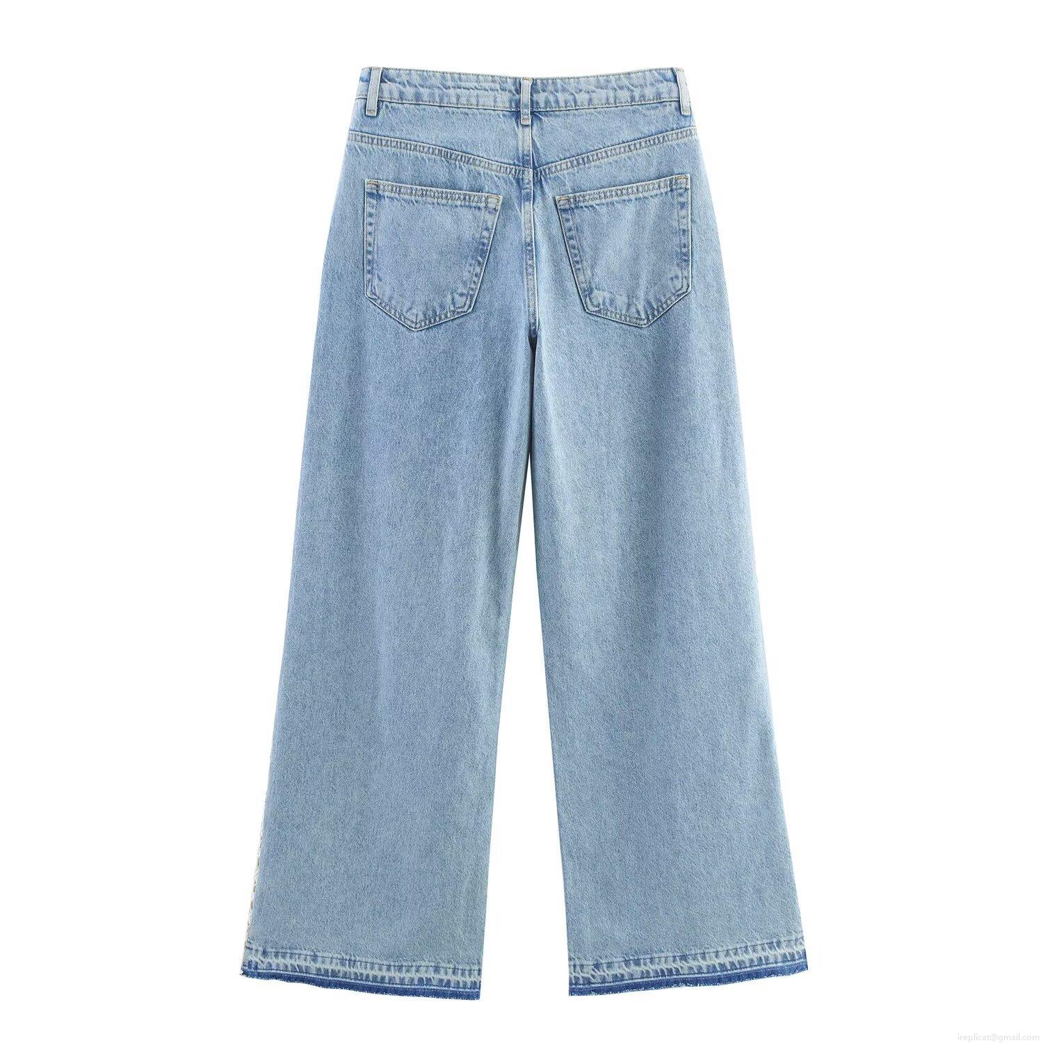 Women's Light Blue Wide Leg Denim Pants With White Lace Side Patchwork Hollow Out Decoration High Waist Western Streetwear Style Long Jeans For Lady Casual Party Wear