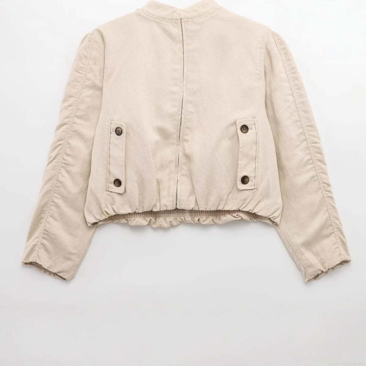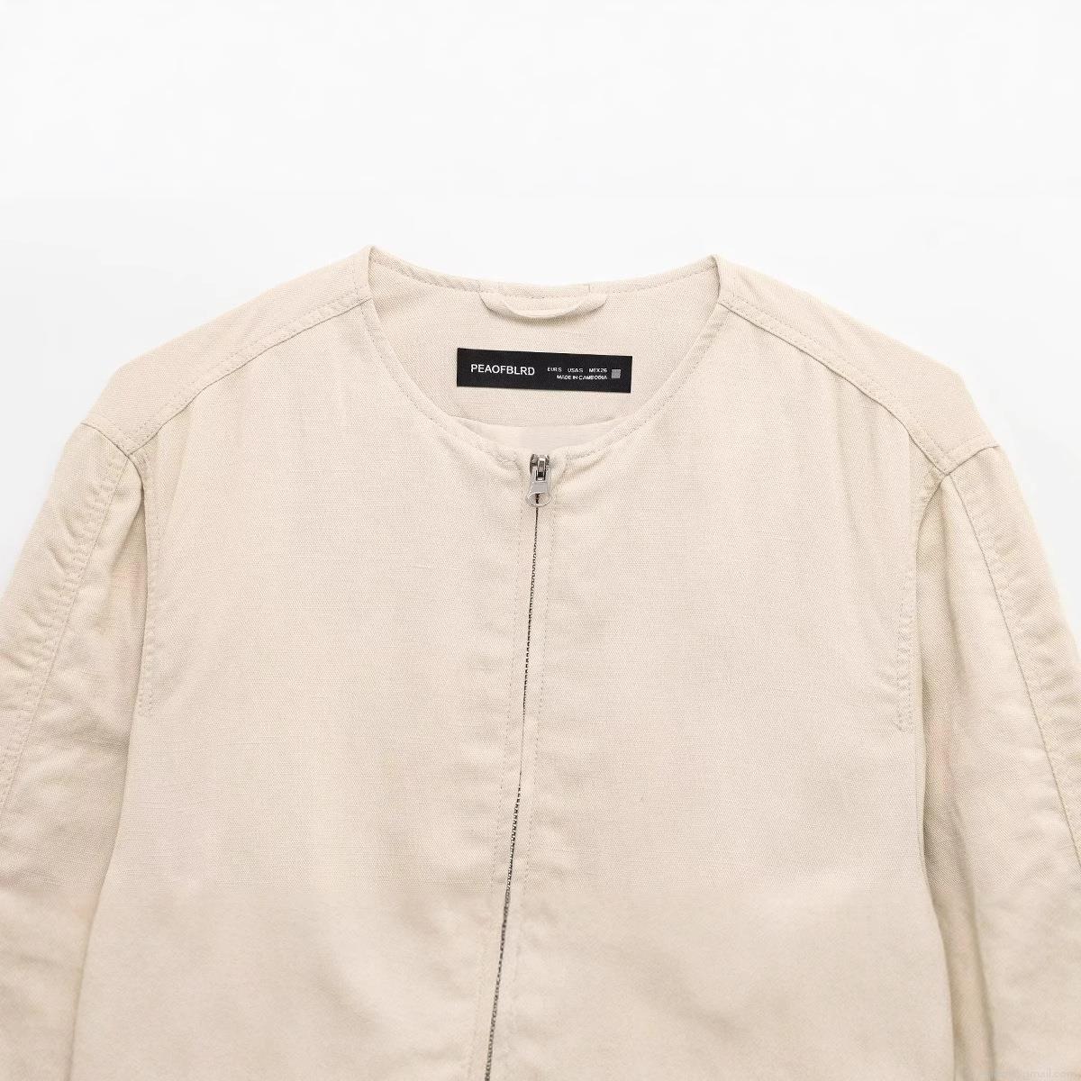 Women's Linen Blend Short Bomber Jacket Casual Lightweight Zipper Up Outerwear Solid Color Lapel Long Sleeve Coat With Pockets For Women