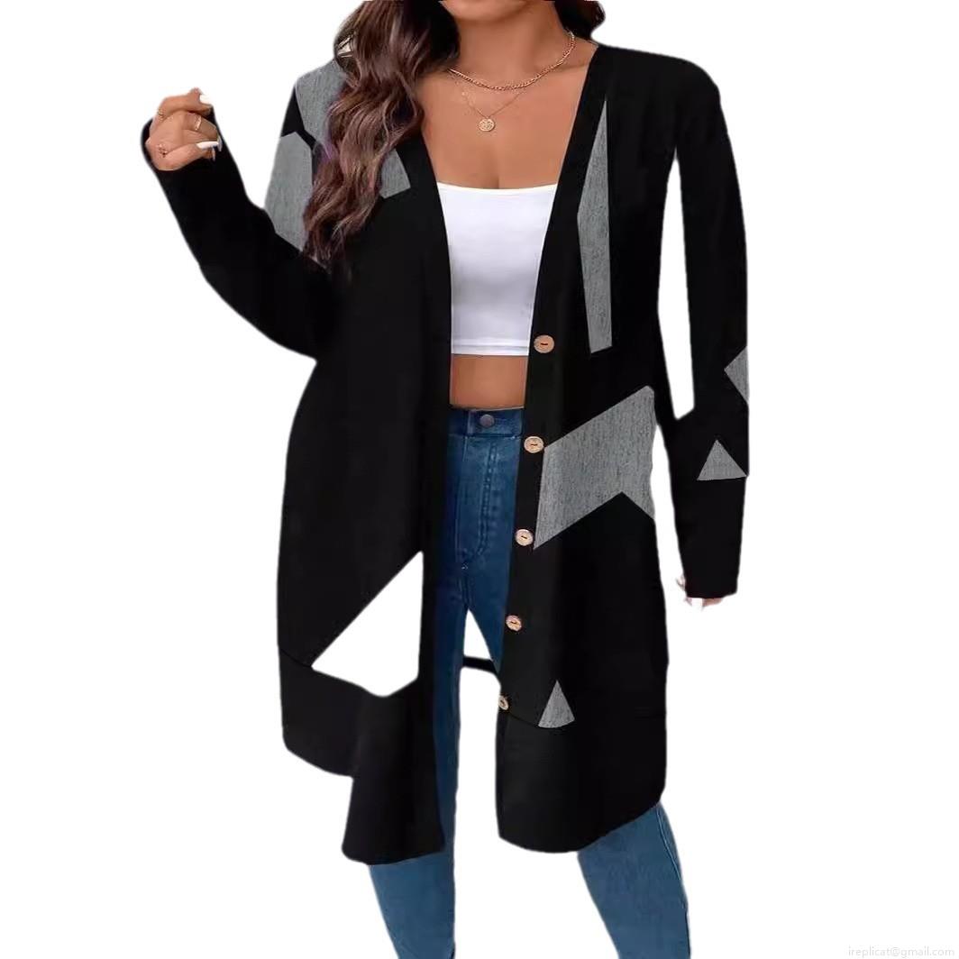 Women's Long Knit Cardigan Coat Polyester Spandex Geometric Star Print Button Down Casual Loose Fit Open Front Sweater For Autumn Winter