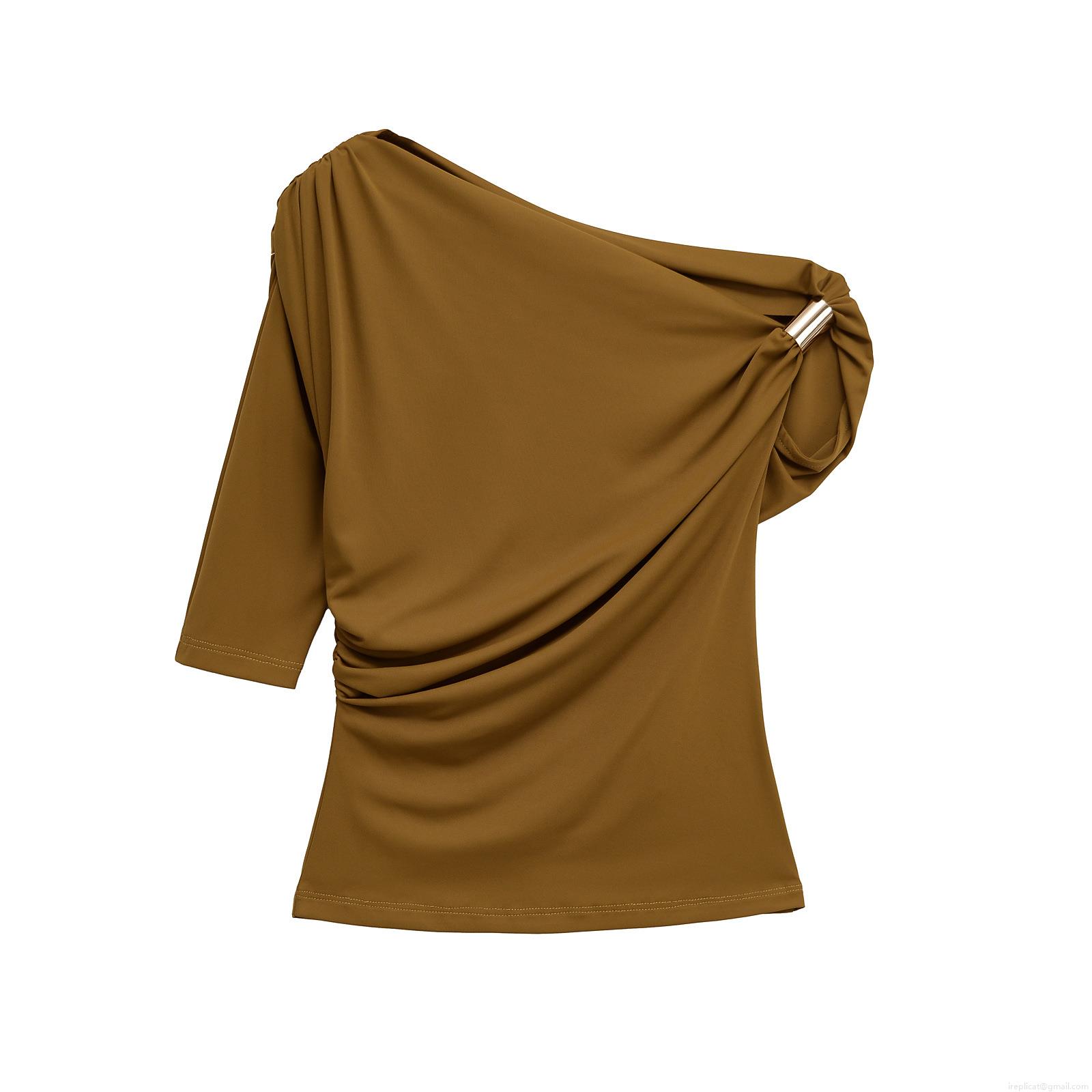 Solid Color, Metal Ring, Pleating Technique, Sloping Shoulder Design, Asymmetrical Folds