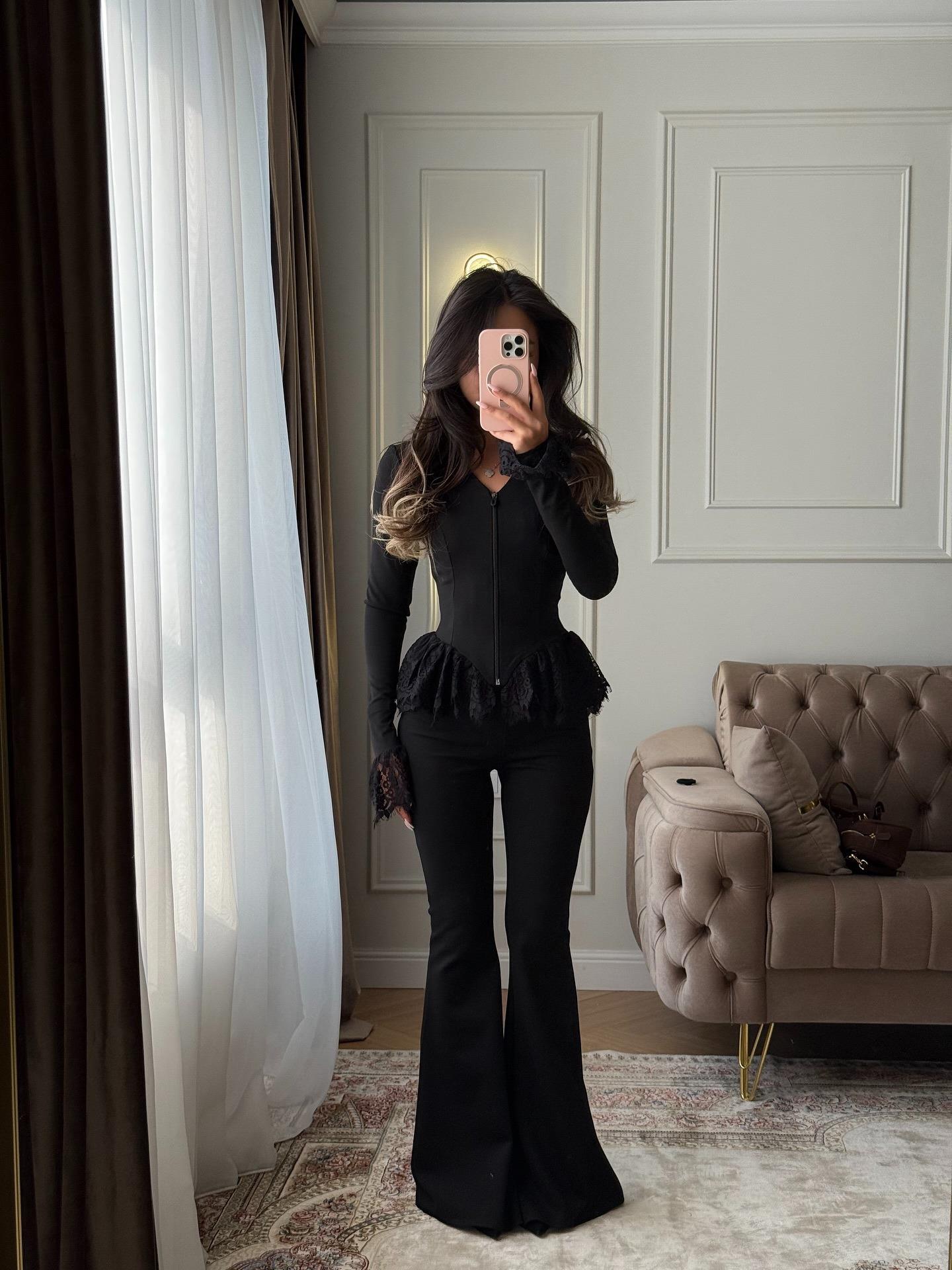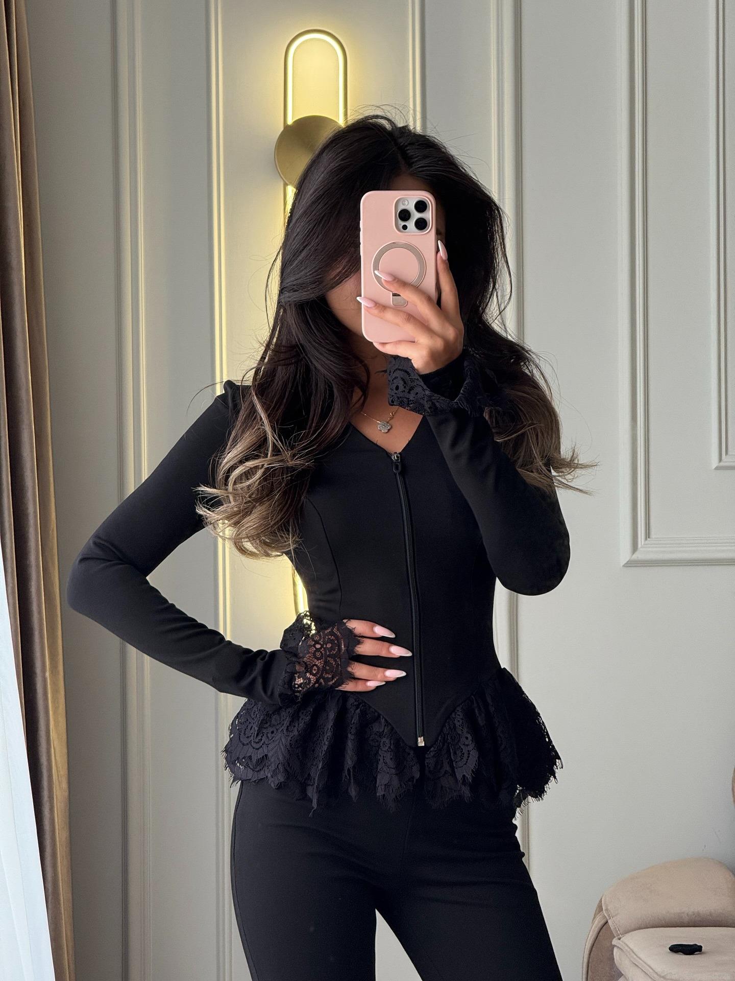 Women's Long Sleeve V-Neck Zipper Top Cotton Polyester Blend With Eyelash Lace Trim Slim Fit Elegant Tee For Casual Dating Streetwear Clothing