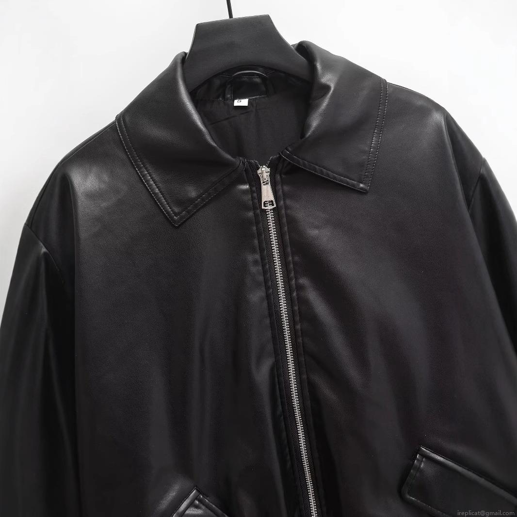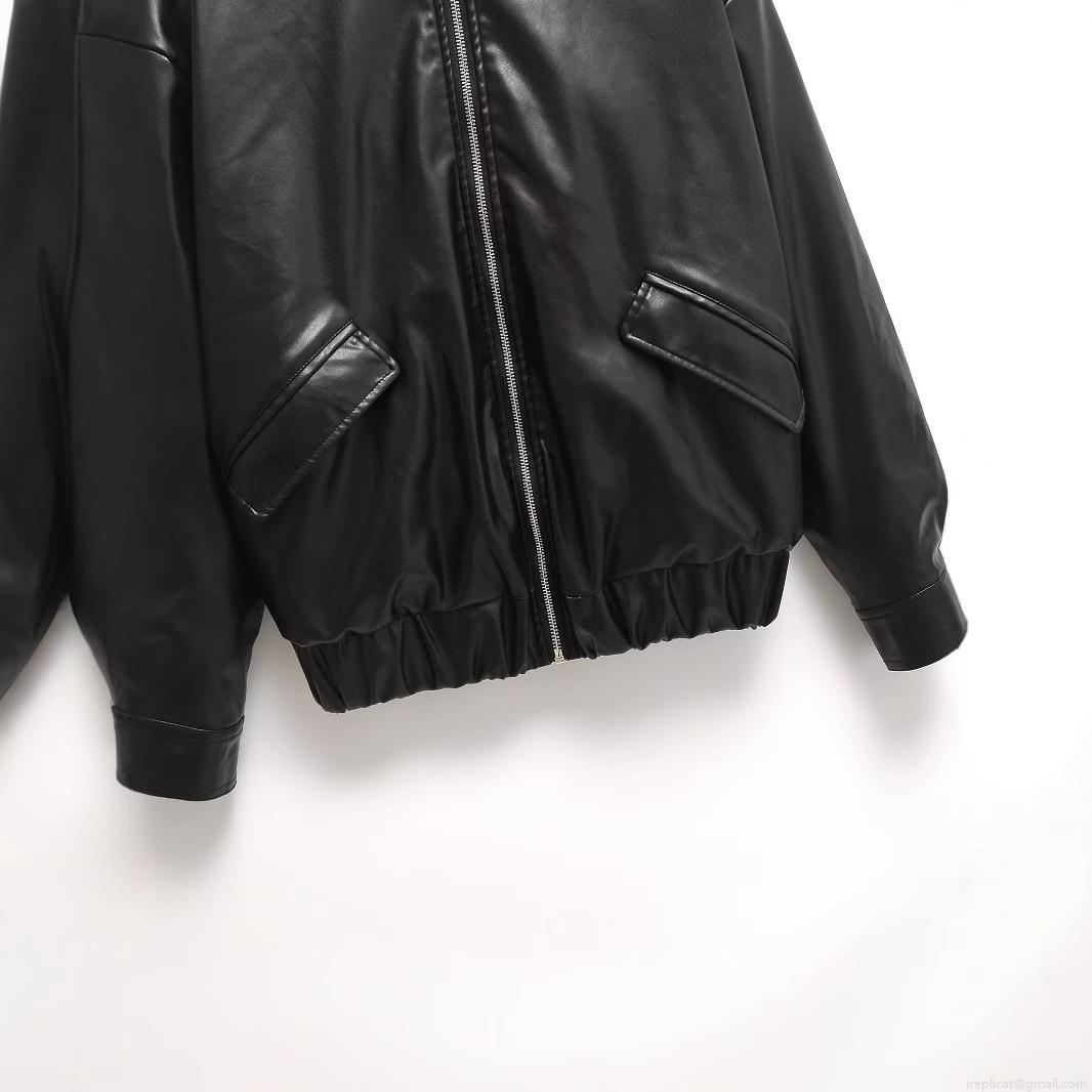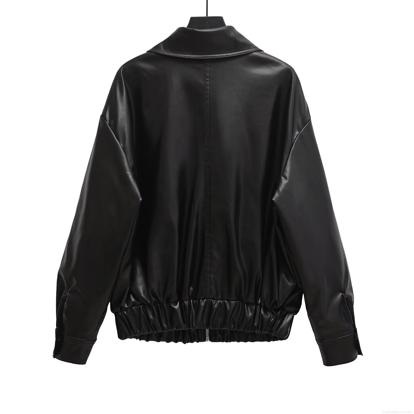 Women's Loose Faux Leather Jacket Casual PU Leather Bomber Coat with Metal Zipper Solid Black Long Sleeve Outerwear for Streetwear