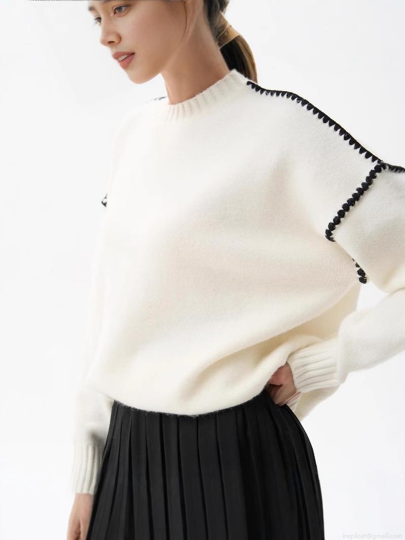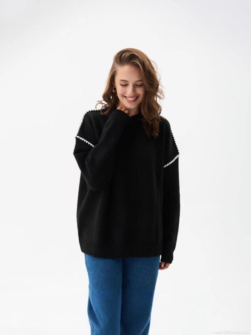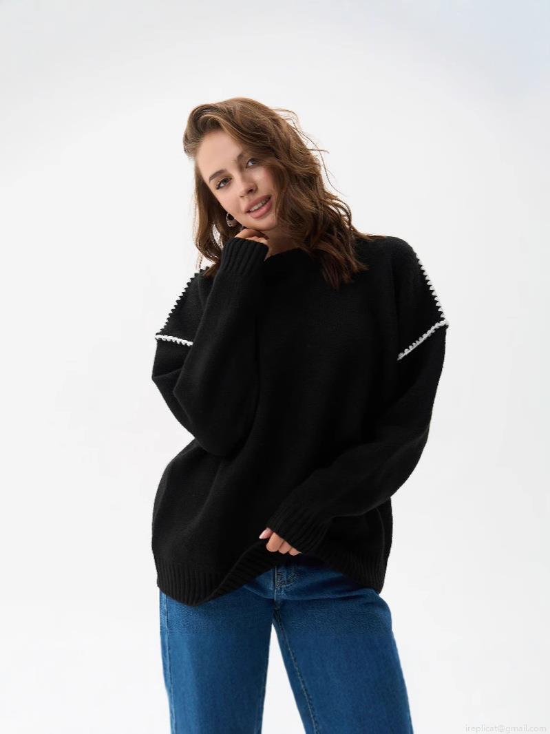 Women's Loose Knit Sweater Acrylic Wool Blend Contrast Stitching Round Neck Drop Shoulder Pullover Jumper For Autumn Winter Elegant Minimalist Tops