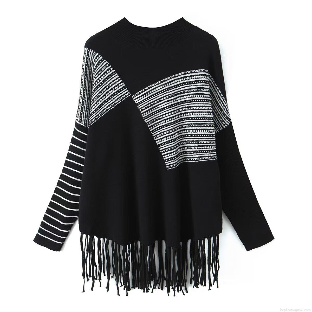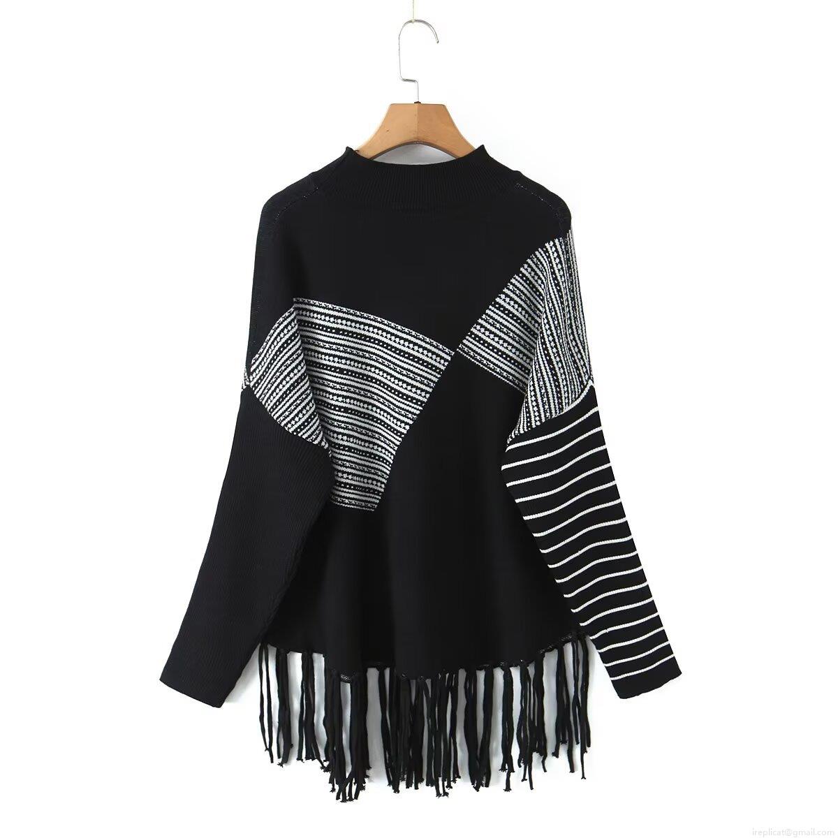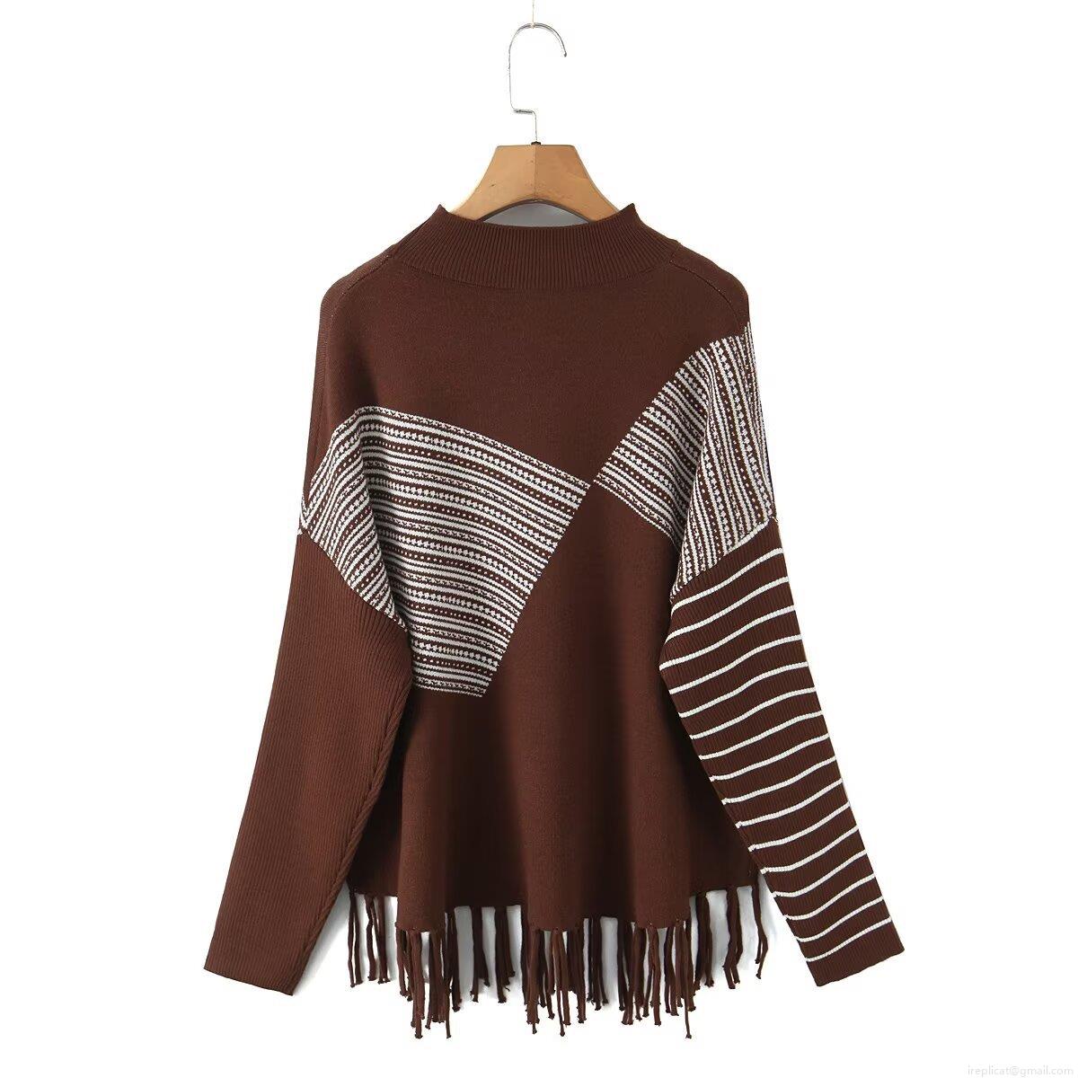Women's Loose Knitted Pullover Sweater With Tassel Hem Geometric Jacquard Long Sleeve Round Neck Casual Jumper Women Fashion Knitted Top