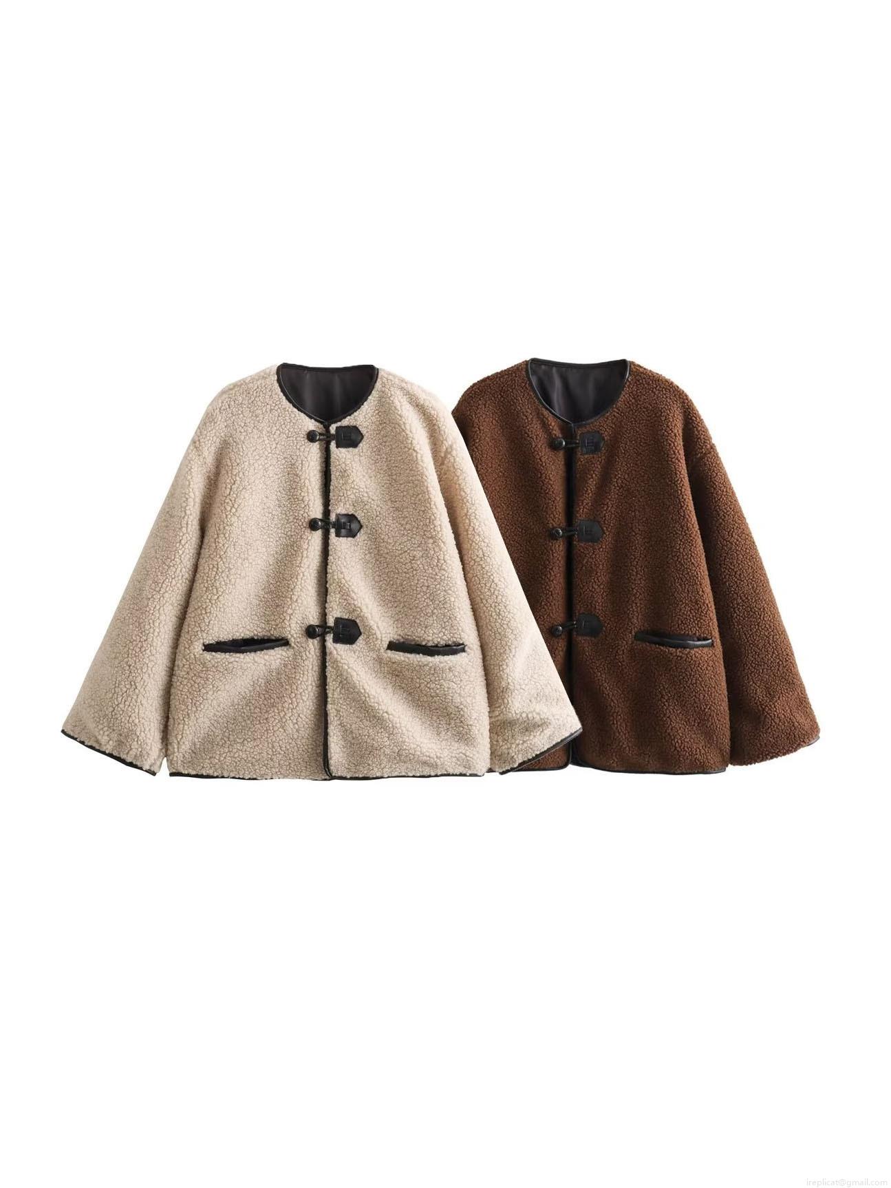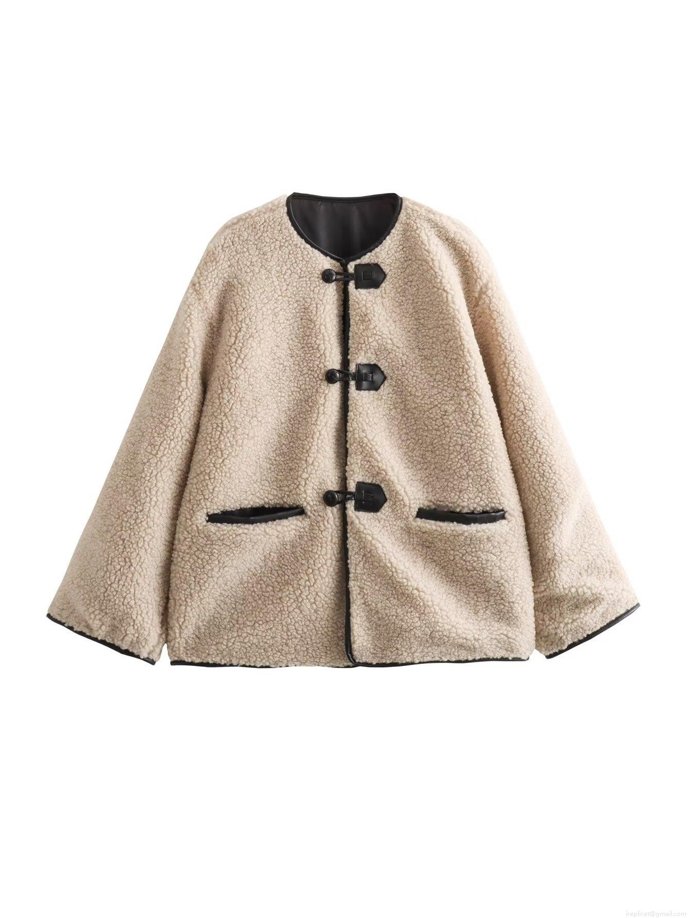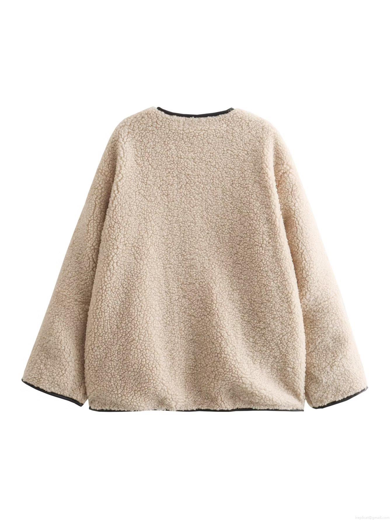 Women's Loose Lambswool Fleece Jacket Outerwear With Contrast Leather Trim Round Neck Long Sleeve Casual Streetwear Coat For Autumn Winter Women