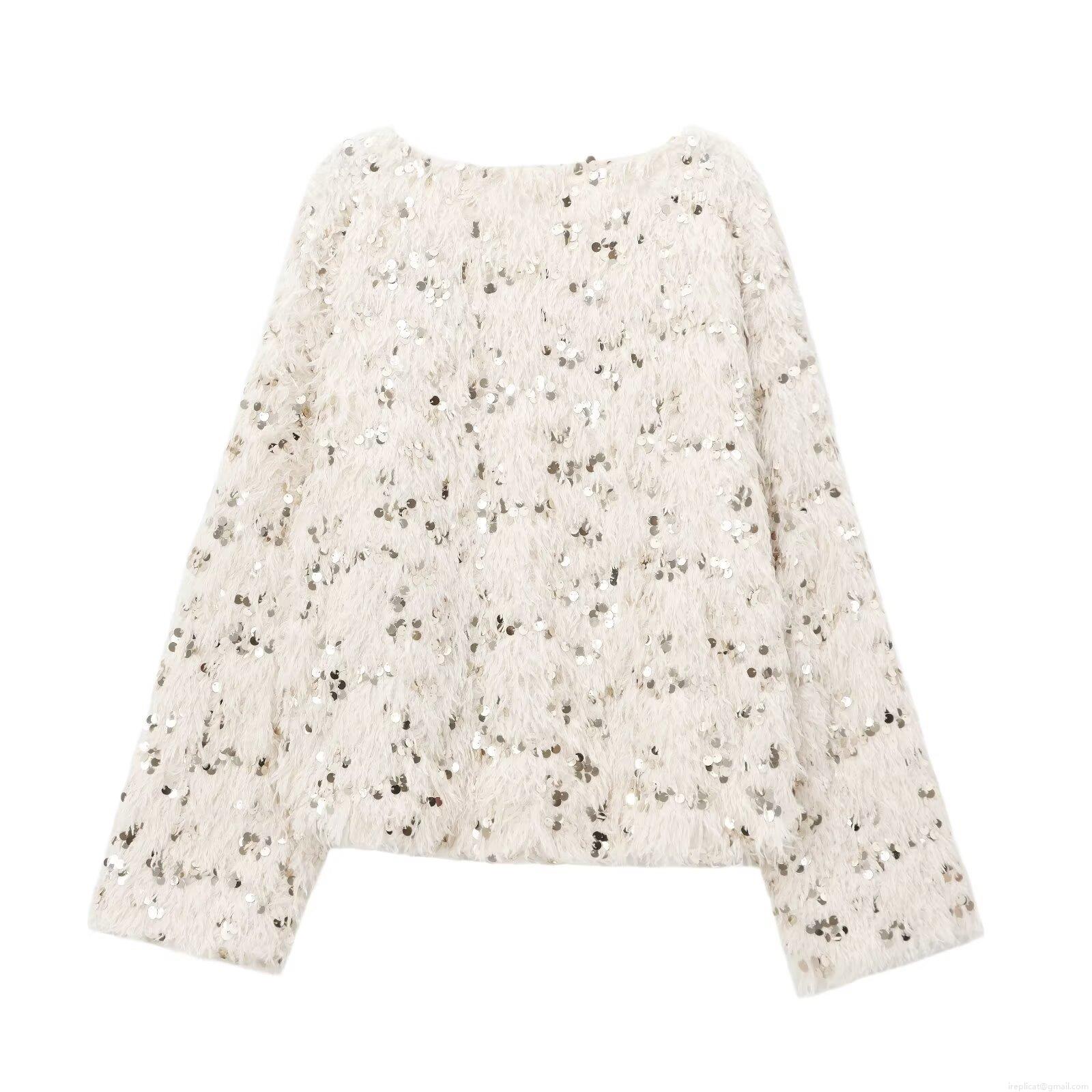 Women's Loose Round Neck Knit Sweater With Silver Sequins And Faux Feather Fringe Long Sleeve Plush Pullover Elegant Winter Party Streetwear Top
