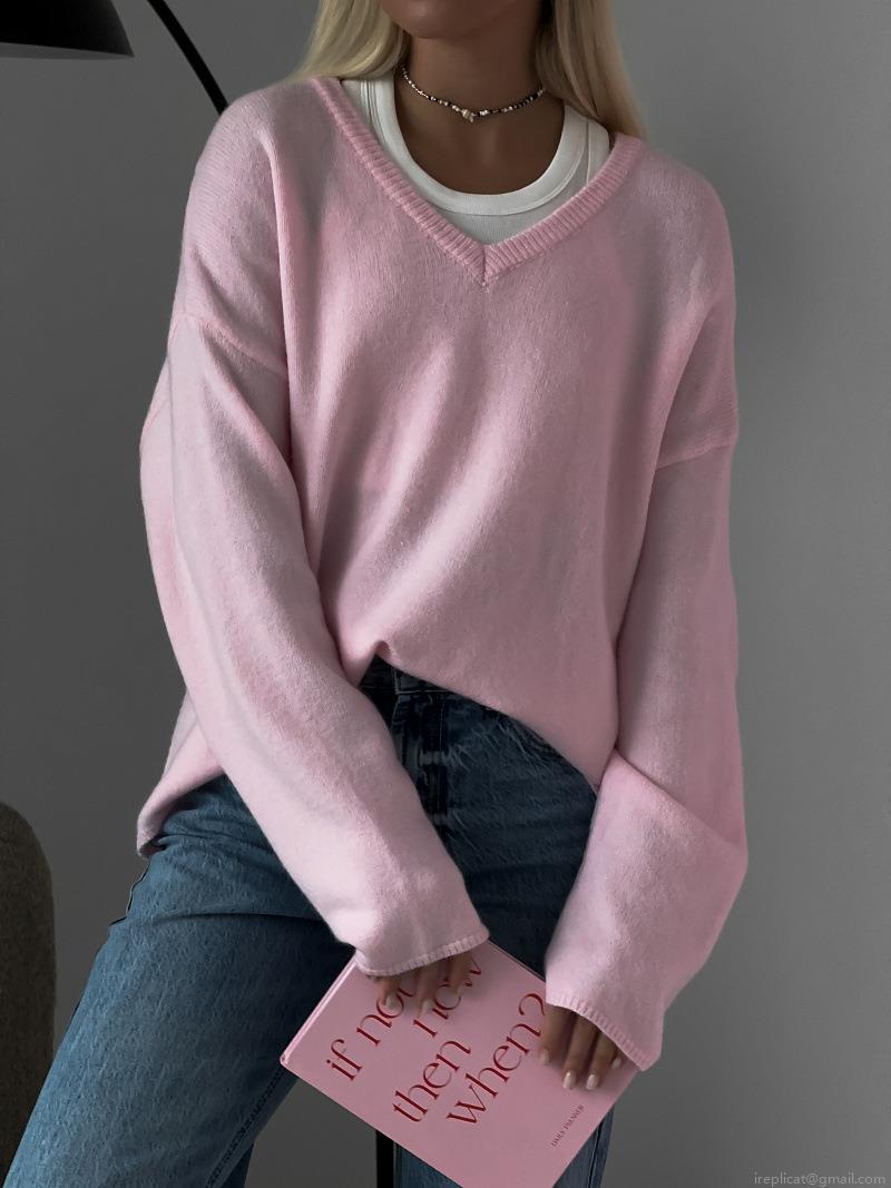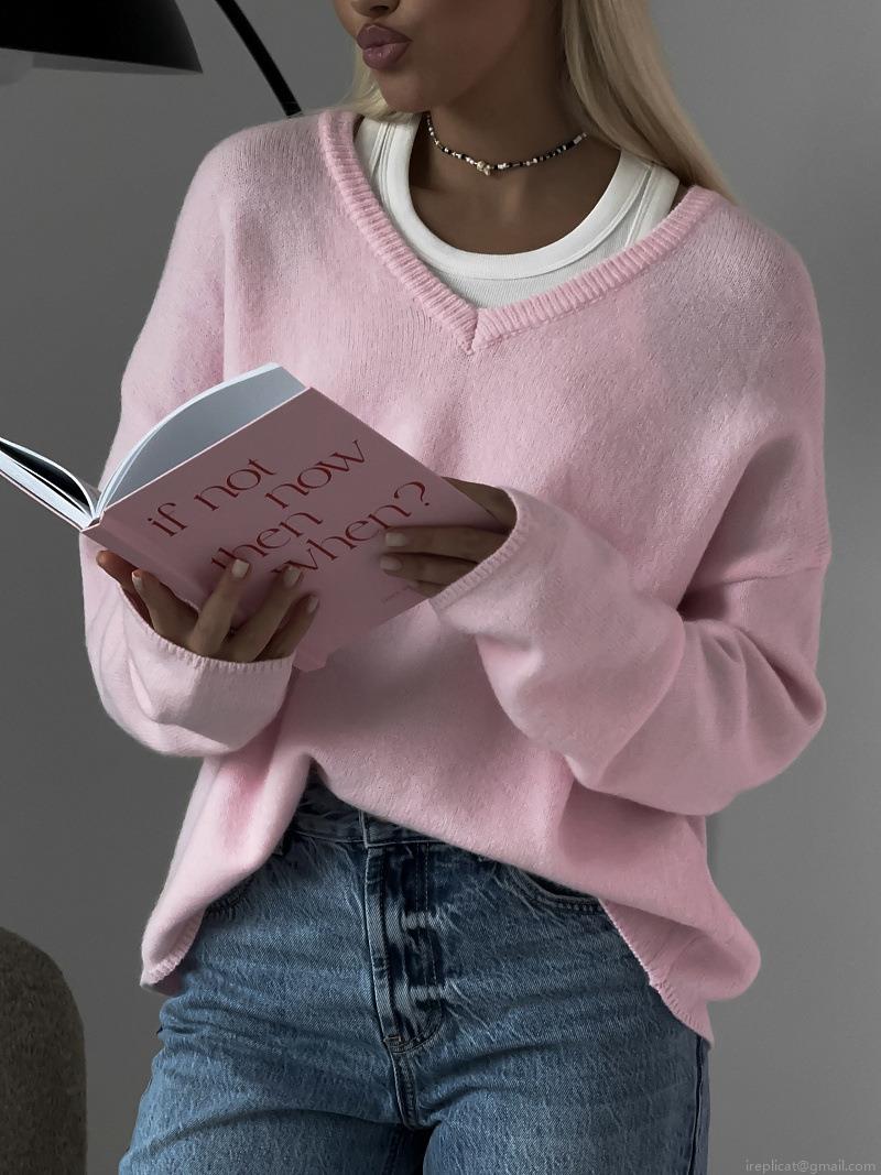 Women's Loose V-Neck Knit Sweater Fashionable Solid Color Long Sleeve Pullover Autumn Winter Casual Thin Cotton Blend Knitwear Top