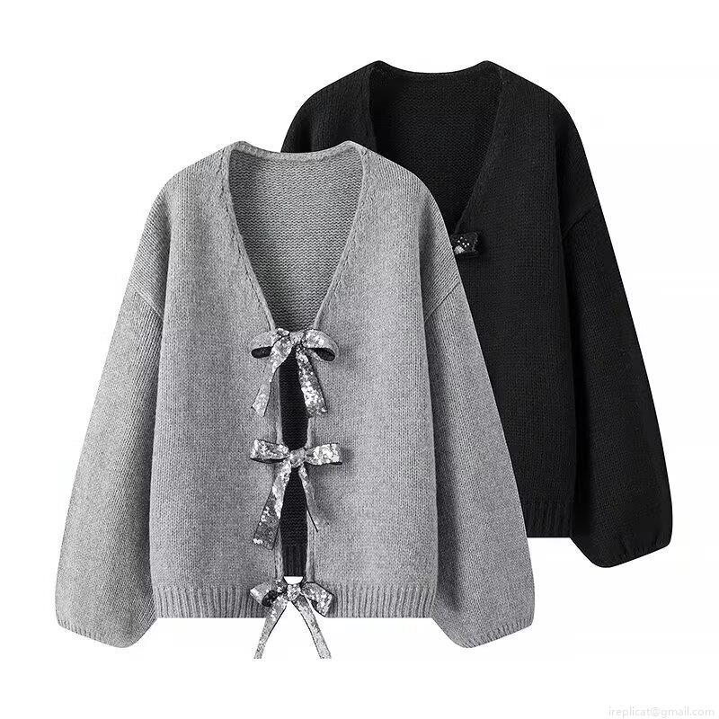 Women's Loose V-Neck Knitted Cardigan Sweater Sweet Sequin Bowknot Tie Front Long Sleeve Knitwear Top For Daily Party Christmas