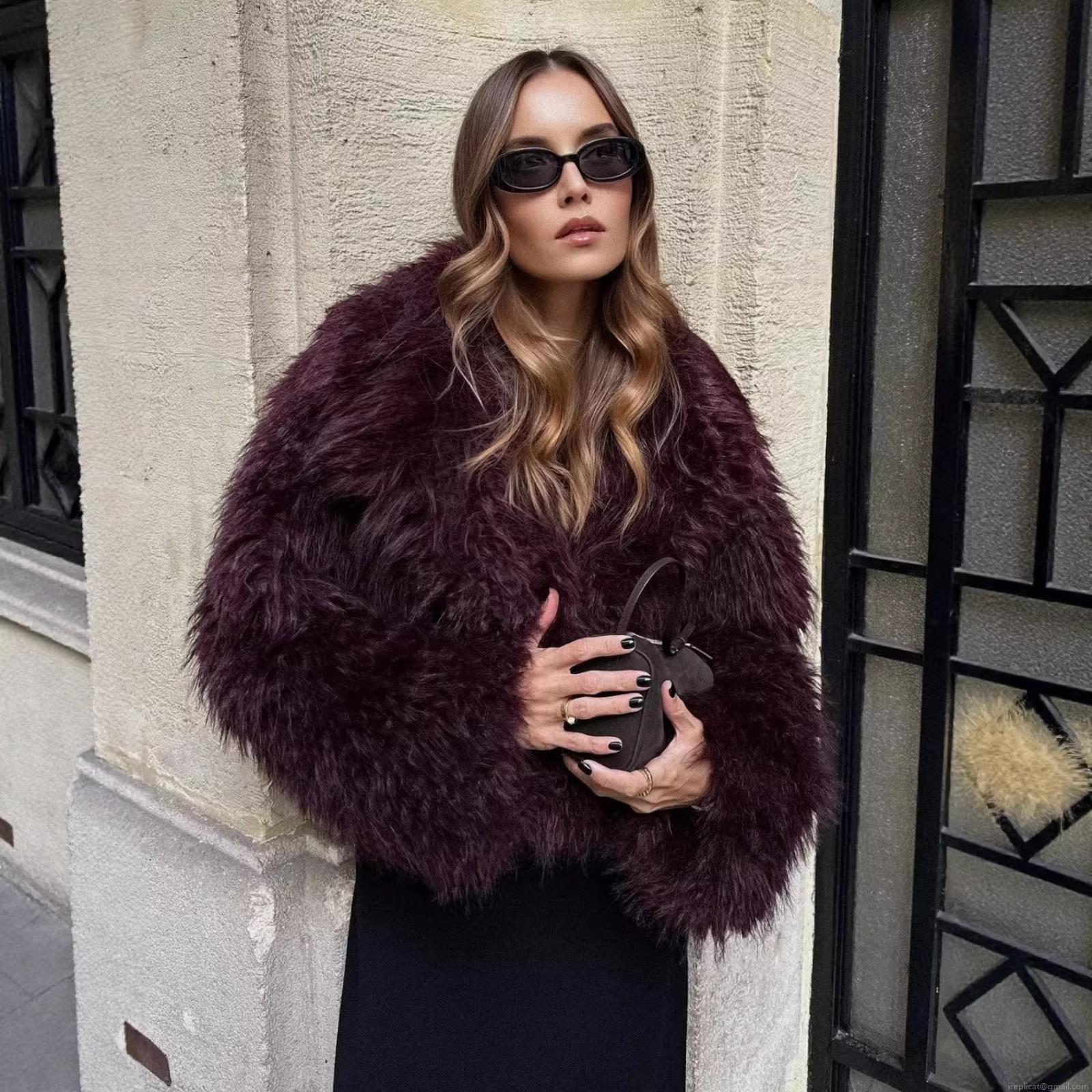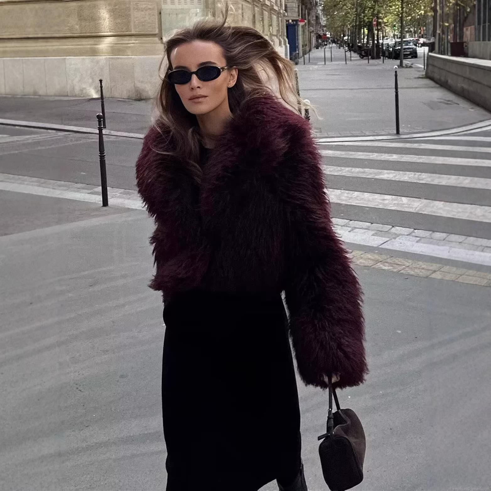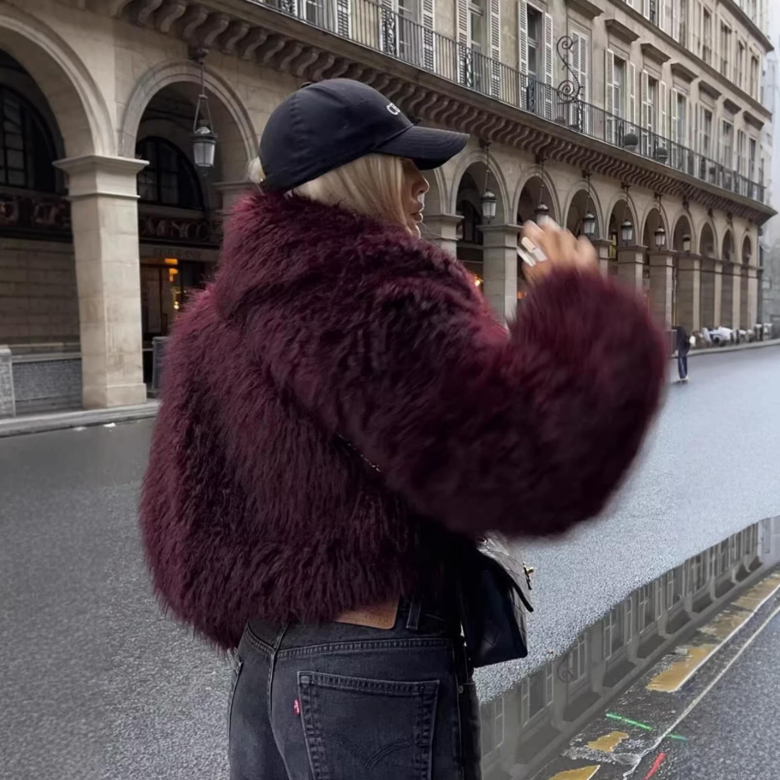 Women's Luxury Faux Fur Coat Winter Warm Short Jacket 100% Polyester Shaggy Fluffy Solid Burgundy Lapel Overcoat Long Sleeve Streetwear Outerwear For Women