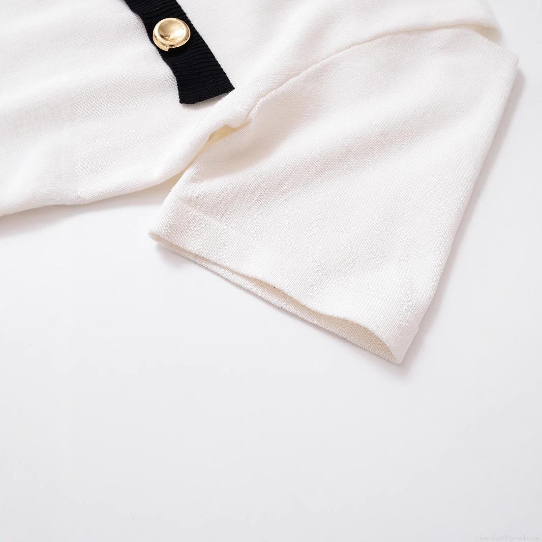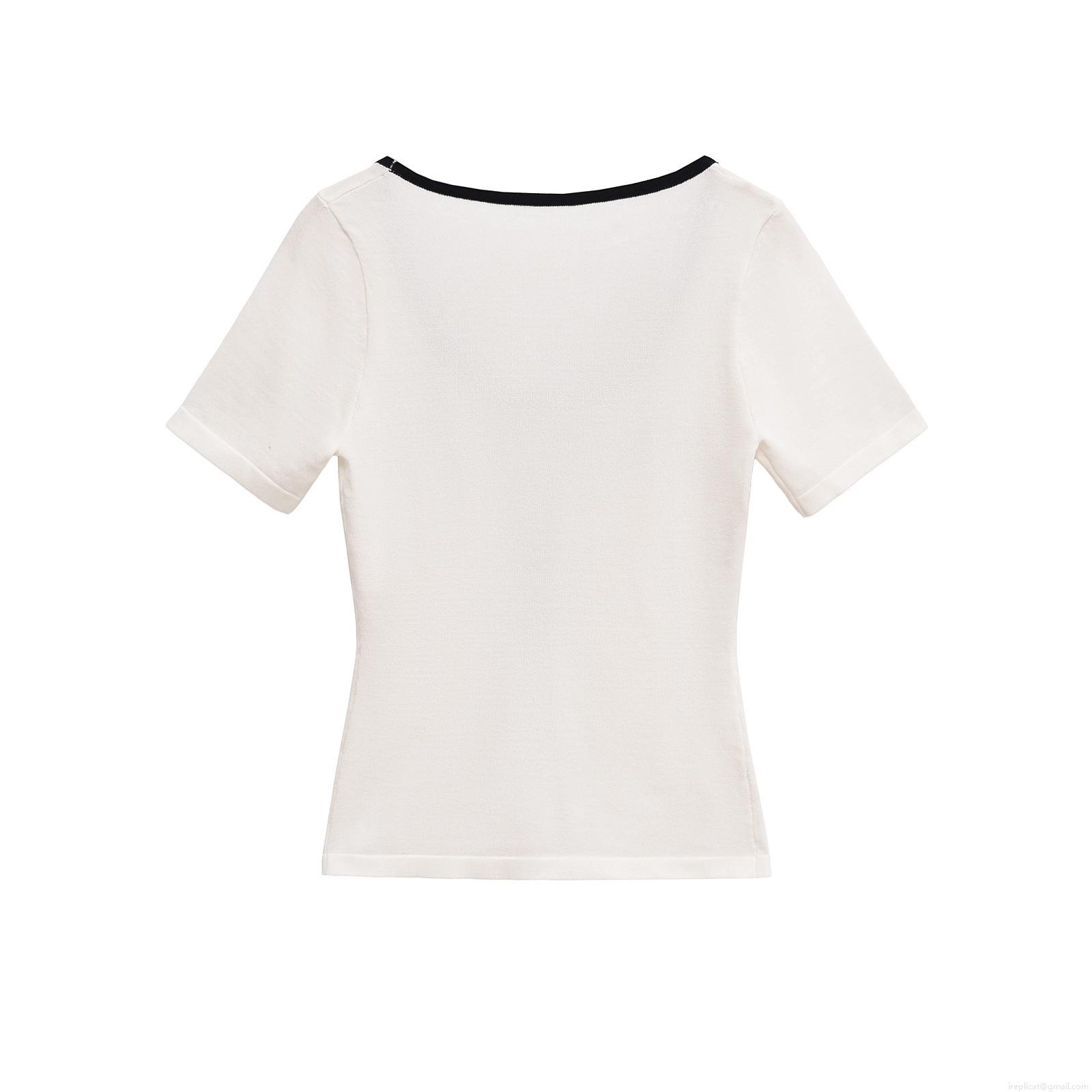 Women's Mercerized Cotton Knit T-Shirt Contrast Trim Gold Button Round Neck Short Sleeve Top Elegant Summer Casual Chic Streetwear Tee For Lady