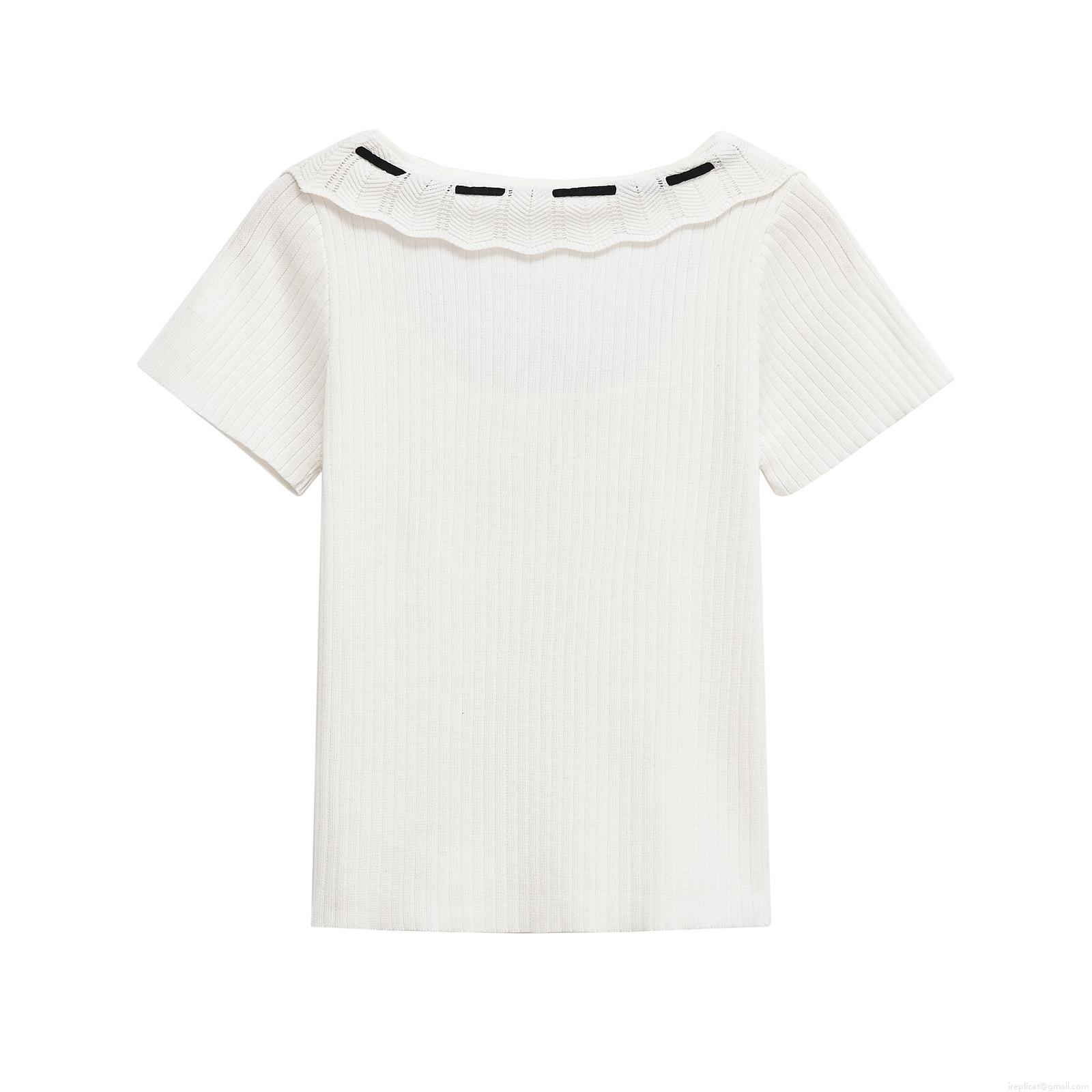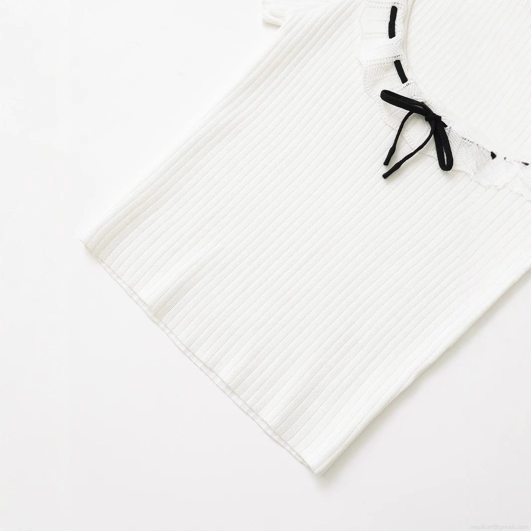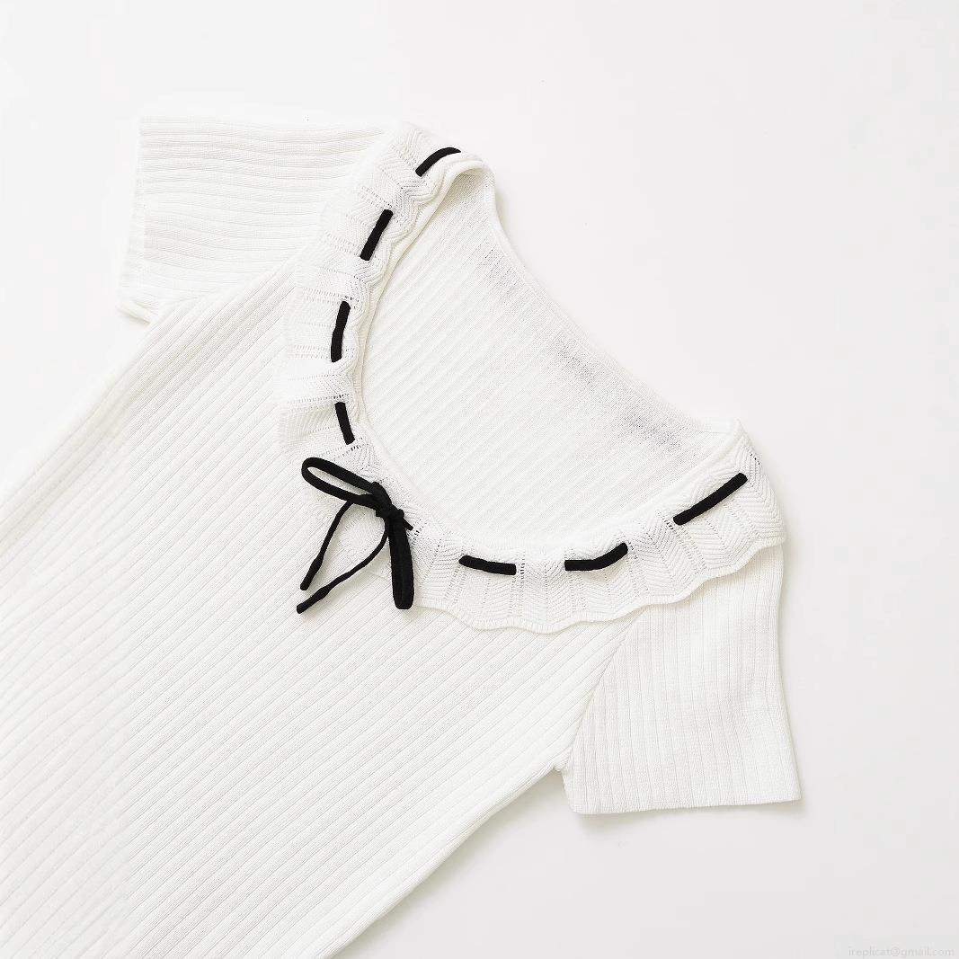 Women's Mercerized Cotton Ribbed Knit T-Shirt Elegant Ruffle Collar Short Sleeve Top With Black Ribbon Bow Casual Summer Blouse For Ladies