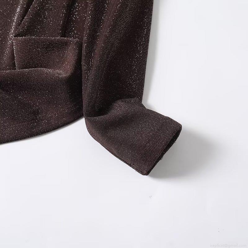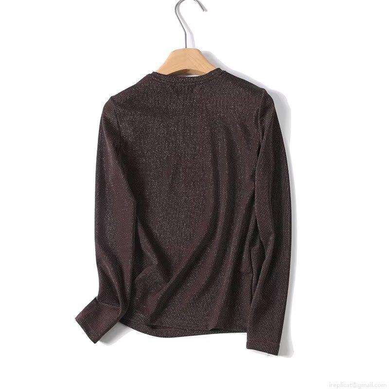 Women's Metallic Shiny T-Shirt Long Sleeve Slim Fit Round Neck Deep Brown Casual Fashion Pullover Top Made Of Nylon Spandex And Silver Thread Soft Elegant Apparel
