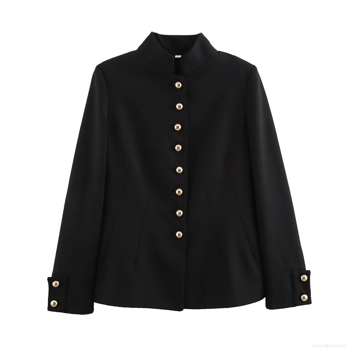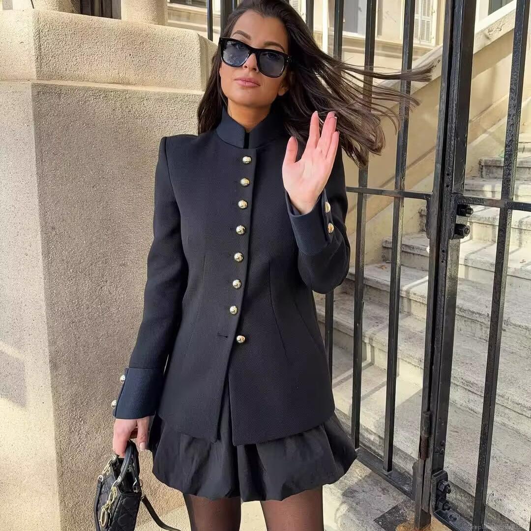 Solid Color, Single-breasted, Stand-up Collar Design, Metal Embossed Buttons