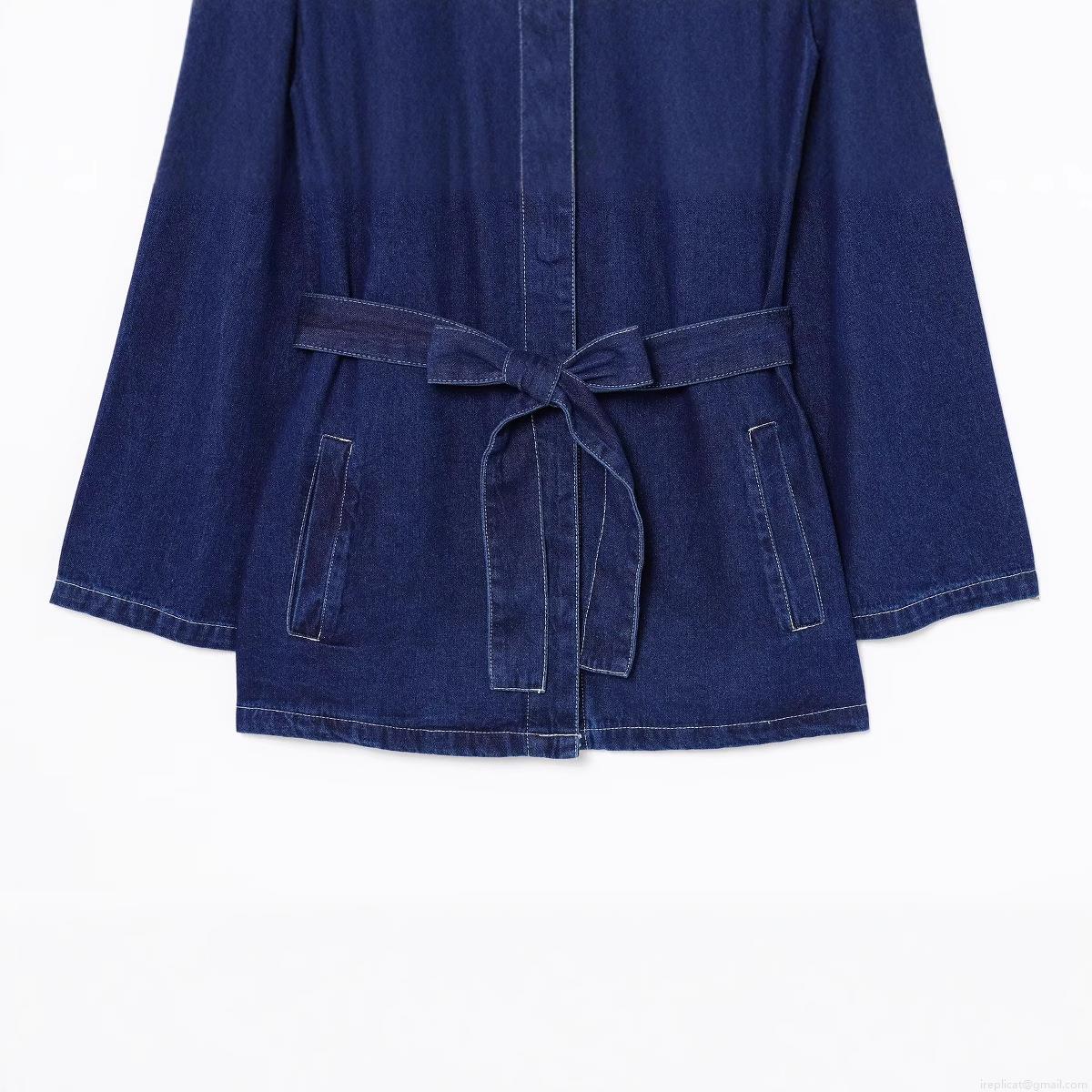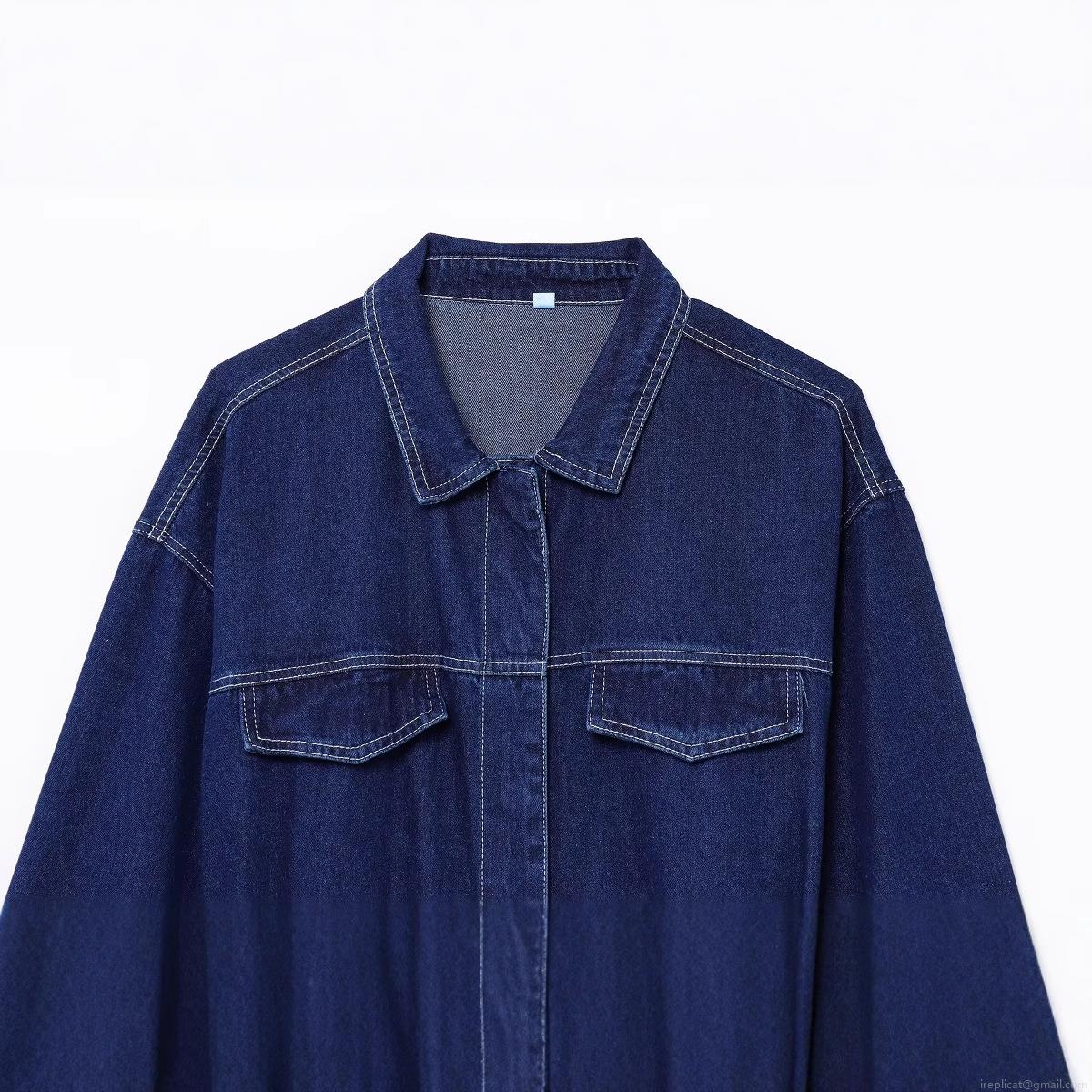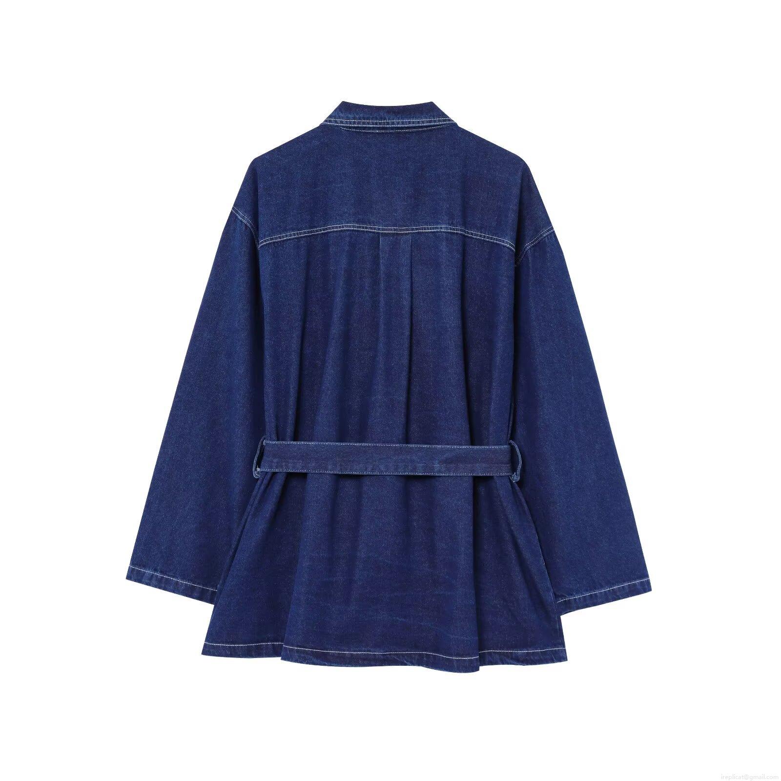 Women's Navy Blue Denim Jacket With Belt White Contrast Stitching Long Sleeve Lapel Collar Oversized Shacket Cotton Blend Outerwear Coat For Women