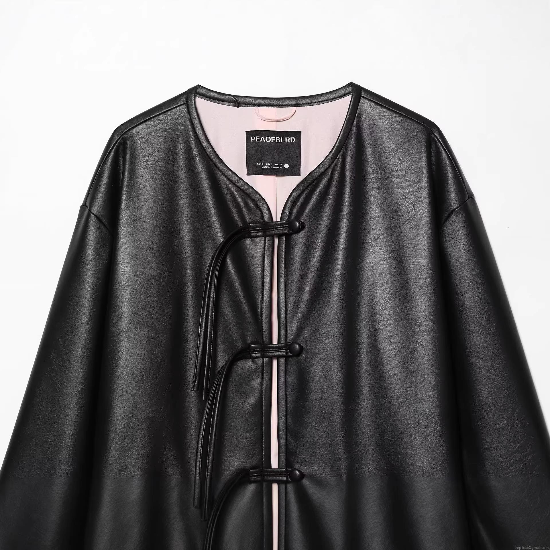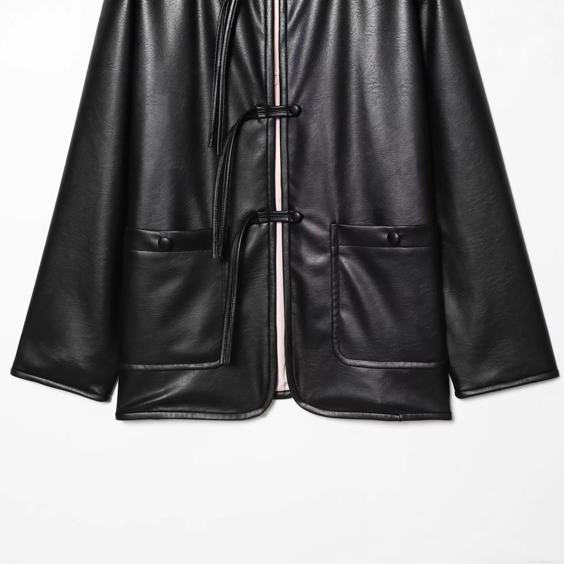 Women's New Chinese Style PU Leather Jacket Vintage Frog Button Closure Loose Long Sleeve Short Coat Solid Black Fashion Outerwear For Ladies