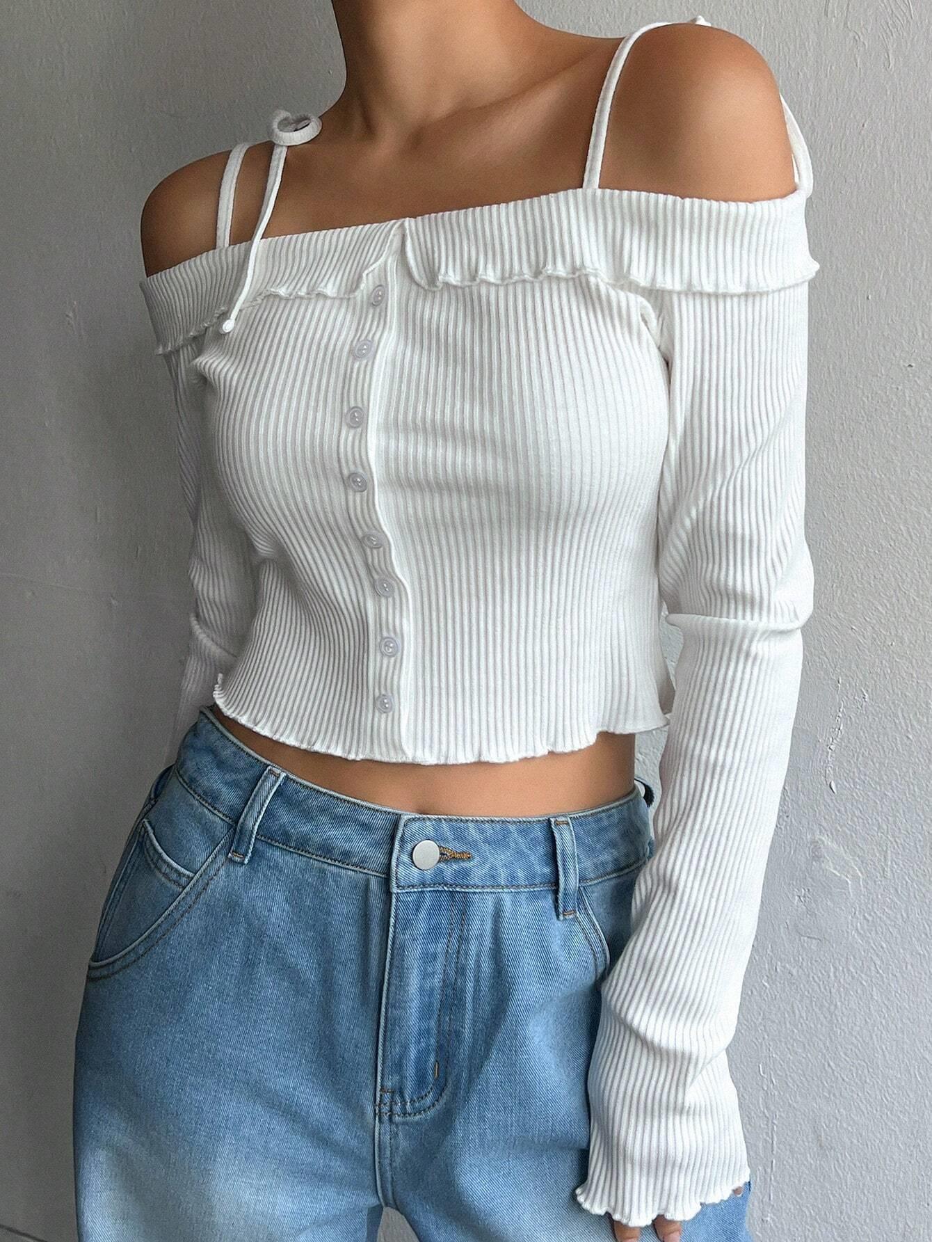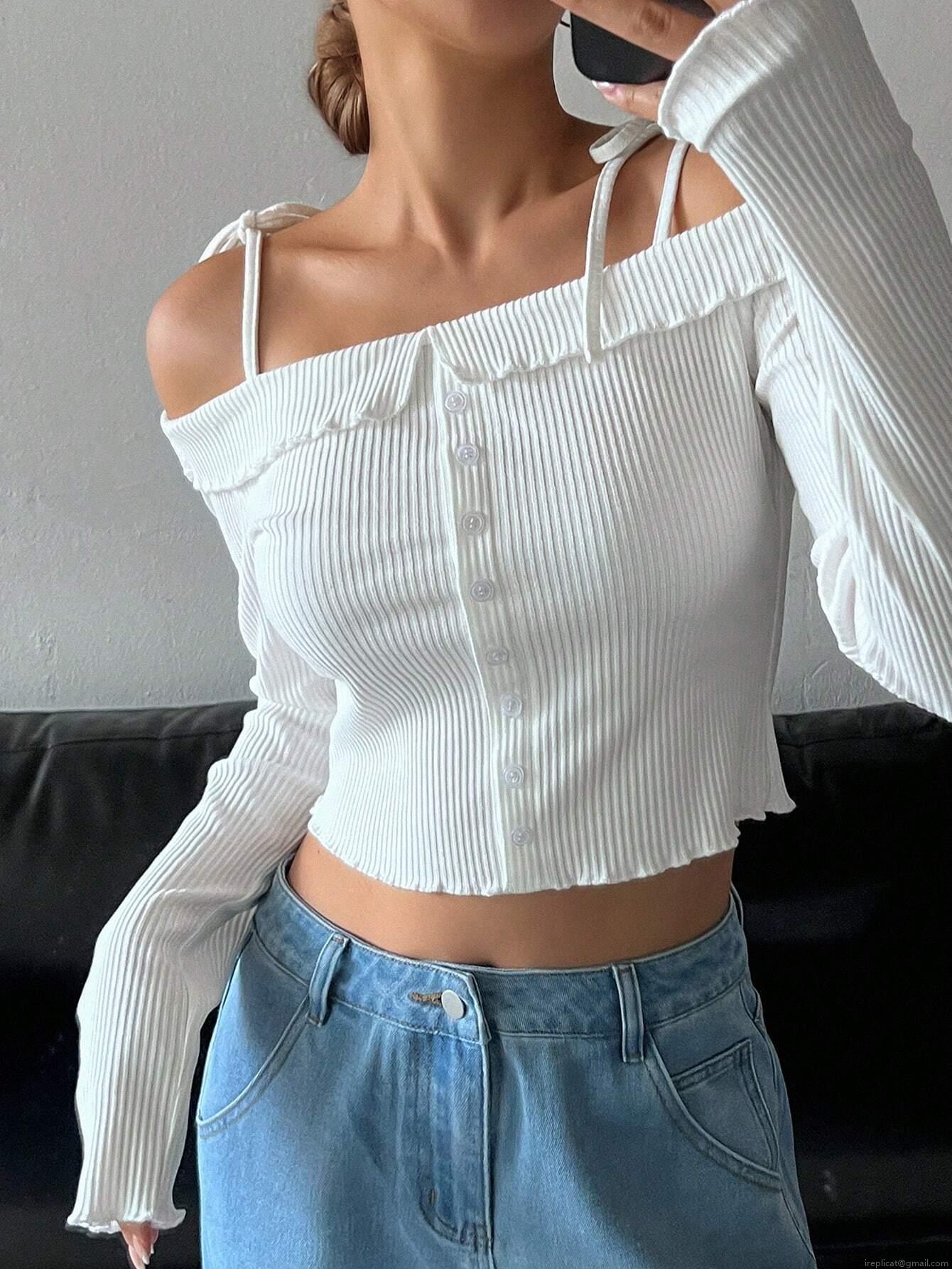 Women's Off The Shoulder Long Sleeve T-Shirt Ribbed Knit Button Front Slim Fit Crop Top Casual Sweet Style Cotton Blend Basic Tee