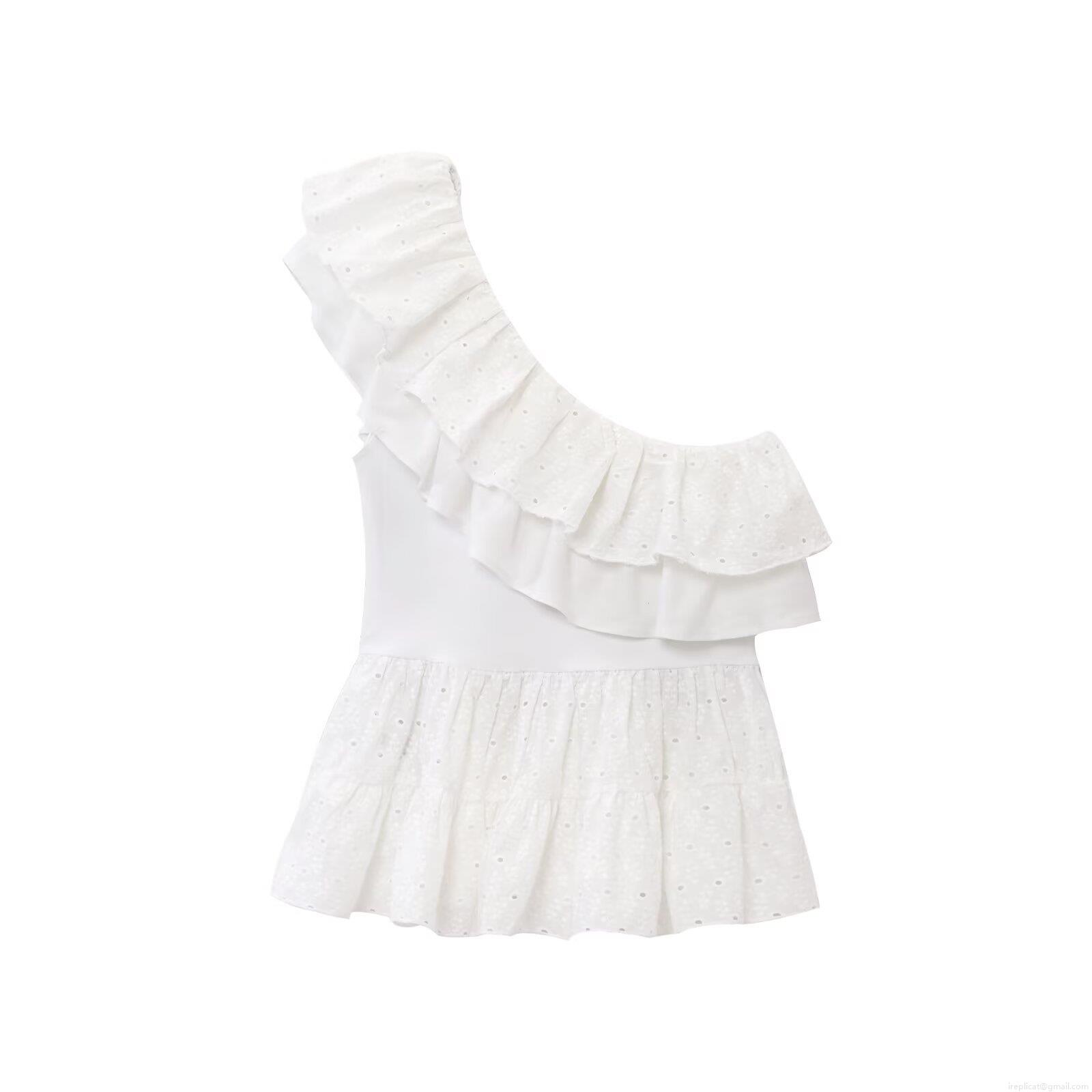 Women's One Shoulder Embroidery Eyelet T-Shirt Top Sexy Ruffle Asymmetric Sleeveless Lace Polyester Shirt Summer Beach Party Streetwear Blouse