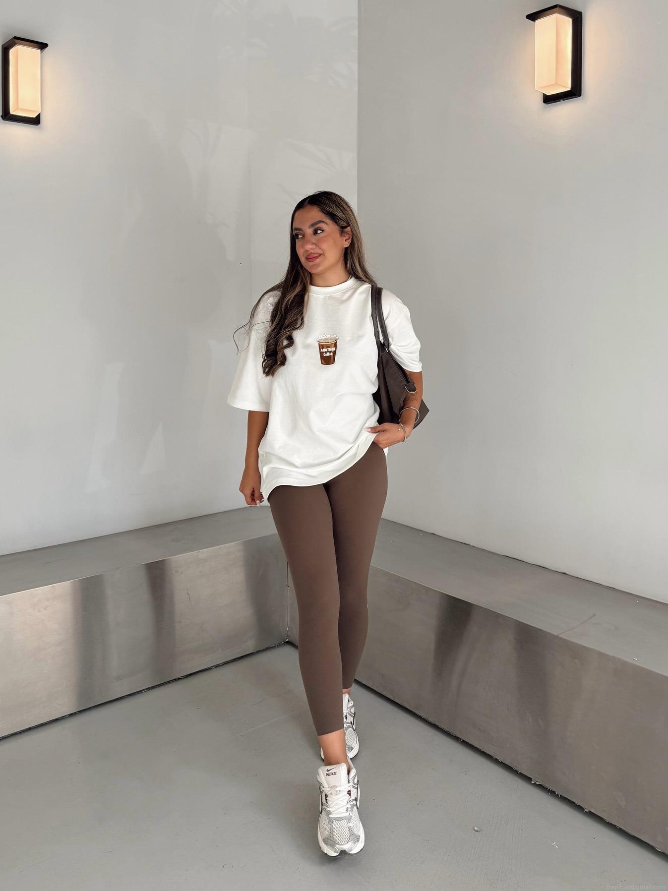 Women's Oversized Cotton Blend T-Shirt Coffee Letter Print Drop Shoulder Round Neck Casual Streetwear Summer Short Sleeve Loose Top Trendy Daily Apparel