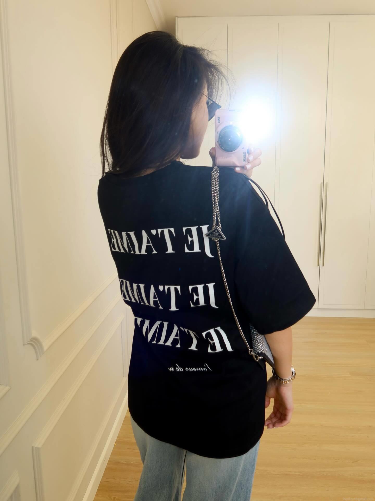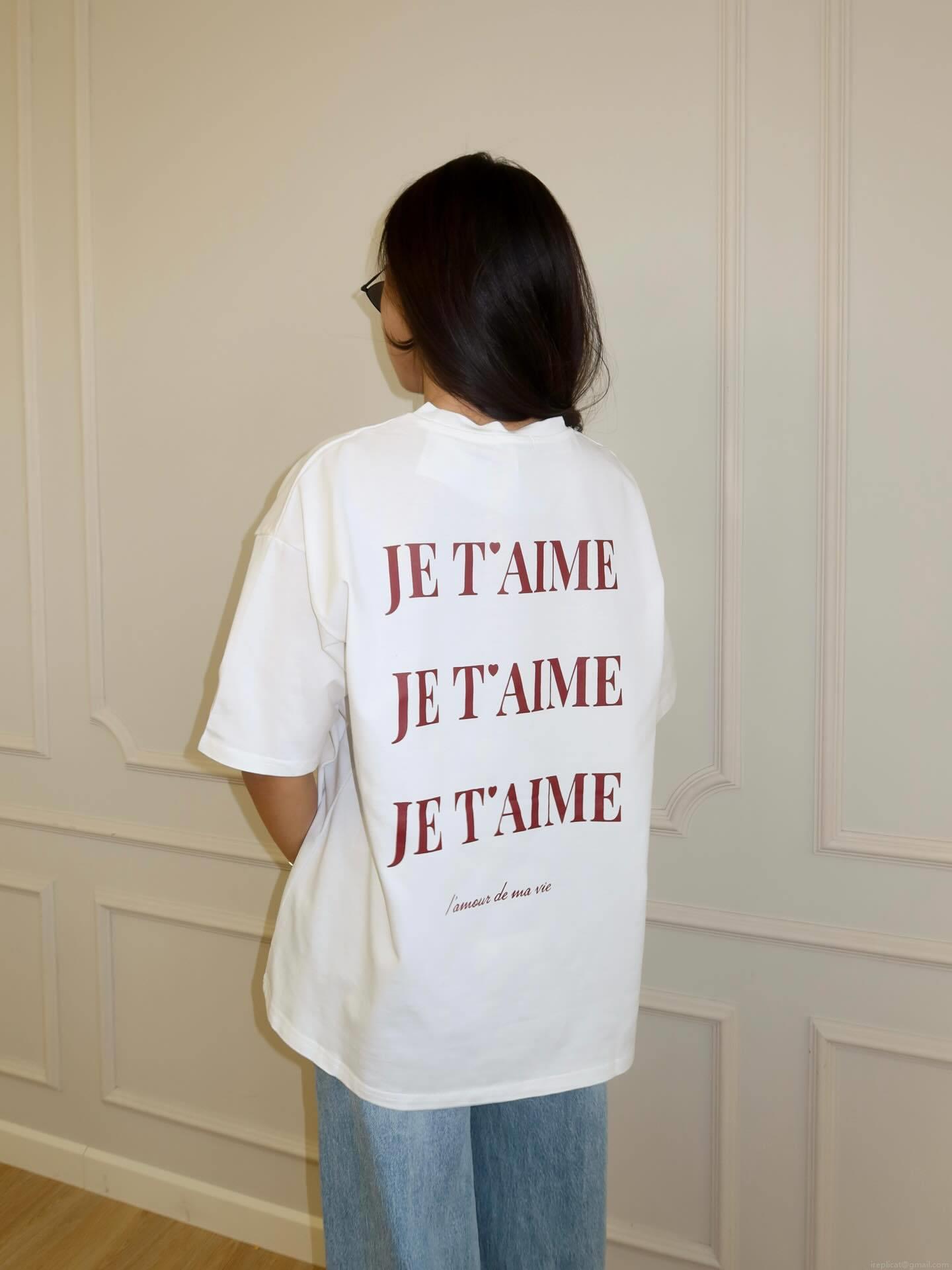 Women's Oversized Cotton T-Shirt Casual Short Sleeve Round Neck Drop Shoulder Top With French JE T'AIME Letter Print Harajuku Streetwear Summer Basic Tee