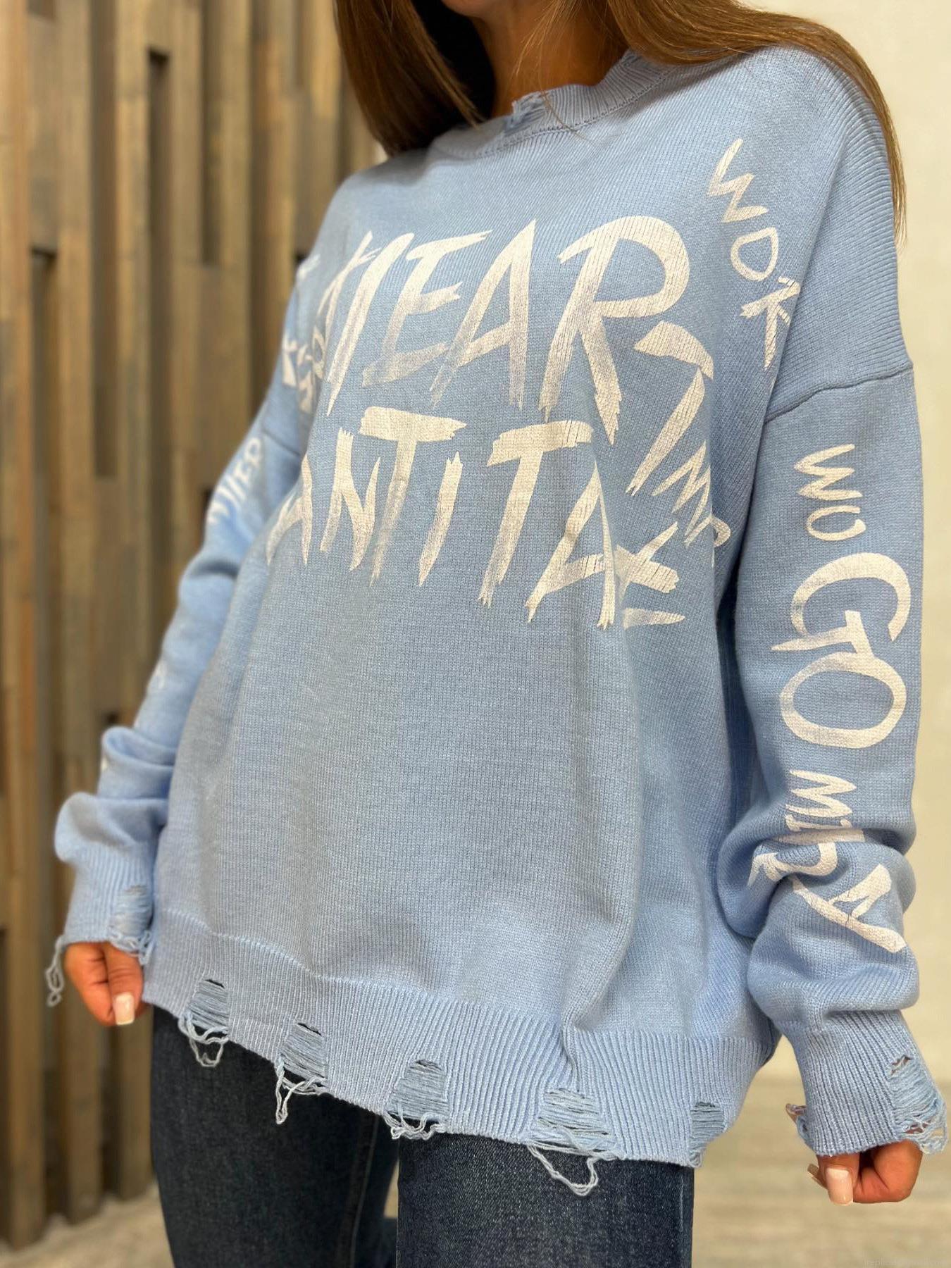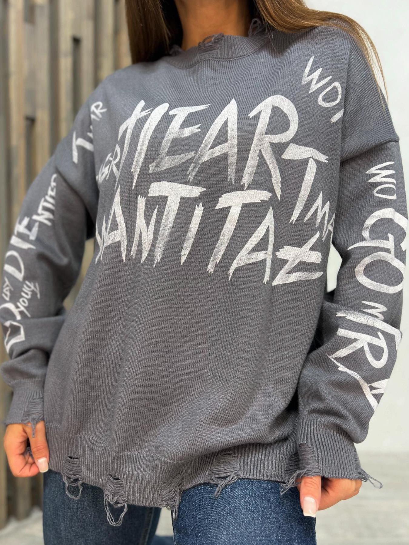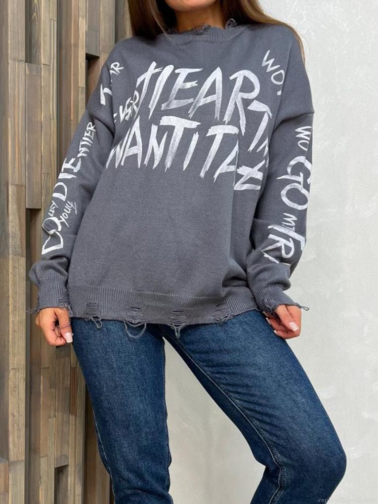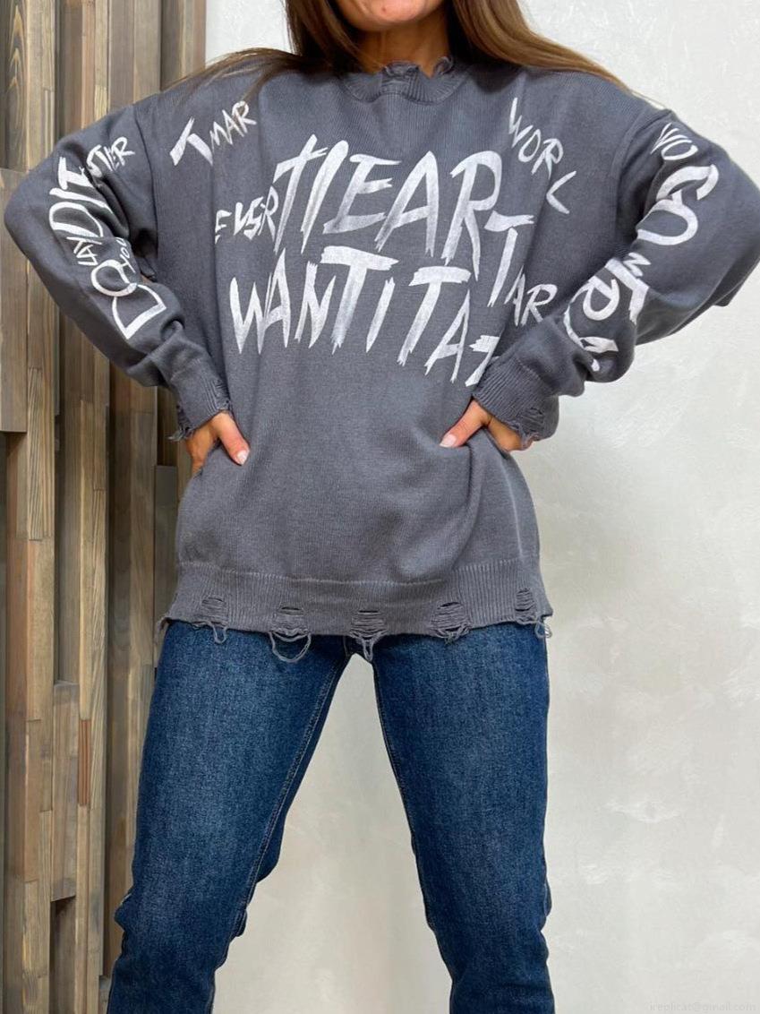 Women's Oversized Graffiti Letter Print Knitted Sweater Distressed Ripped Round Neck Pullover Long Sleeve Cotton Acrylic Blend Casual Streetwear Knitwear Top