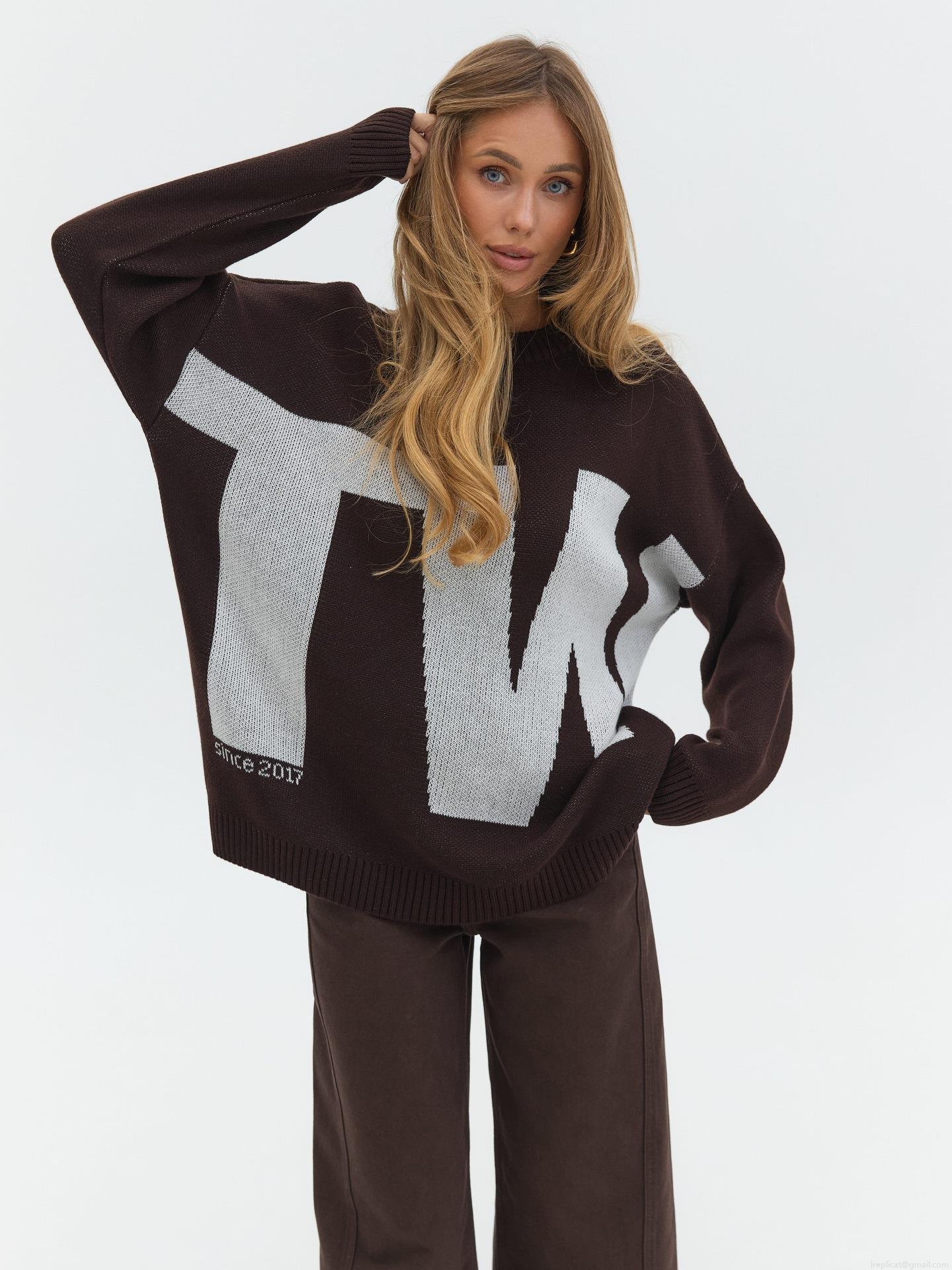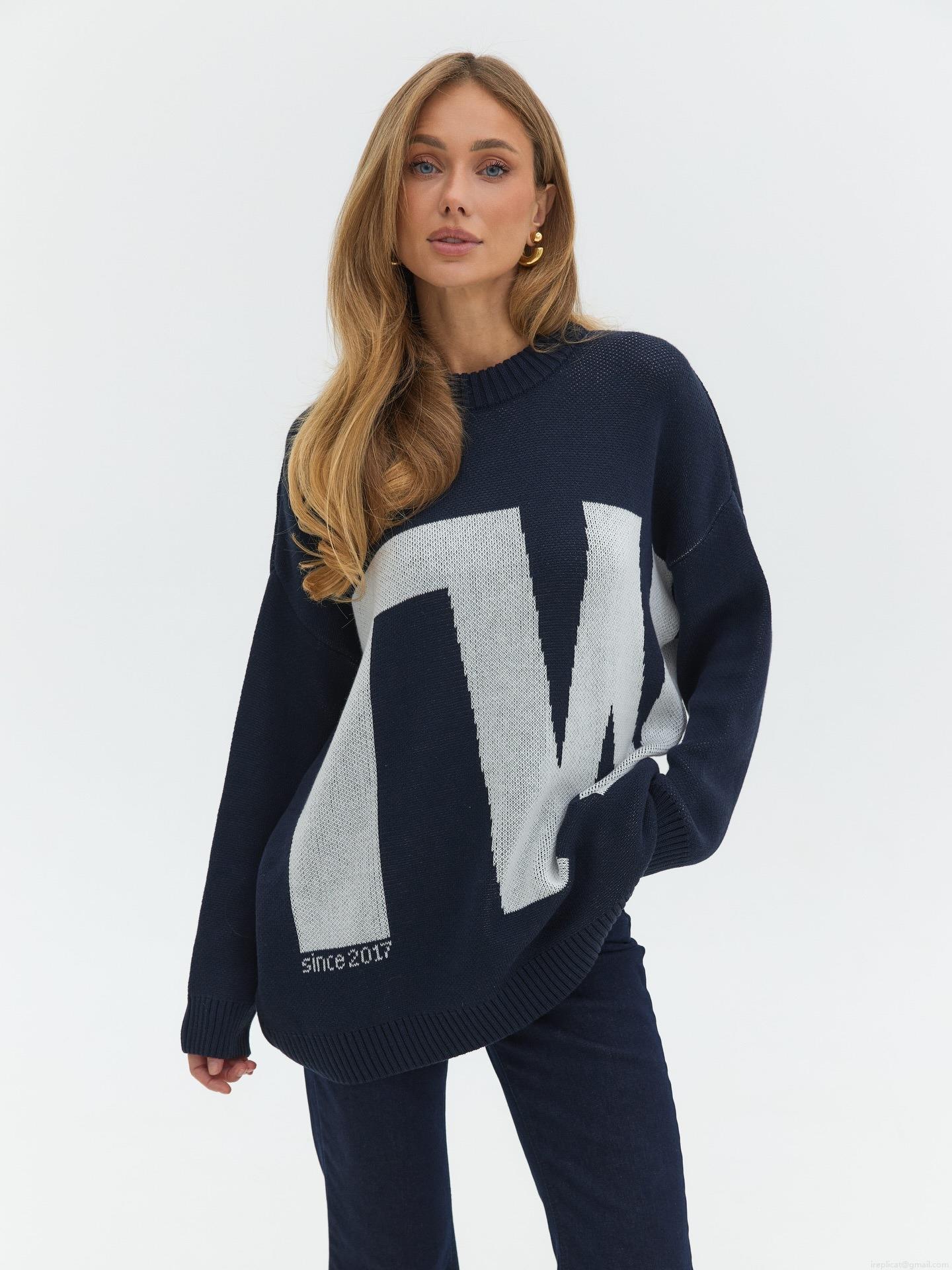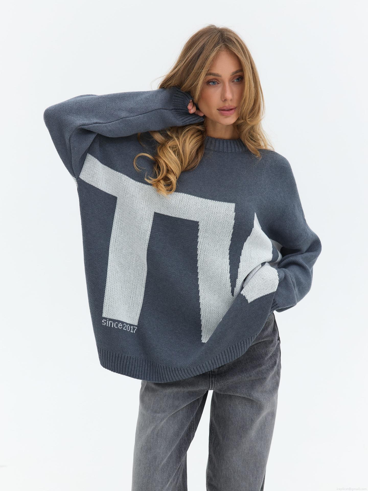 Women's Oversized Knit Sweater 80% Cotton Letter Jacquard Round Neck Long Sleeve Pullover Loose Casual Streetwear Top For Spring Autumn