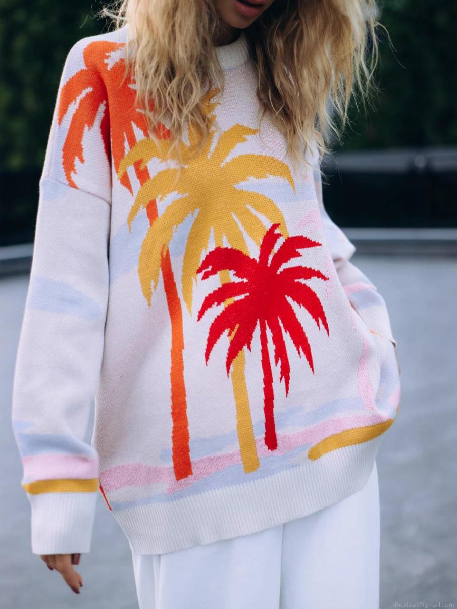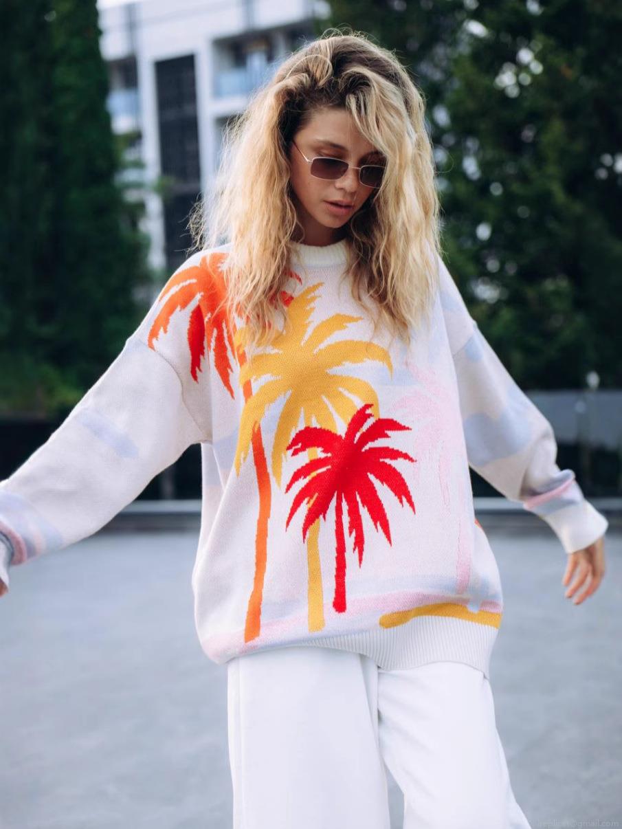 Women's Oversized Knit Sweater Cotton Blend Coconut Tree Jacquard Pullover Contrast Color Long Sleeve Crewneck Jumper Lazy Style Autumn Winter Fashion Tops