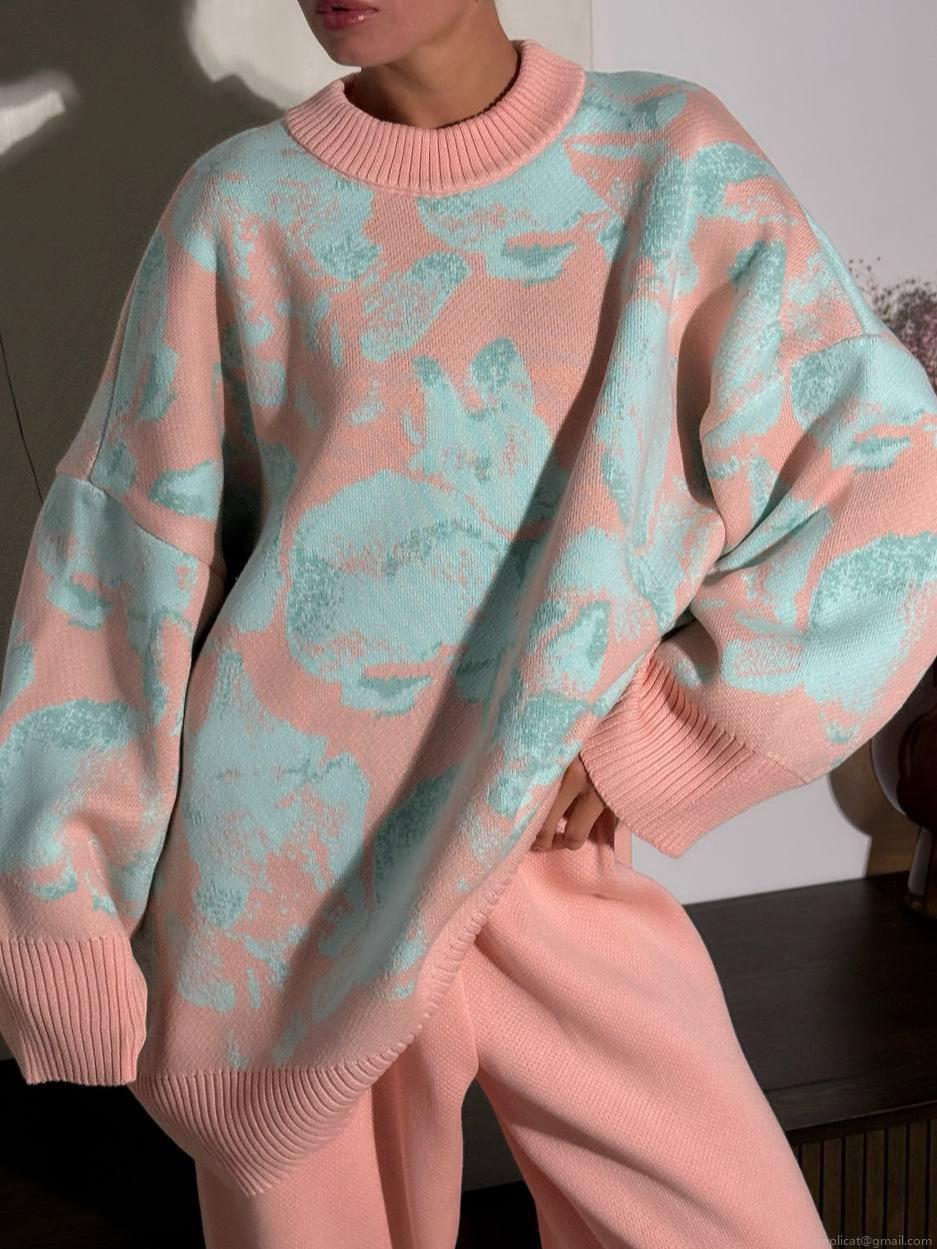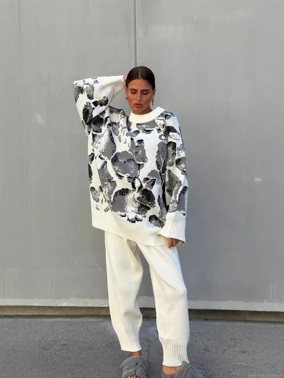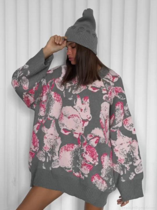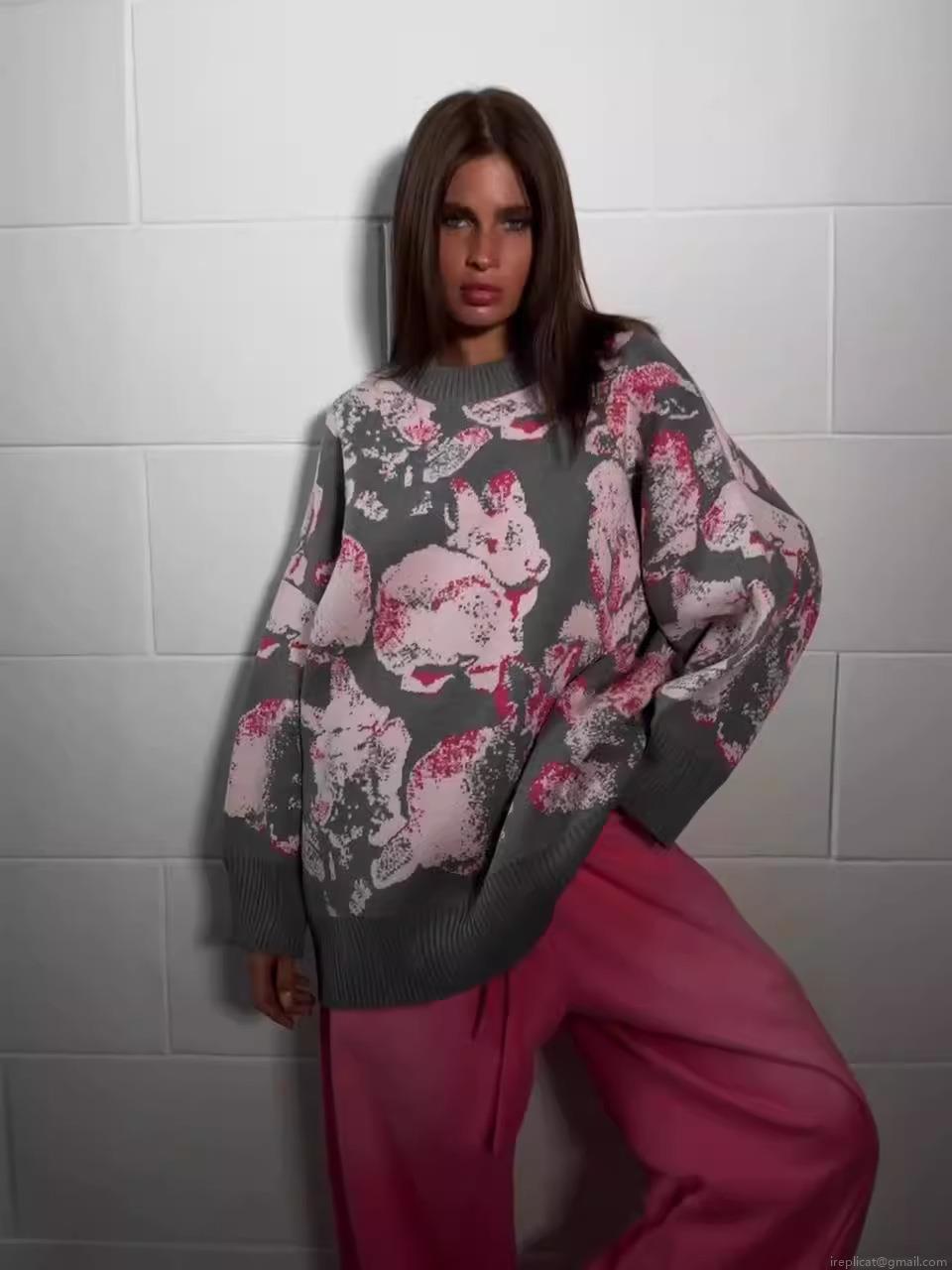 Women's Oversized Knit Sweater Cotton Blend Rabbit Jacquard Long Sleeve Pullover Casual Lazy Style Autumn Winter Warm Knitwear Top
