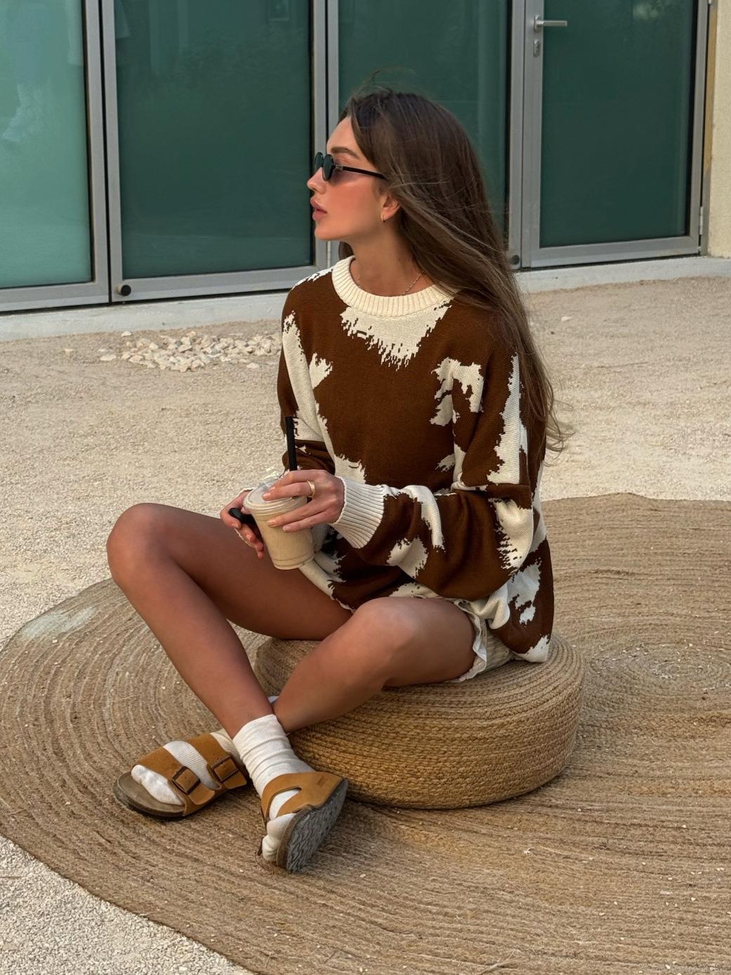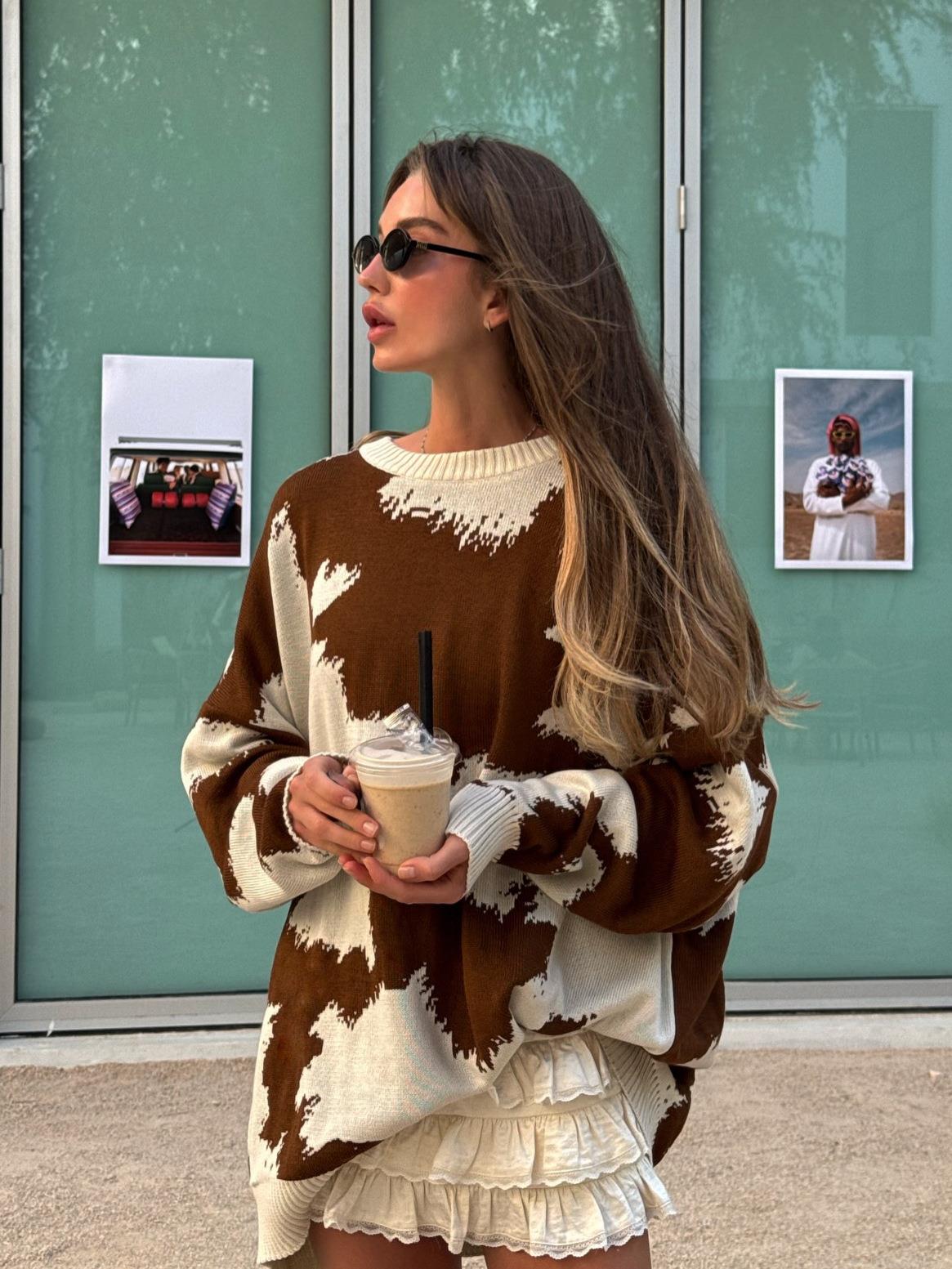 Women's Oversized Knit Sweater Cow Print Loose Fit Crewneck Pullover Long Sleeve Streetwear Jumper Cotton Blend Knitwear Autumn Winter Casual Top