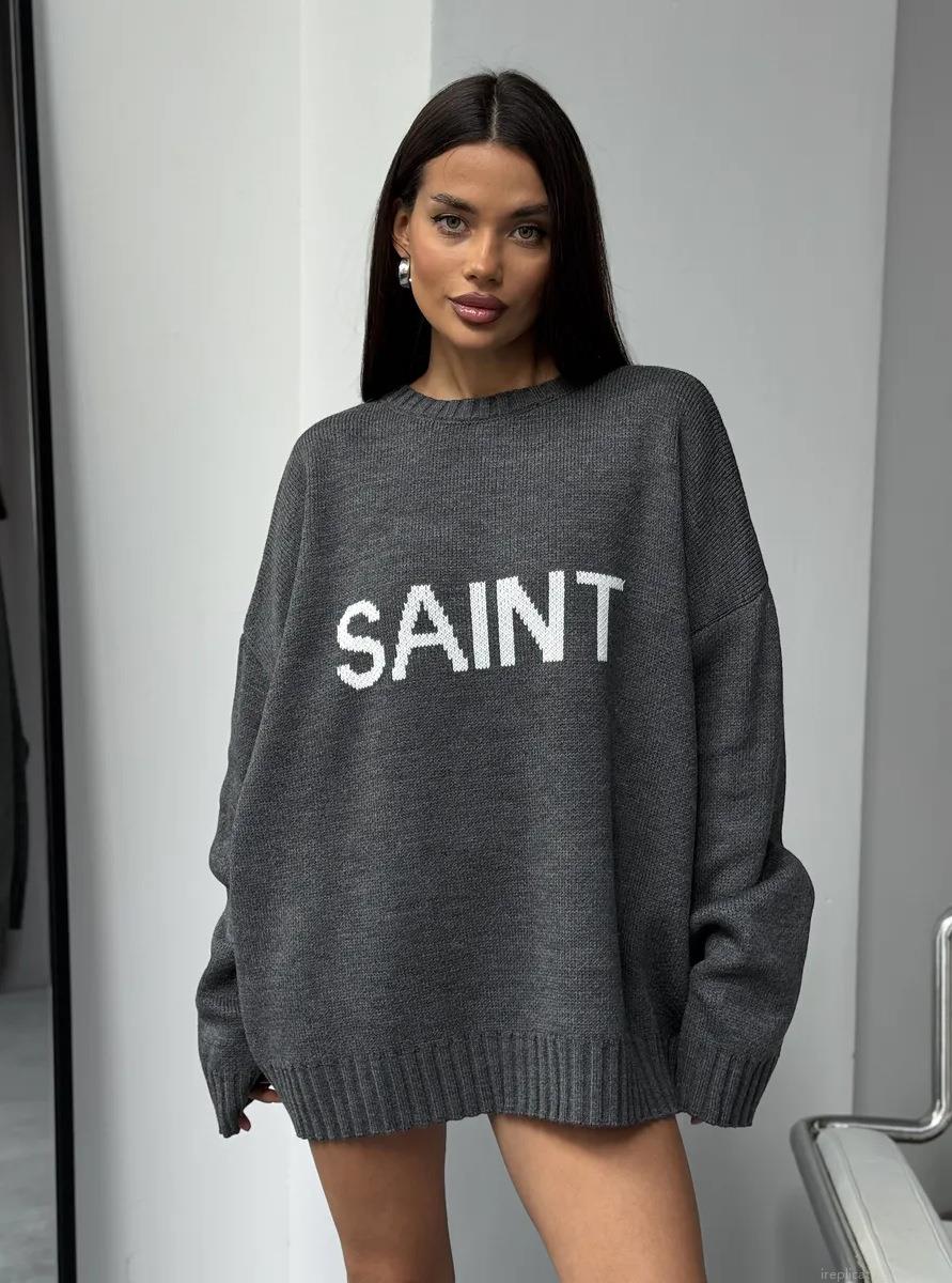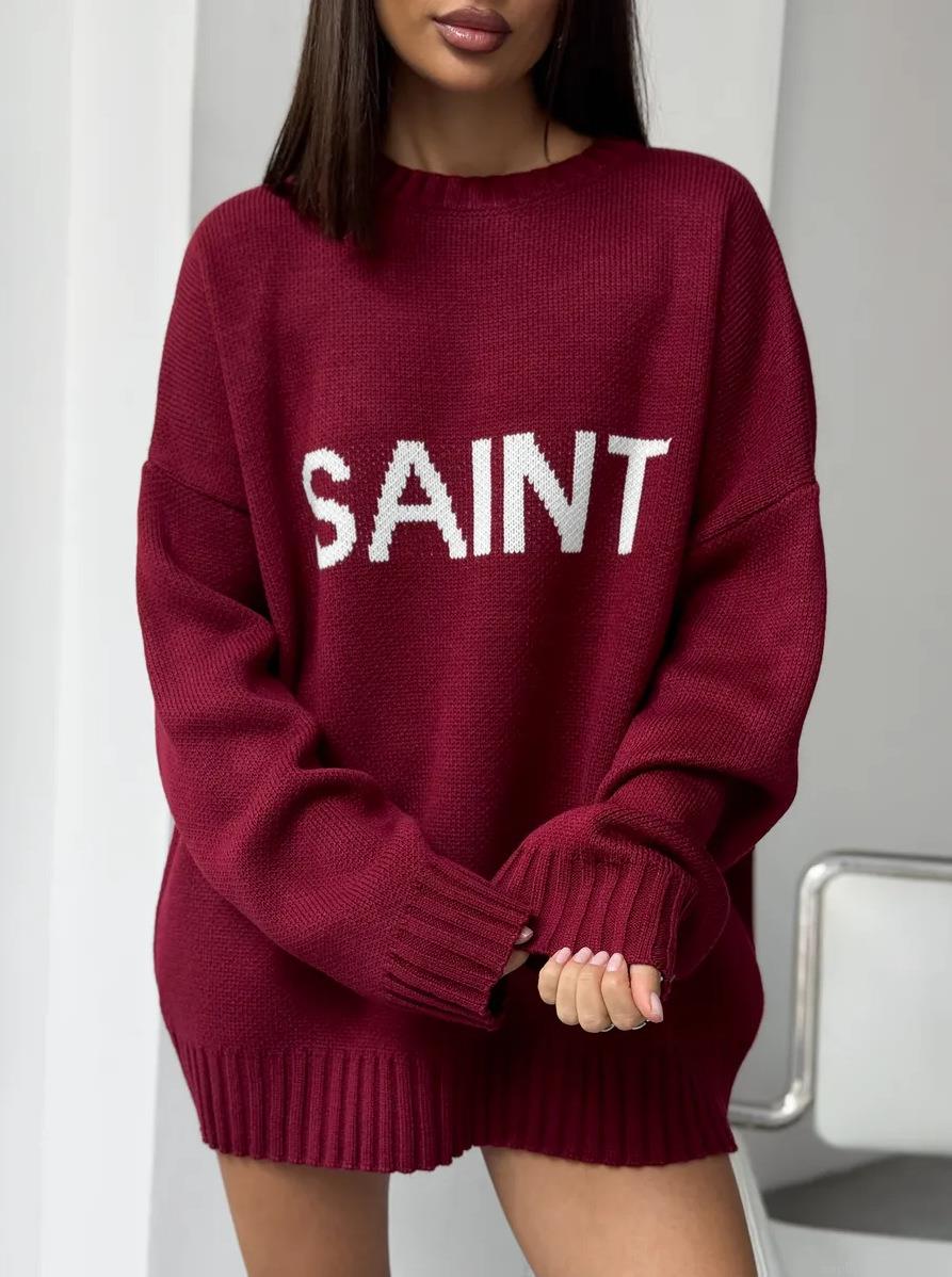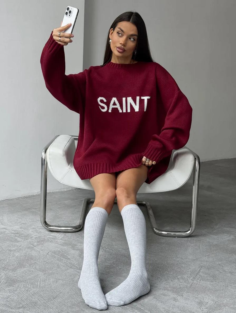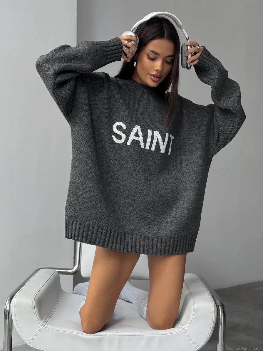 Women's Oversized Knit Sweater Saint Letter Jacquard Crewneck Long Sleeve Cotton Blend Loose Casual Pullover Knitwear Top For Women Autumn Winter