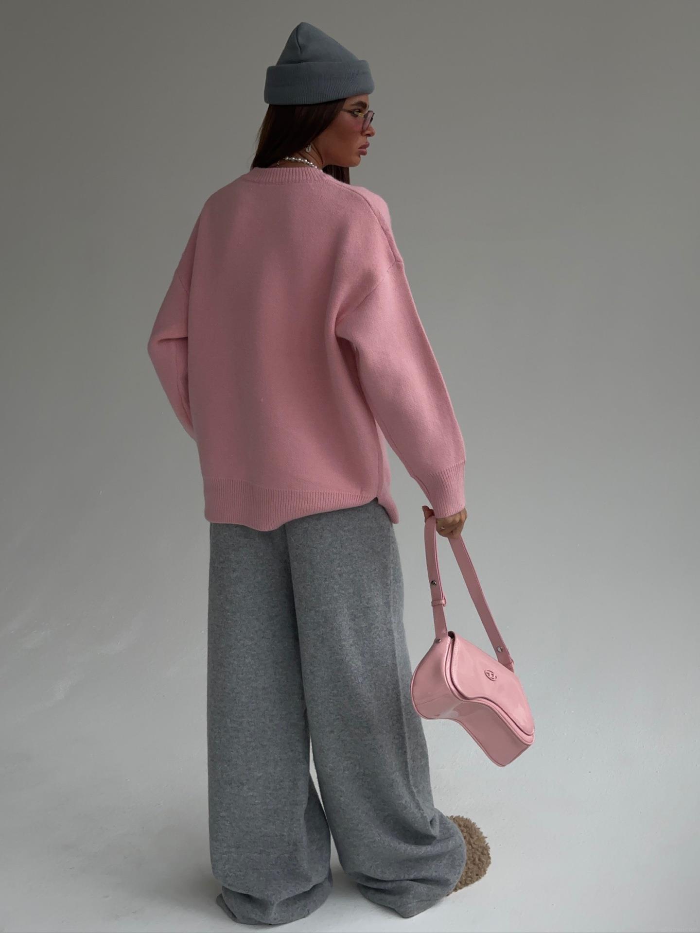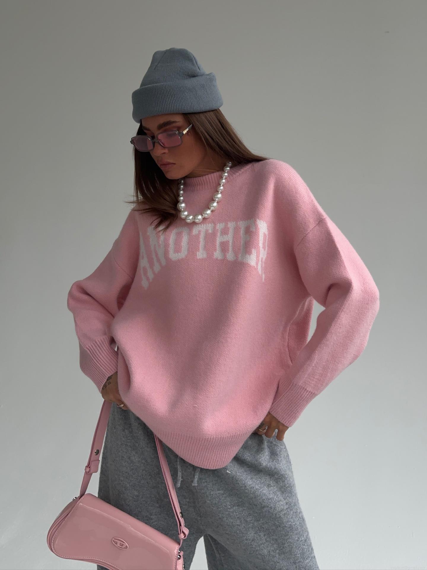 Women's Oversized Pink Knit Sweater Cotton Blend Crew Neck Letter ANOTHER Jacquard Pullover Long Sleeve Casual Autumn Winter Loose Jumper Top