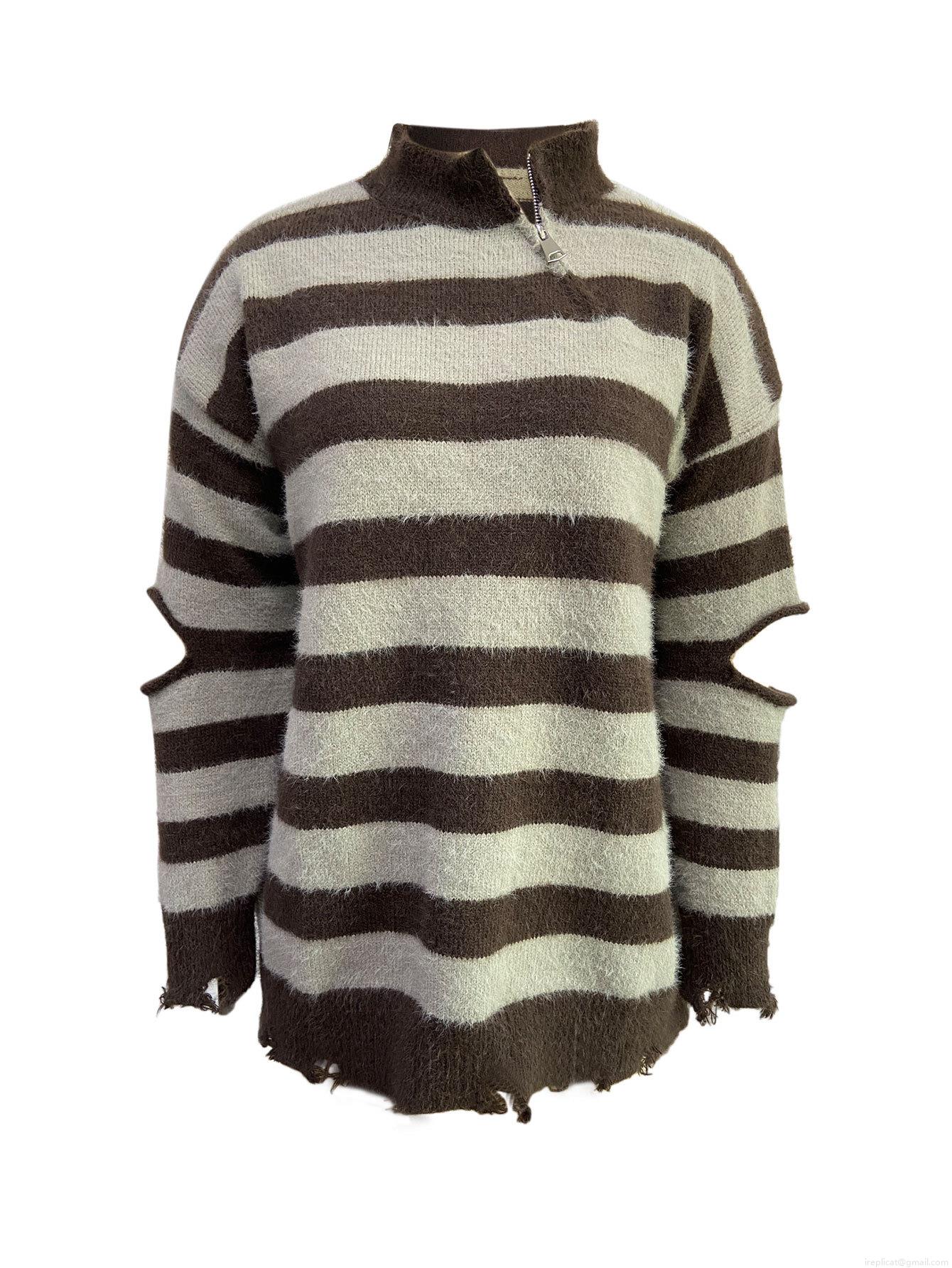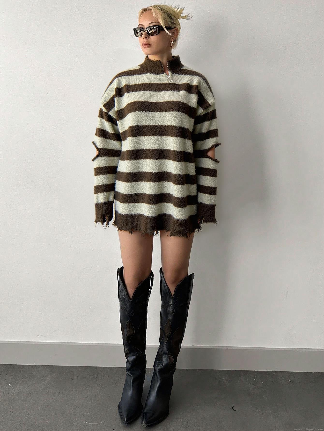 Women's Oversized Striped Knit Sweater 100% Polyester Half Zip Stand Collar Distressed Ripped Hem Cutout Elbow Long Sleeve Mid-Length Pullover Top