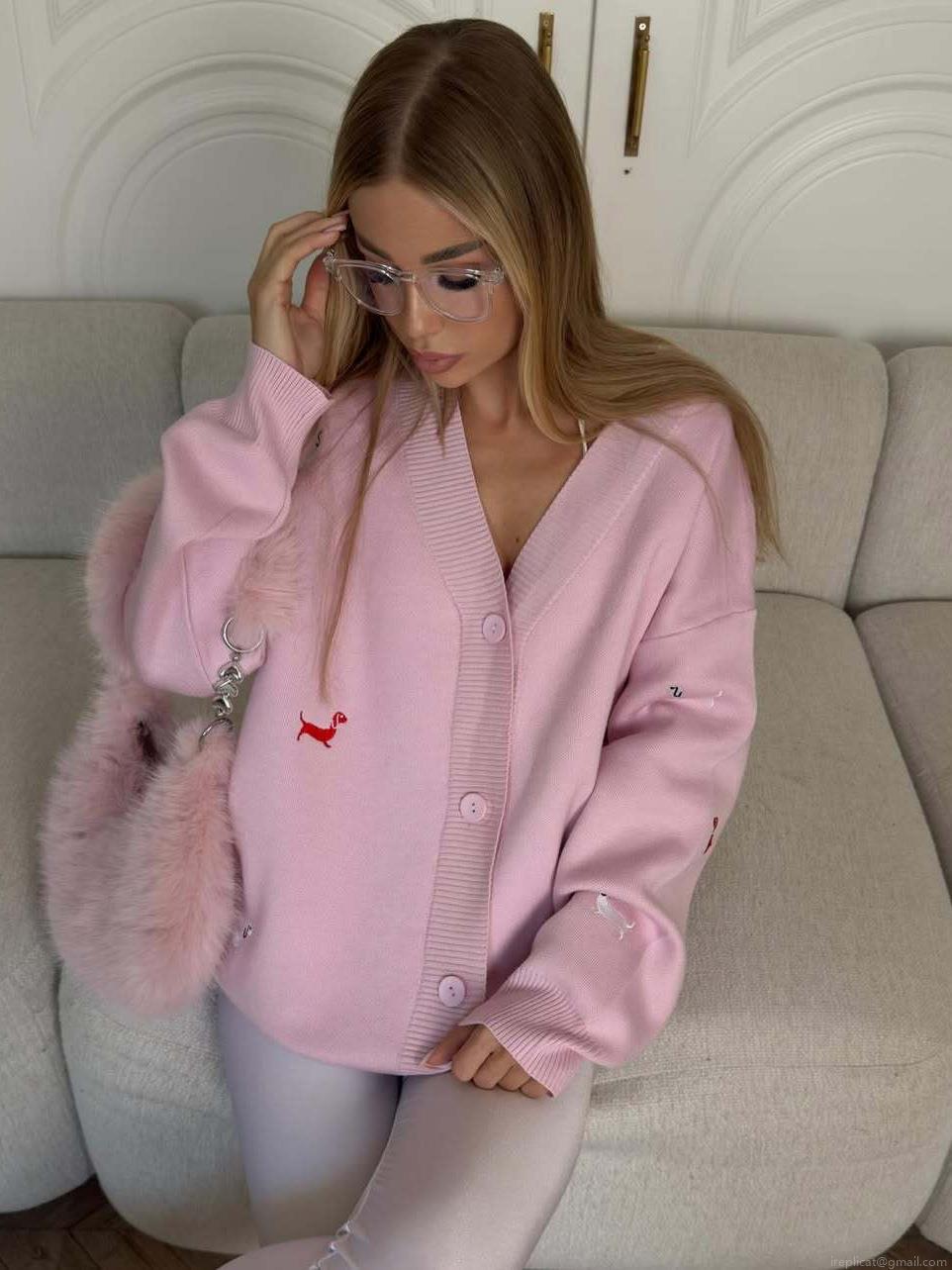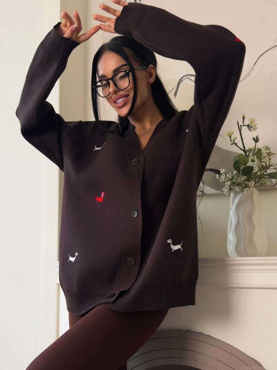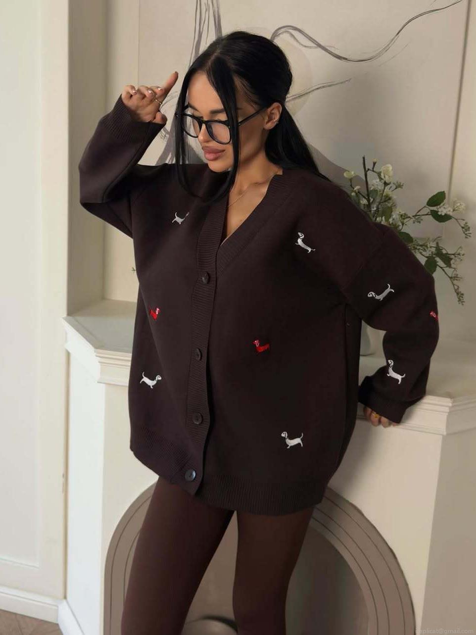 Women's Oversized V-Neck Knit Cardigan Sweater Cotton Blend Dachshund Embroidery Long Sleeve Button Up Outerwear Loose Fit Soft Knitwear For Fall Winter Casual Daily Wear