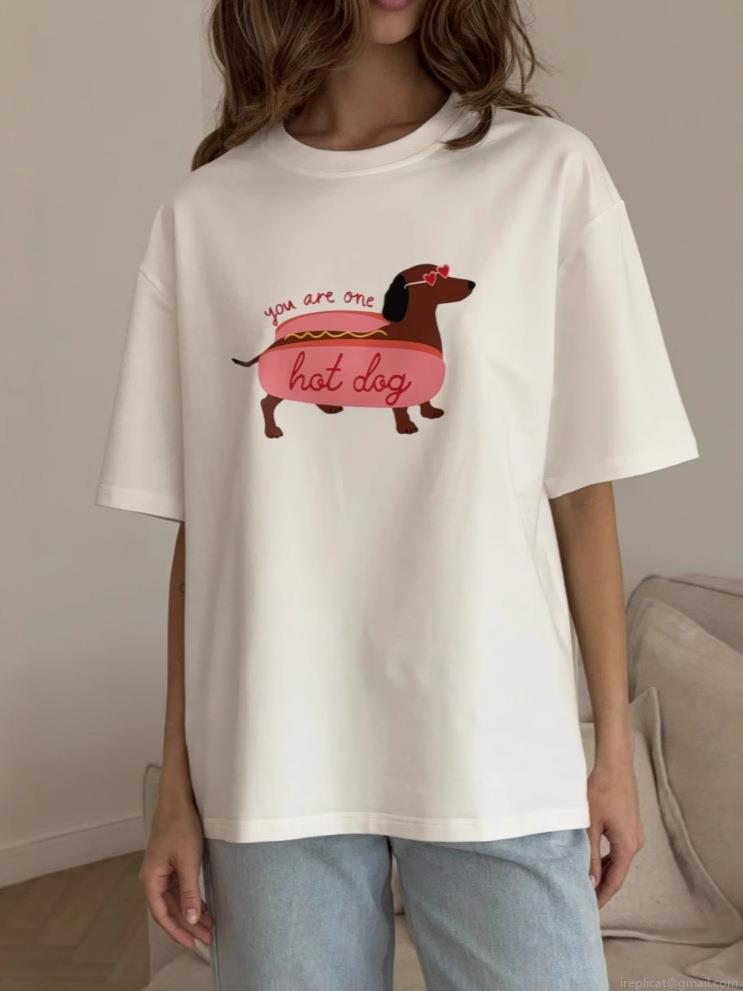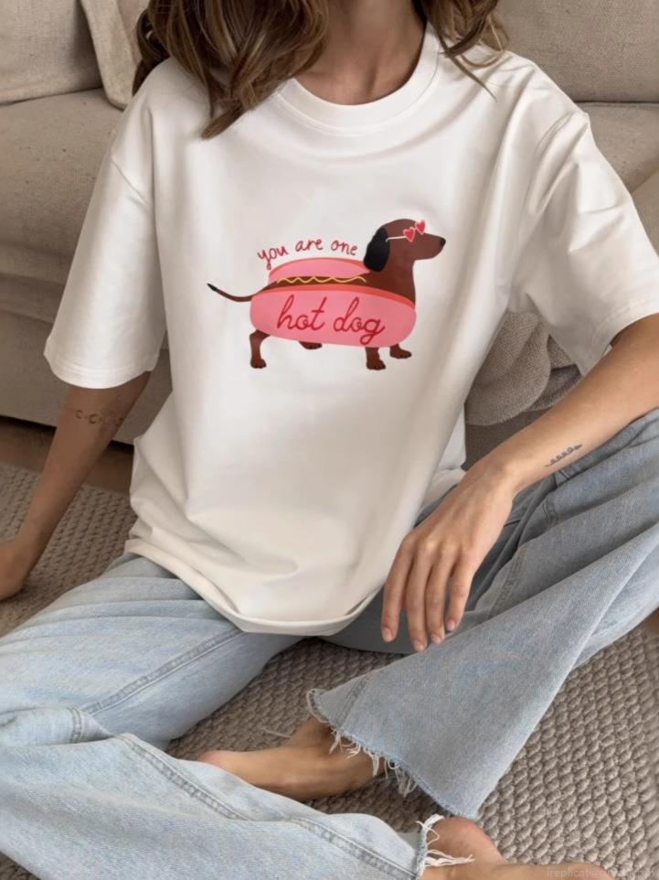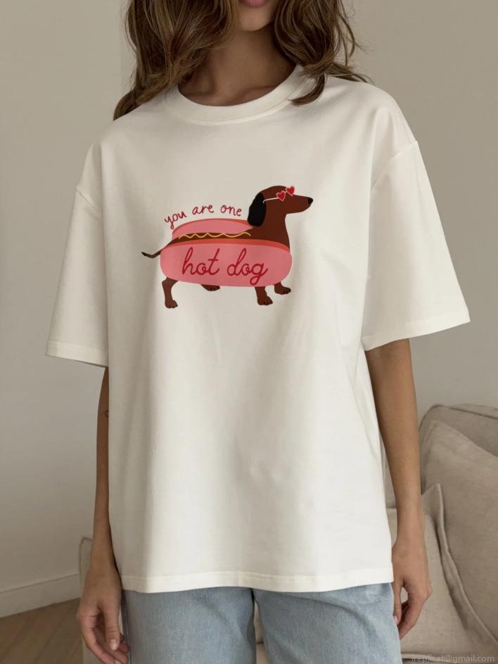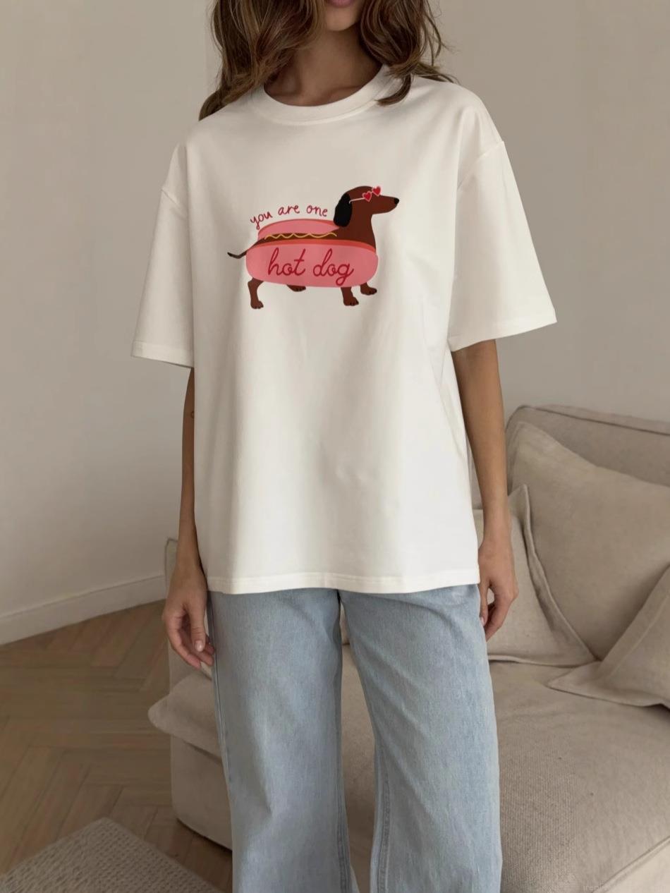 Women's Oversized White Cotton T-Shirt Funny Cute Cartoon Dachshund Hot Dog Print Short Sleeve Crewneck Loose Summer Graphic Tee Top for Women