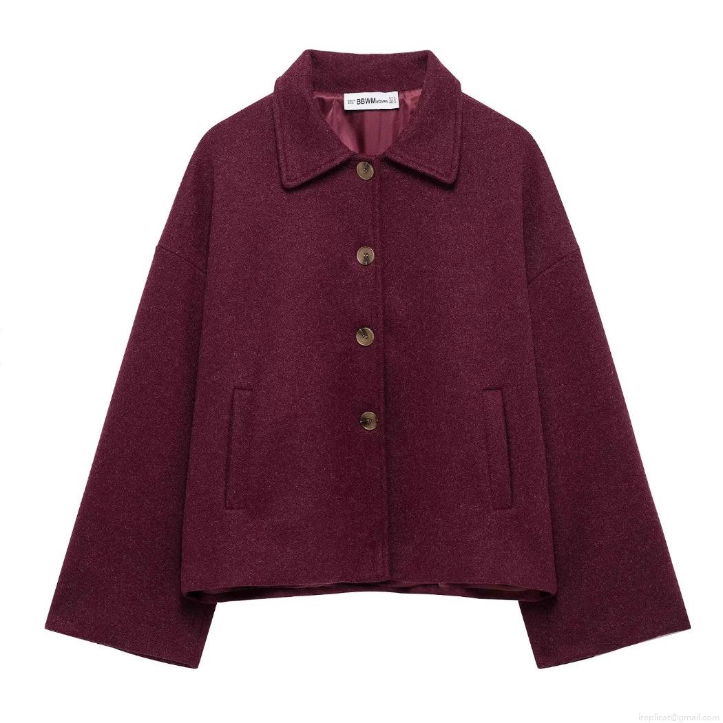 Women's Oversized Woolen Jacket Casual Lapel Button Down Cropped Coat Solid Color Long Sleeve Outwear For Autumn Winter