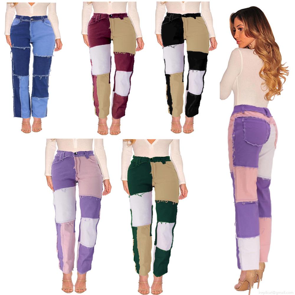 Women's Patchwork High Waist Jeans Distressed Color Block Straight Leg Denim Pants Cotton Blend Frayed Edge Trousers Streetwear Casual Multi Color Jean