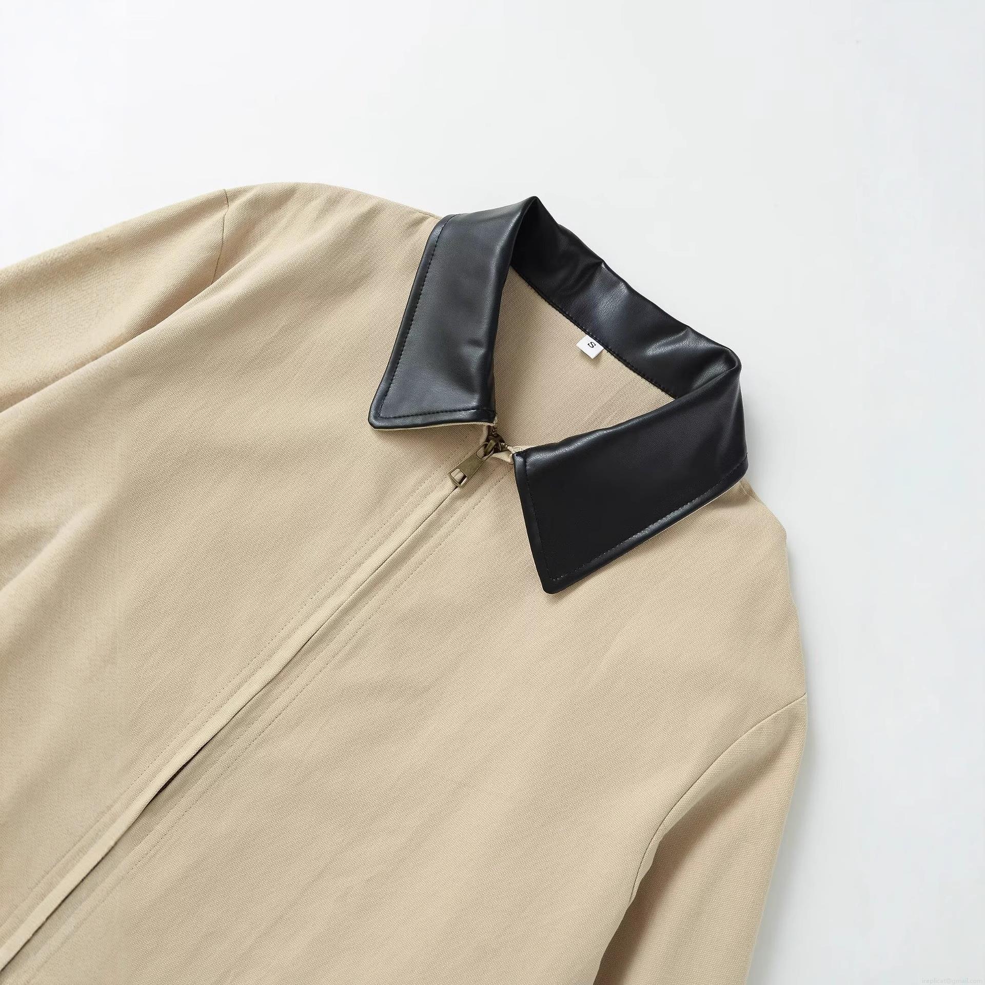 Women's Patchwork Jacket With PU Leather Lapel Collar Polyester Long Sleeve Loose Casual Zipper Outwear Streetwear Spring Autumn Clothes